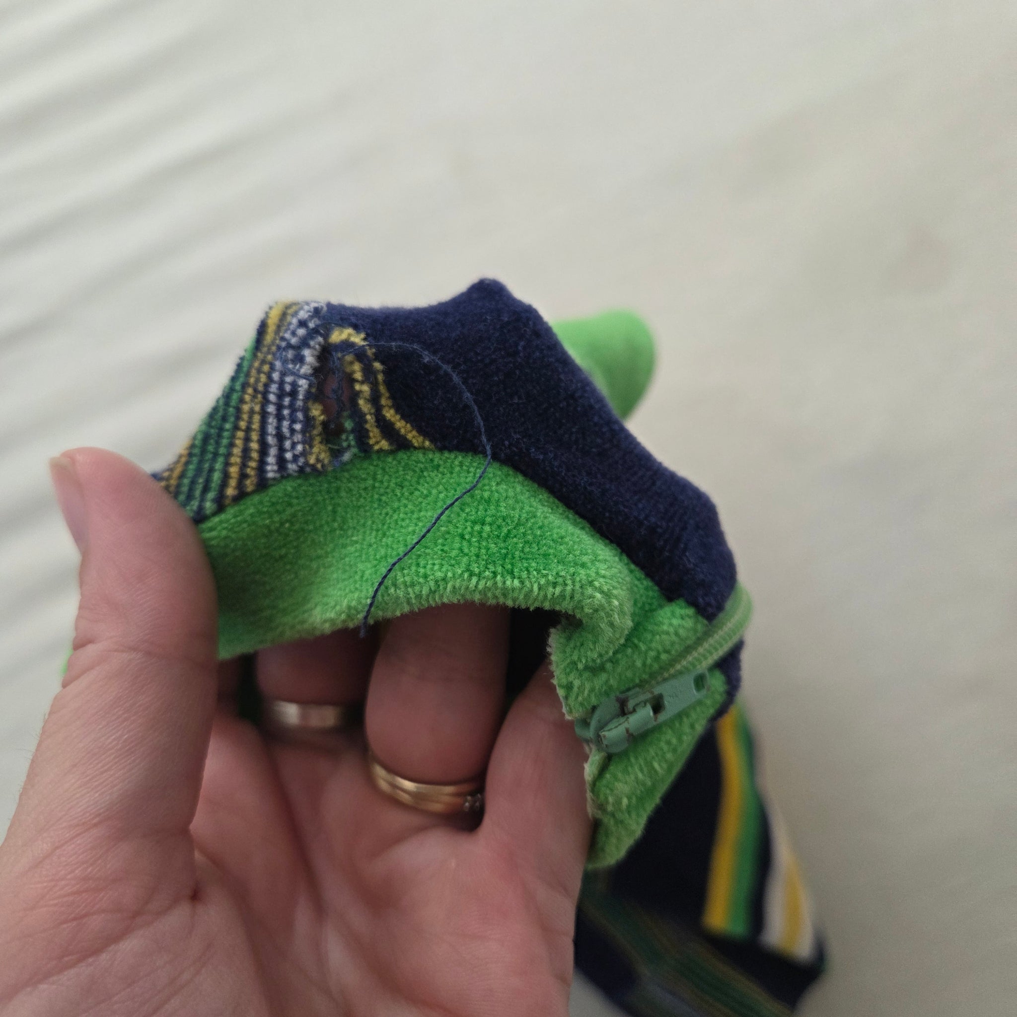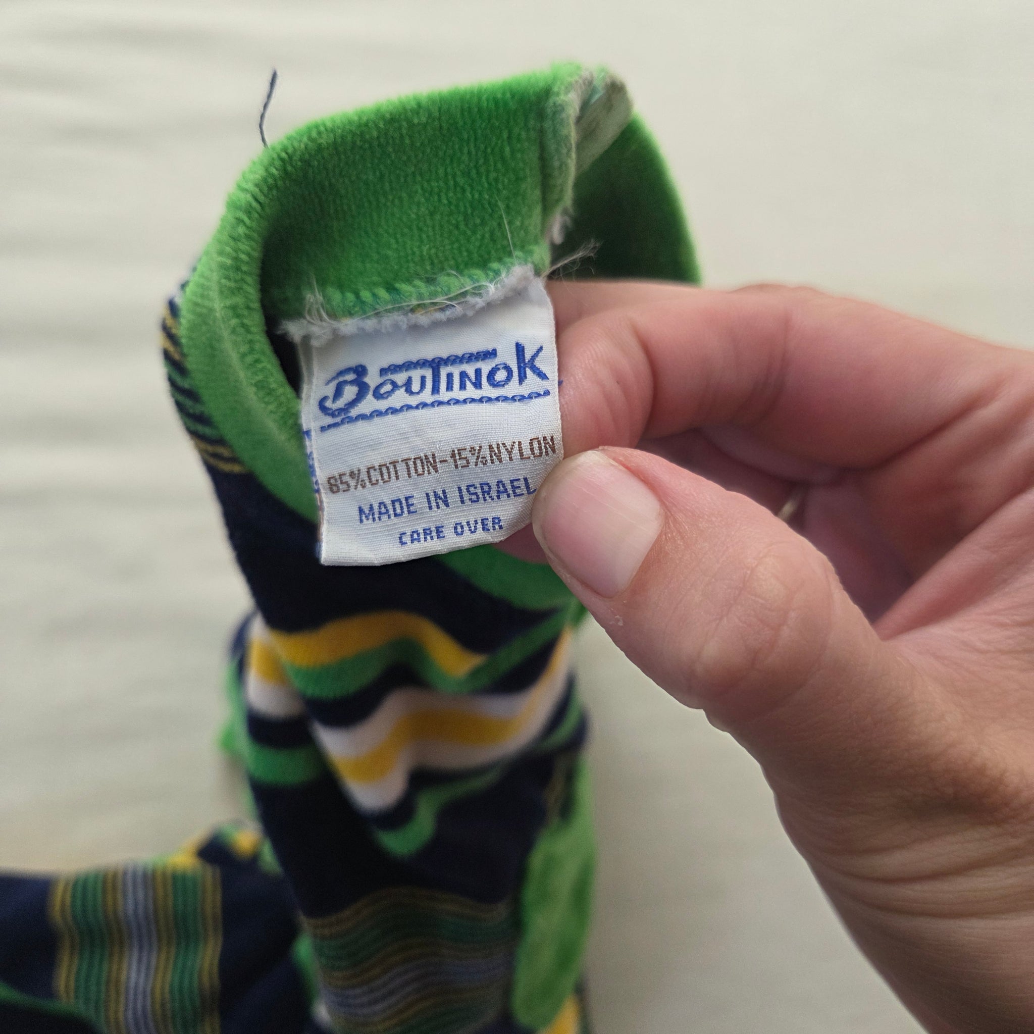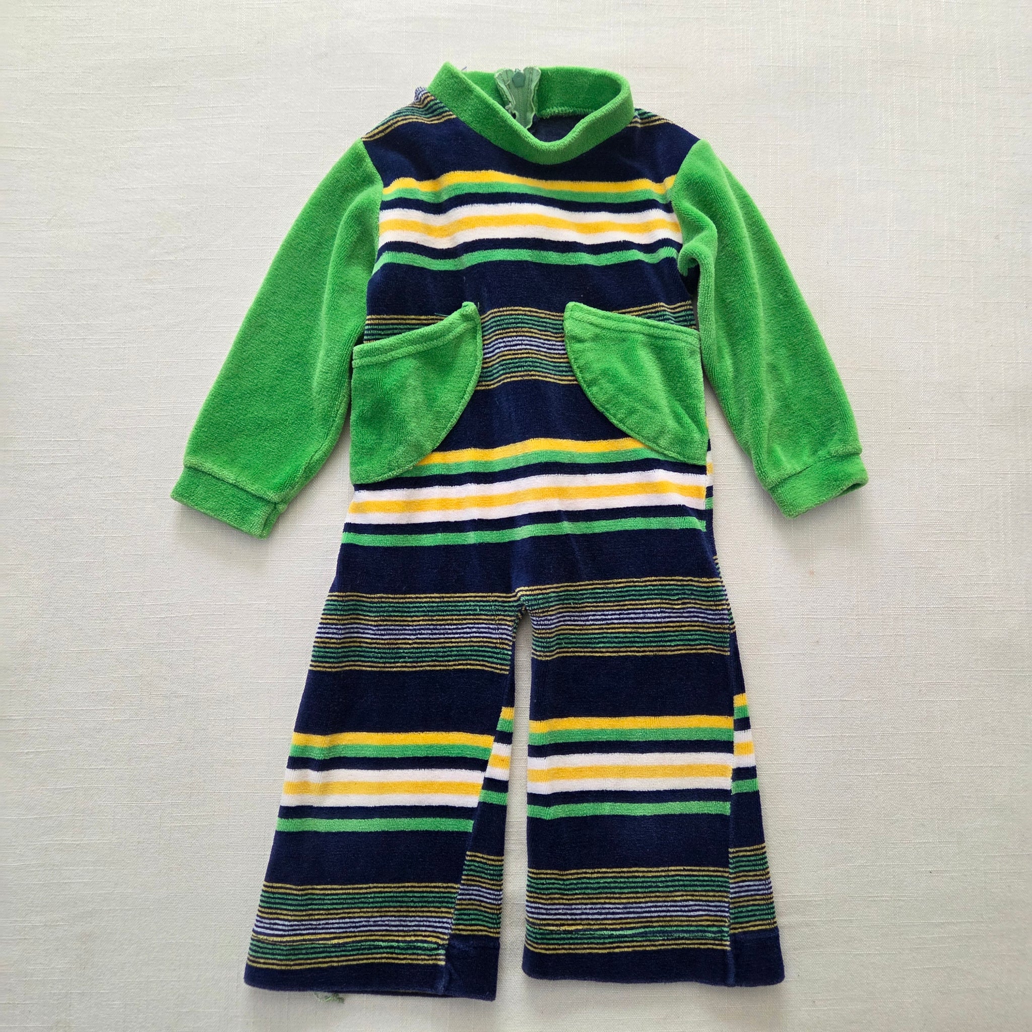 Vintage Boutinok brand navy blue, green, and yellow striped soft velour bodysuit with wide legs! Please see all photos for condition and measurements
