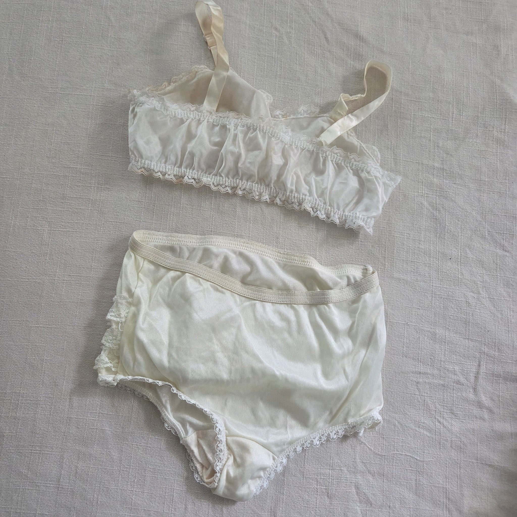 Vintage bundle of Her Majesty cream bralette and ruffle bum cream underwear! Not some faint spots on bralette and elastic is somewhat loose on underwear. Please see all photos for condition and measurements
