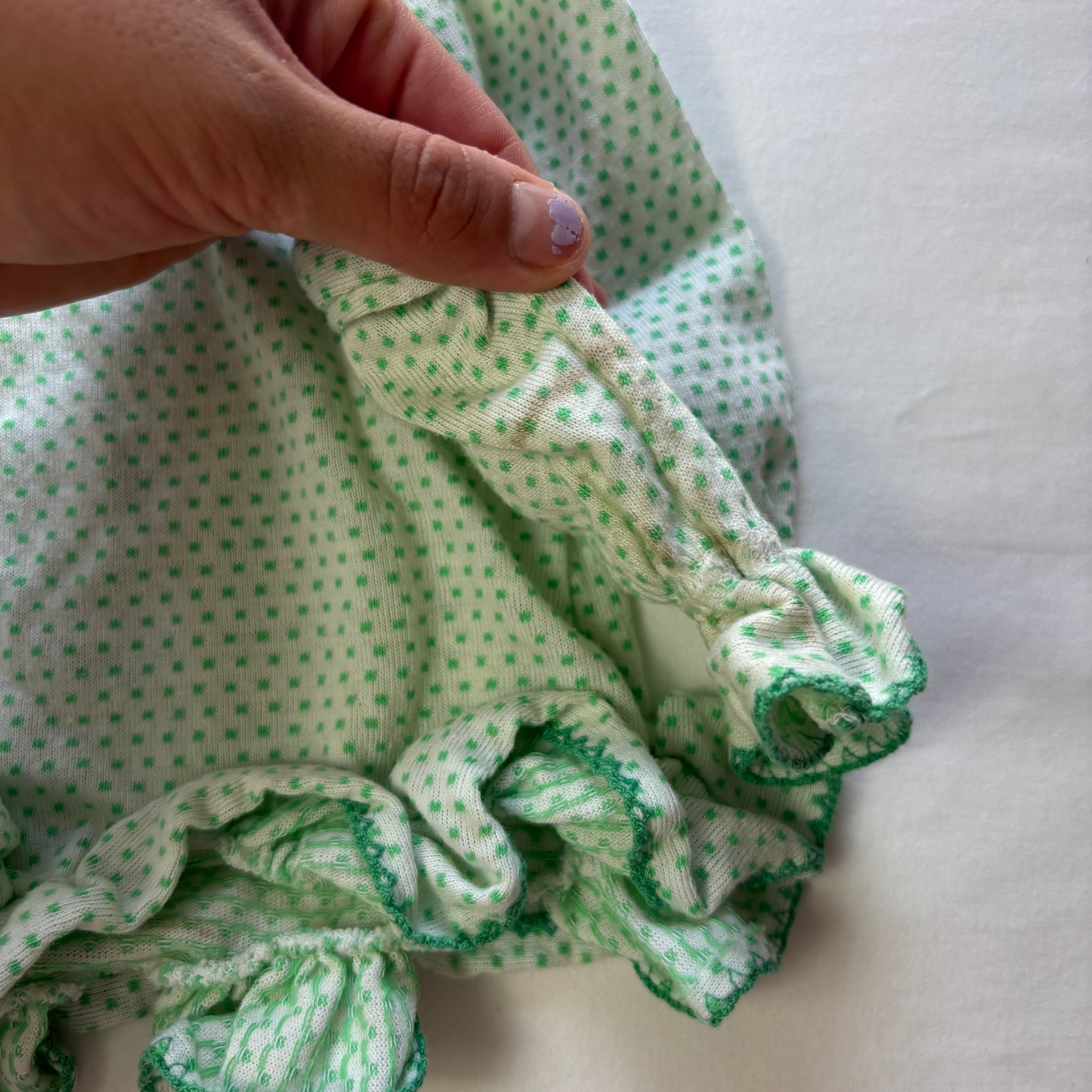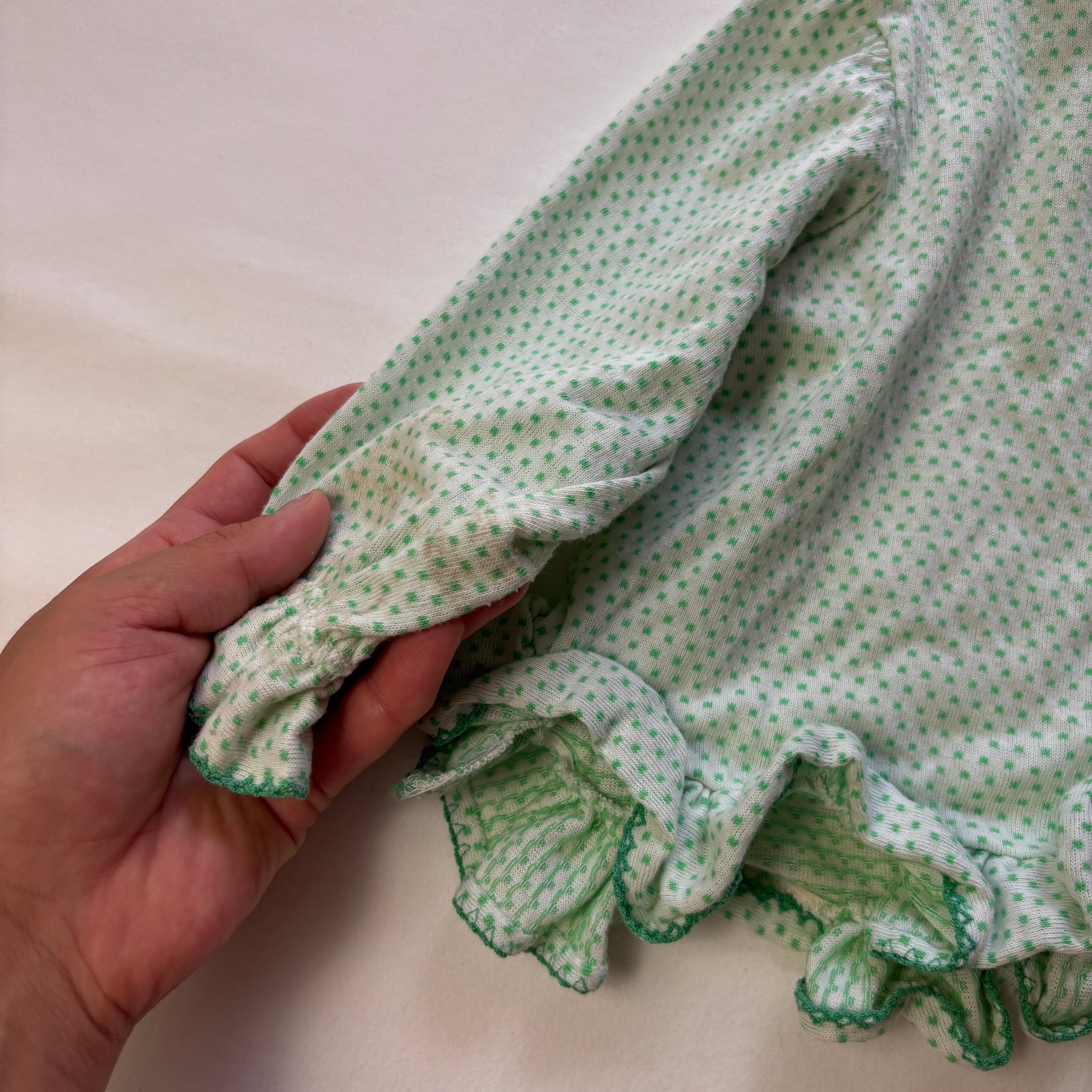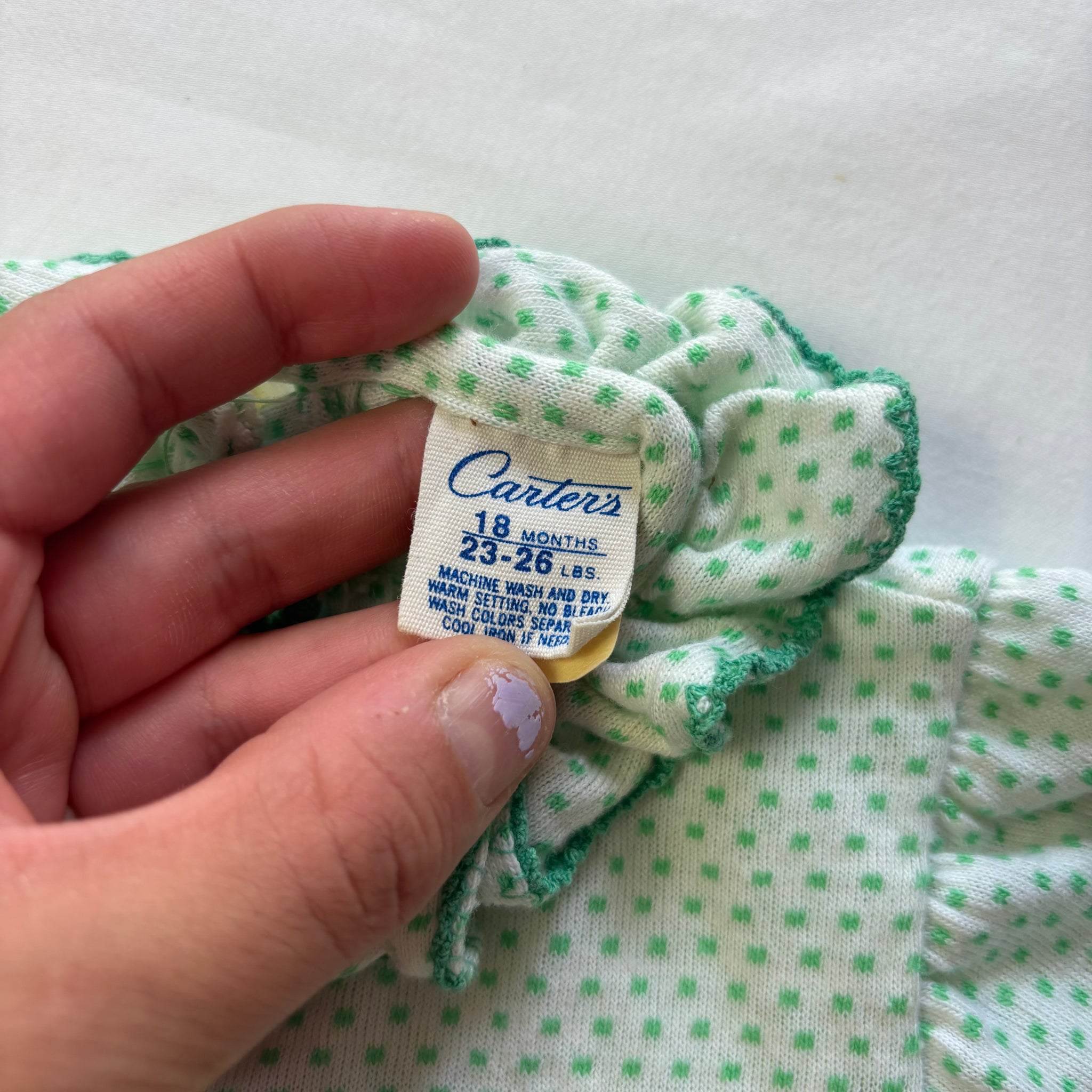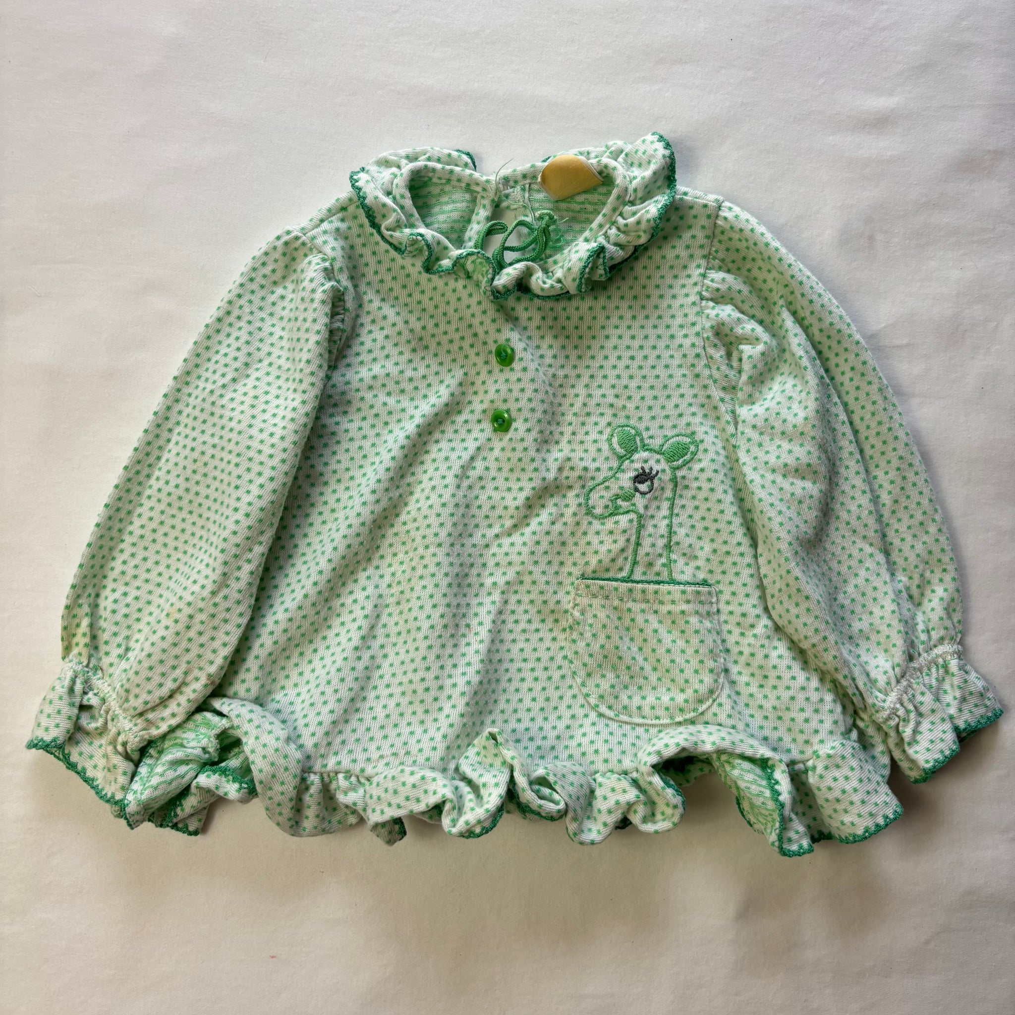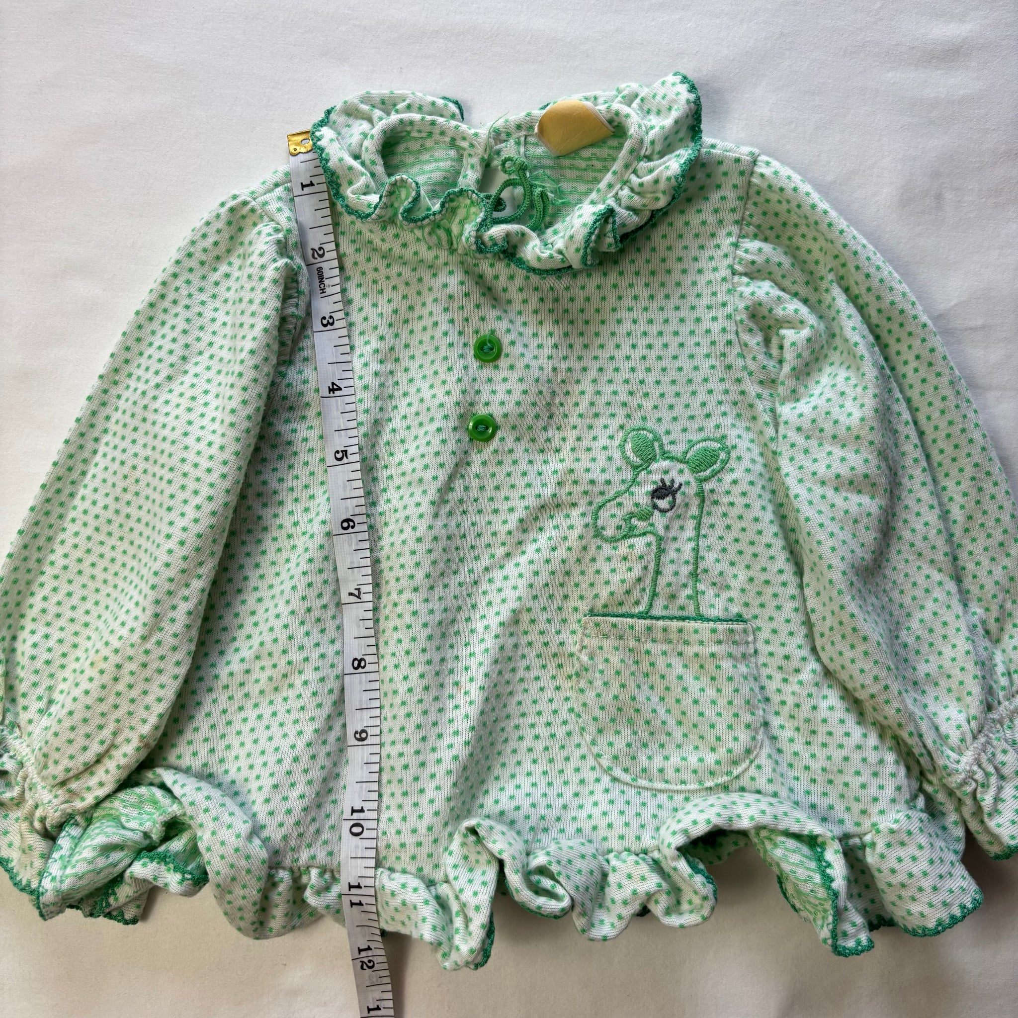 Vintage 70s era Carters brand green dotted long sleeve shirt with giraffe embroidery on pocket and ruffled trim! Note some spots on both wrists shown, untreated by me. Please see all photos for condition and measurements