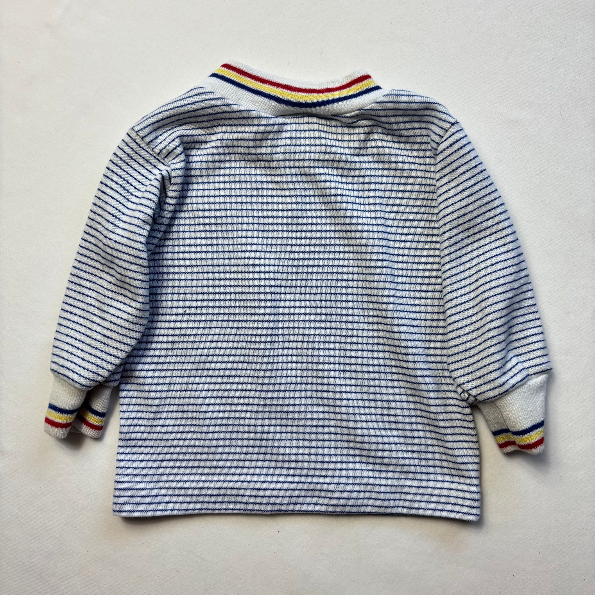 Vintage Healthtex thin blue striped long sleeve shirt with colorful ringer neck and wrist cuffs! Please see all photos for condition and measurements