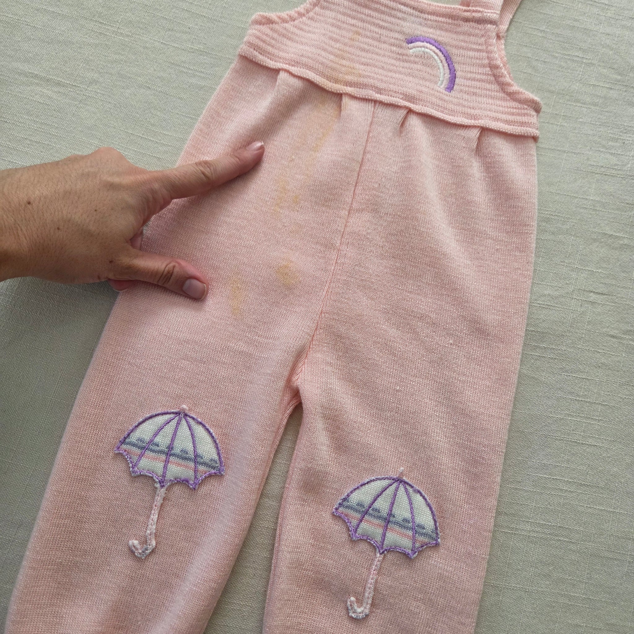 Vintage Friemanit brand pink knit overalls with umbrellas embroidery on knees and rainbow on chest! Note some faint spots on belly shown. Please see all photos for condition and measurements