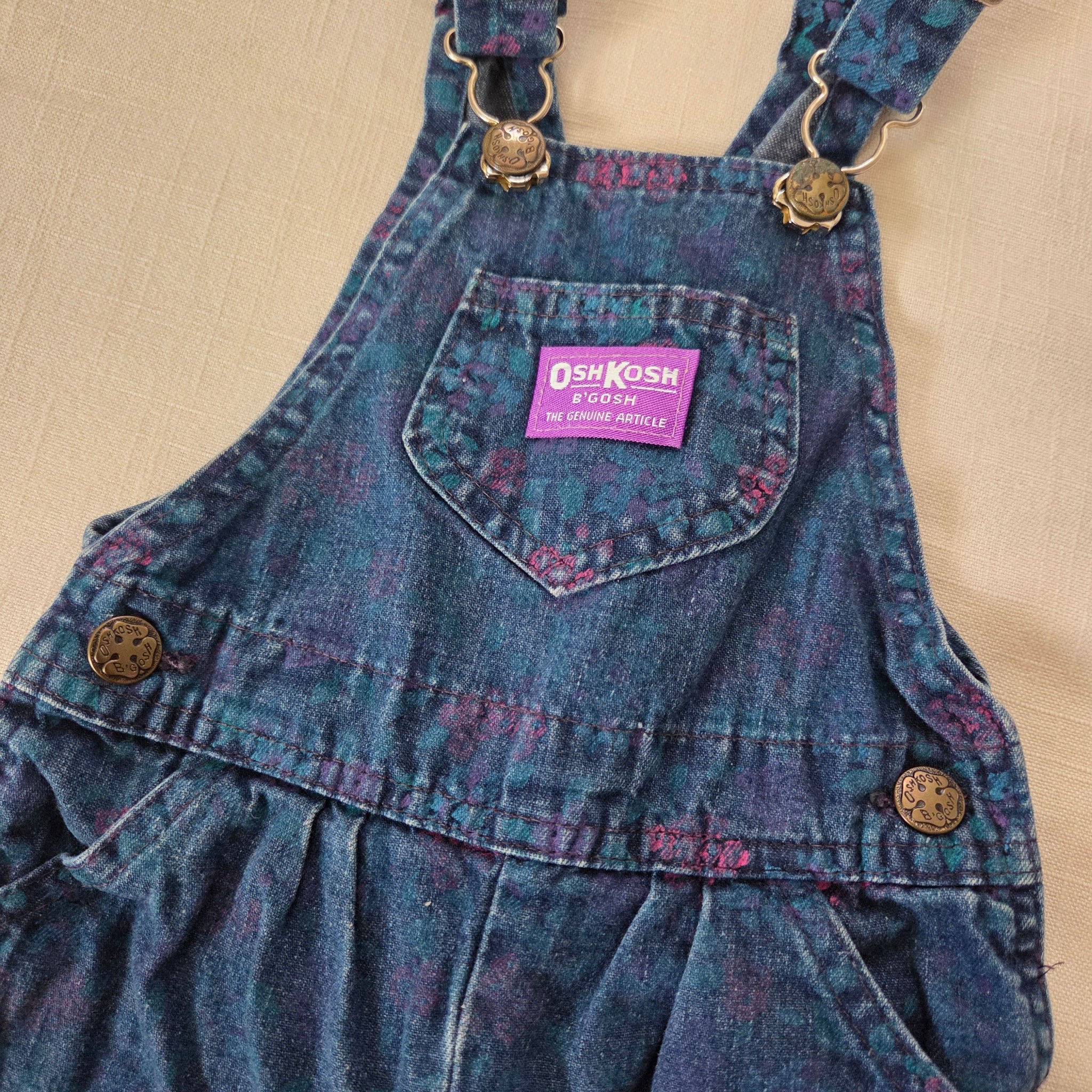 Vintage Oshkosh dark wash denim overalls with floral print! Note fading to floral. Please see all photos for condition and measurements