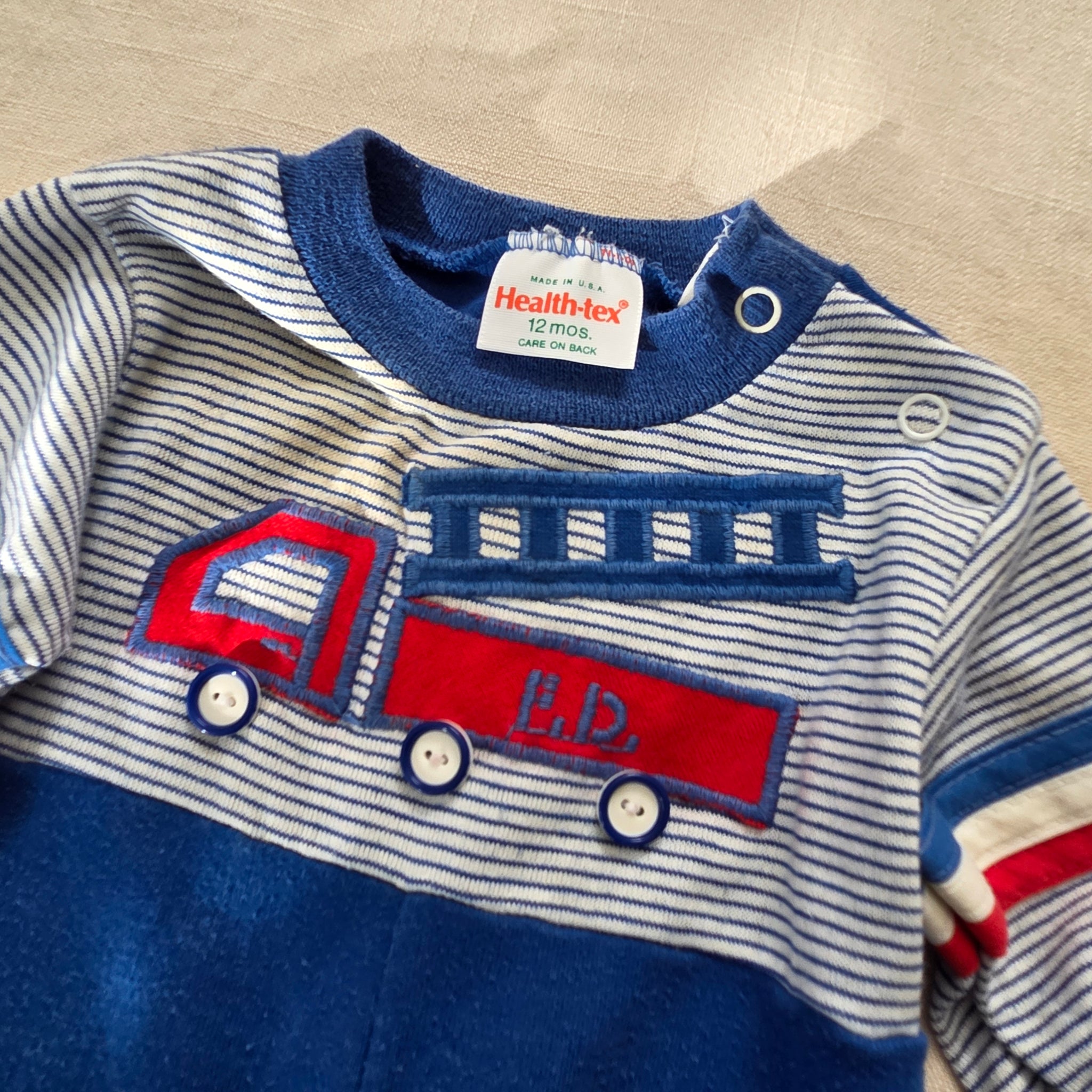 Vintage Healthtex 80s era blue and striped bodysuit with fire truck applique on chest and cute buttons for wheels! Note a small yellow spot on chest shown. Please see all photos for condition and measurements