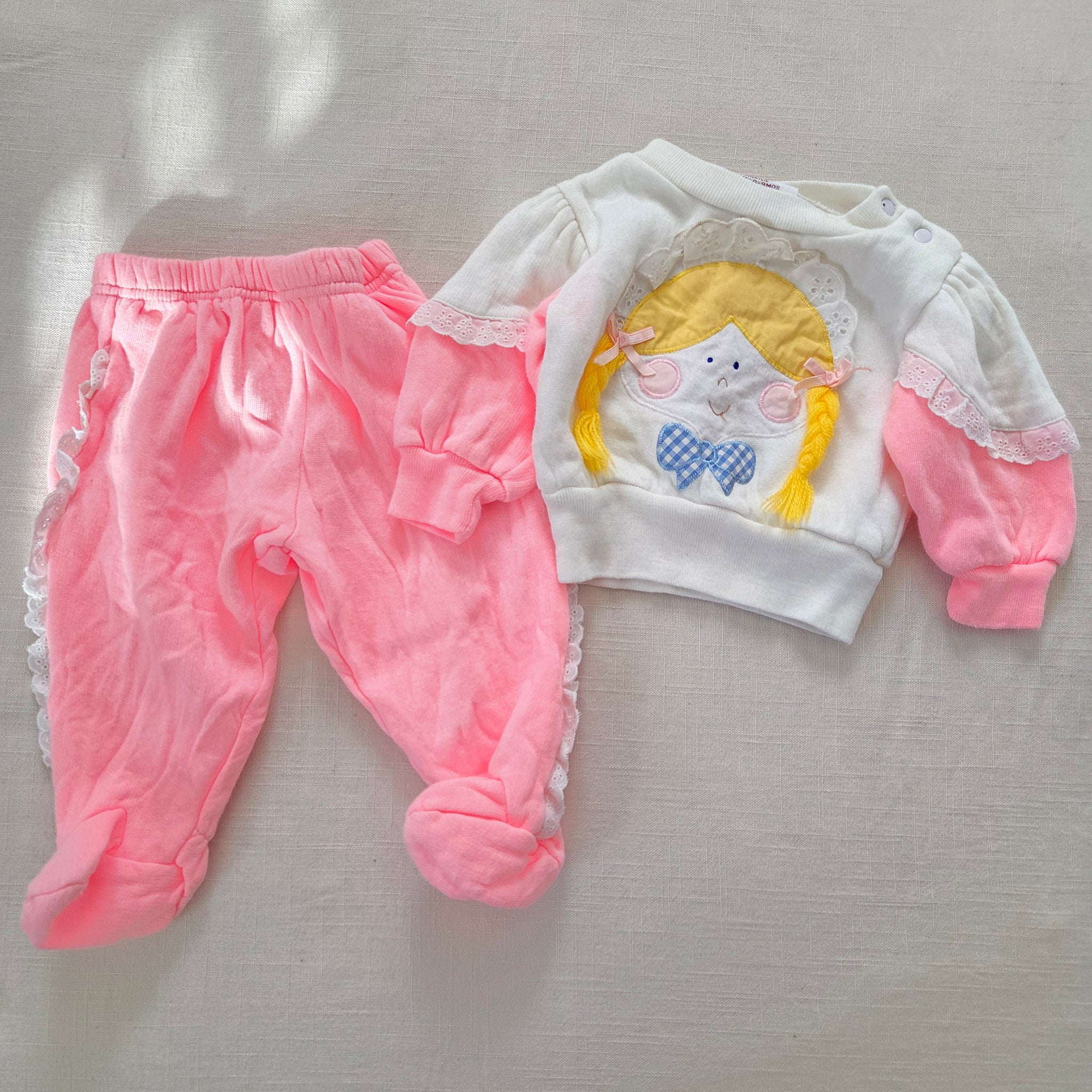 Vintage pink and white matching set with lace ruffle, blonde girl applique on chest, and footed feet on pants with stretchy elastic waist! Please see all photos for condition and measurements