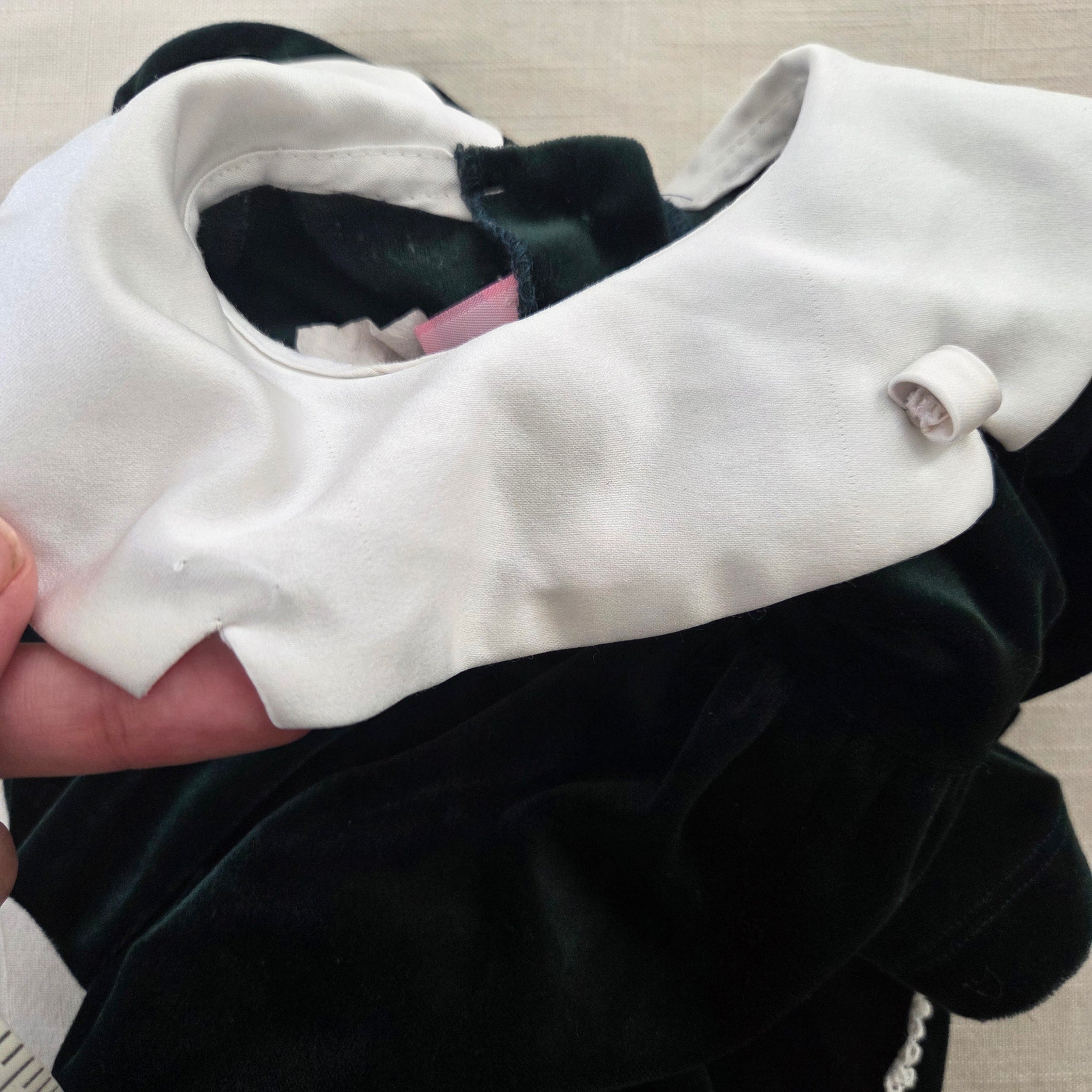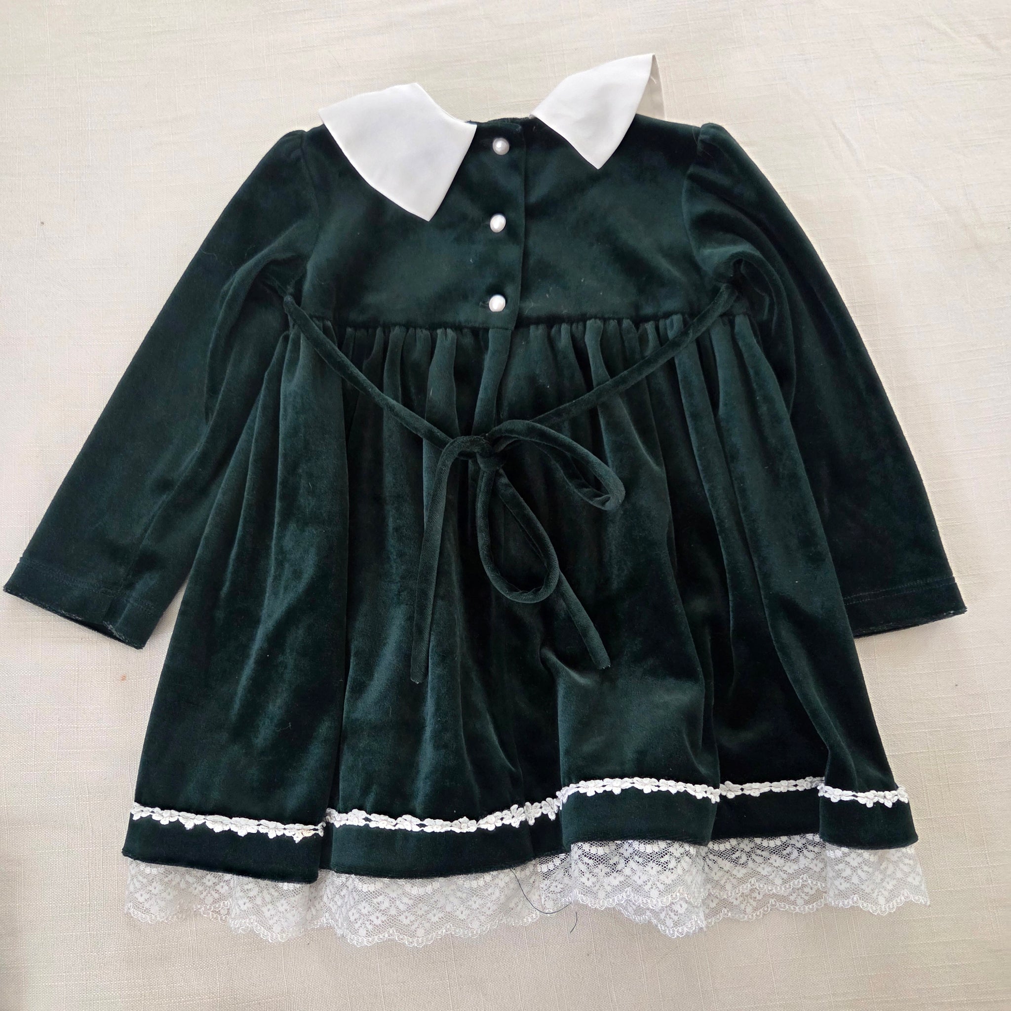 Vintage Jinelle brand dark green velvet long sleeve dress with bib and lace trim! Note little loop missing on collar, not sure what was once there. Please see all photos for condition and measurements