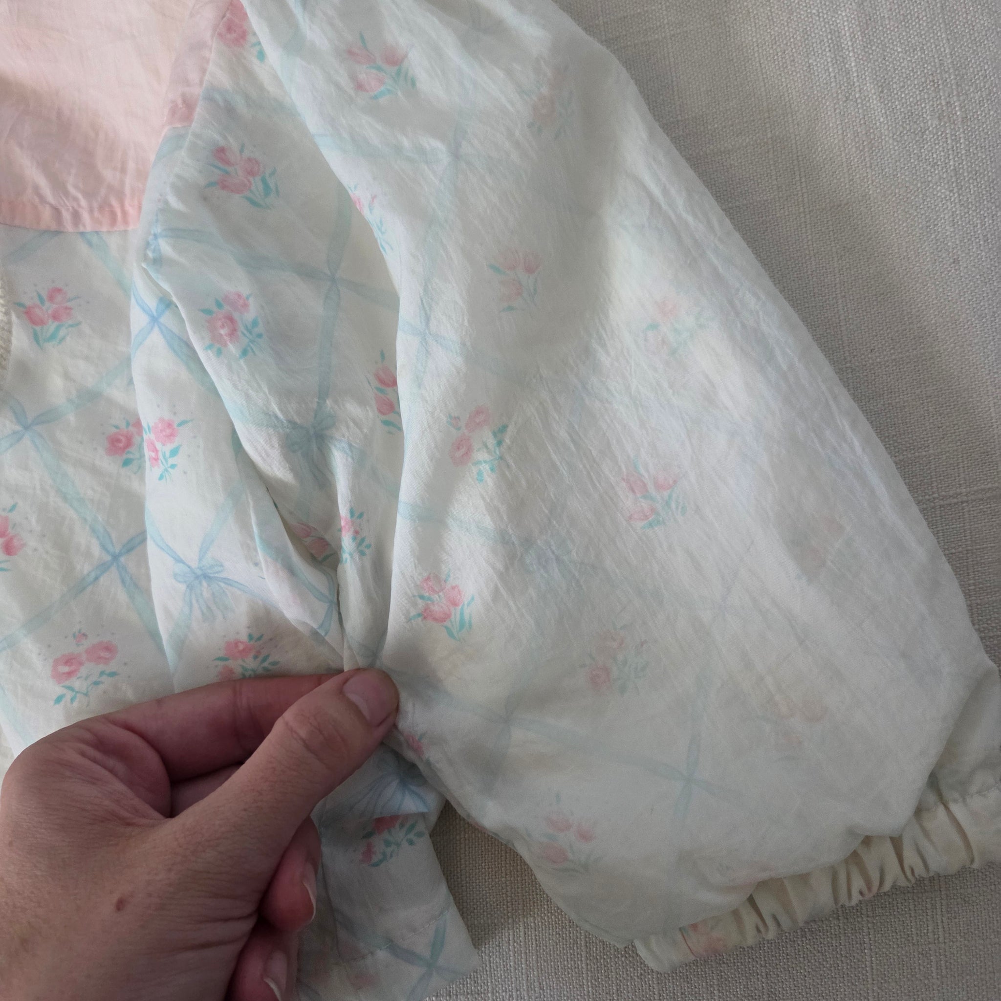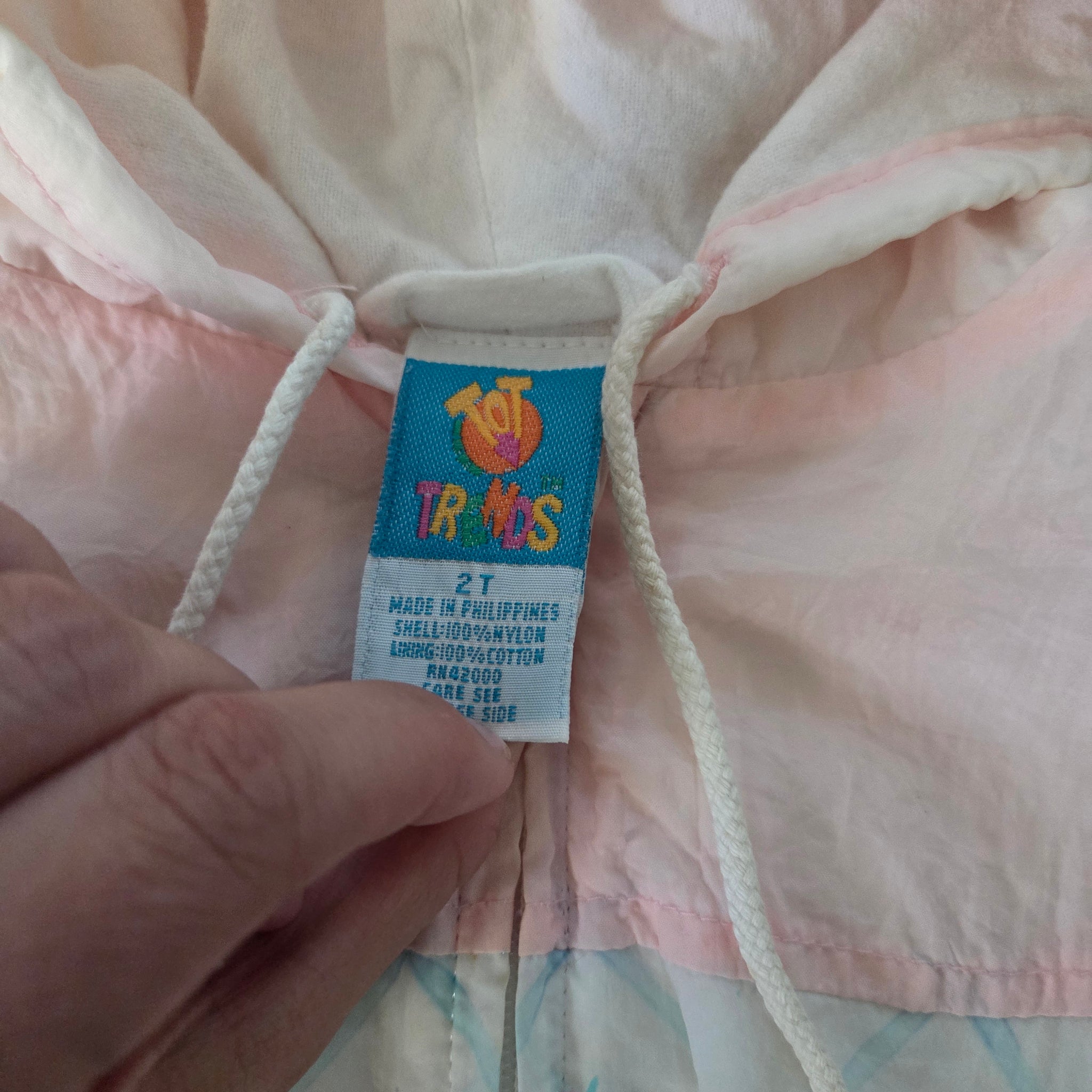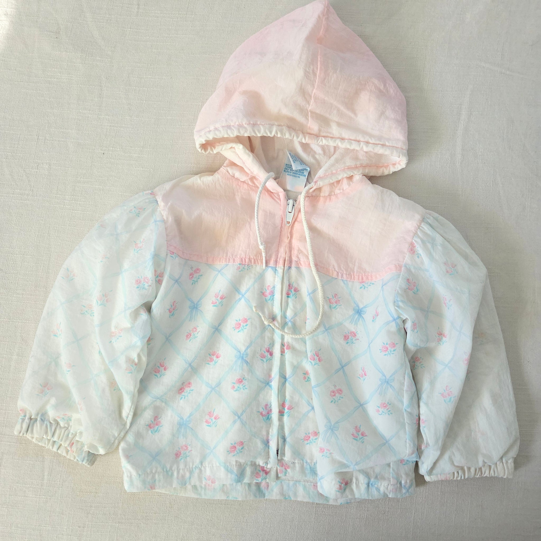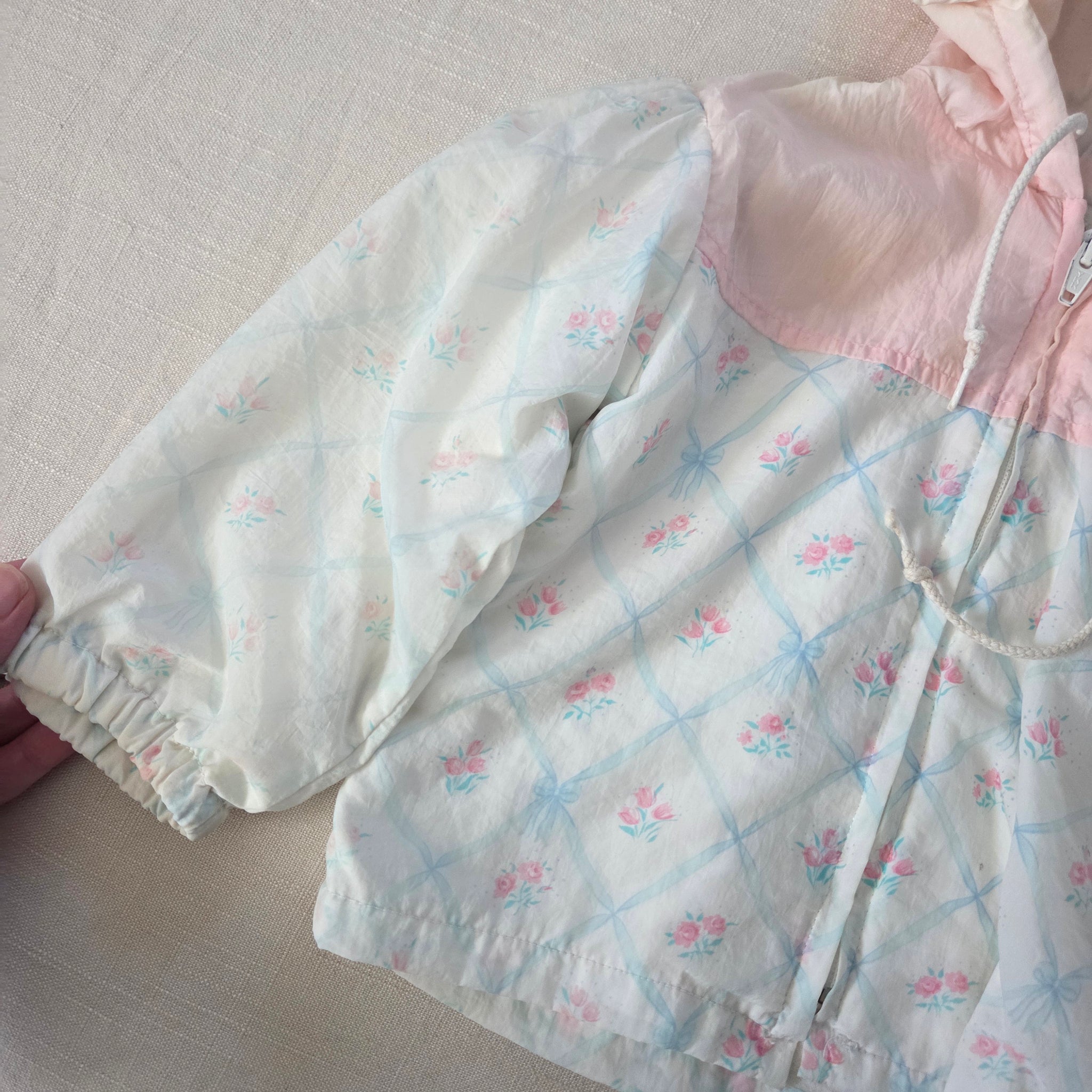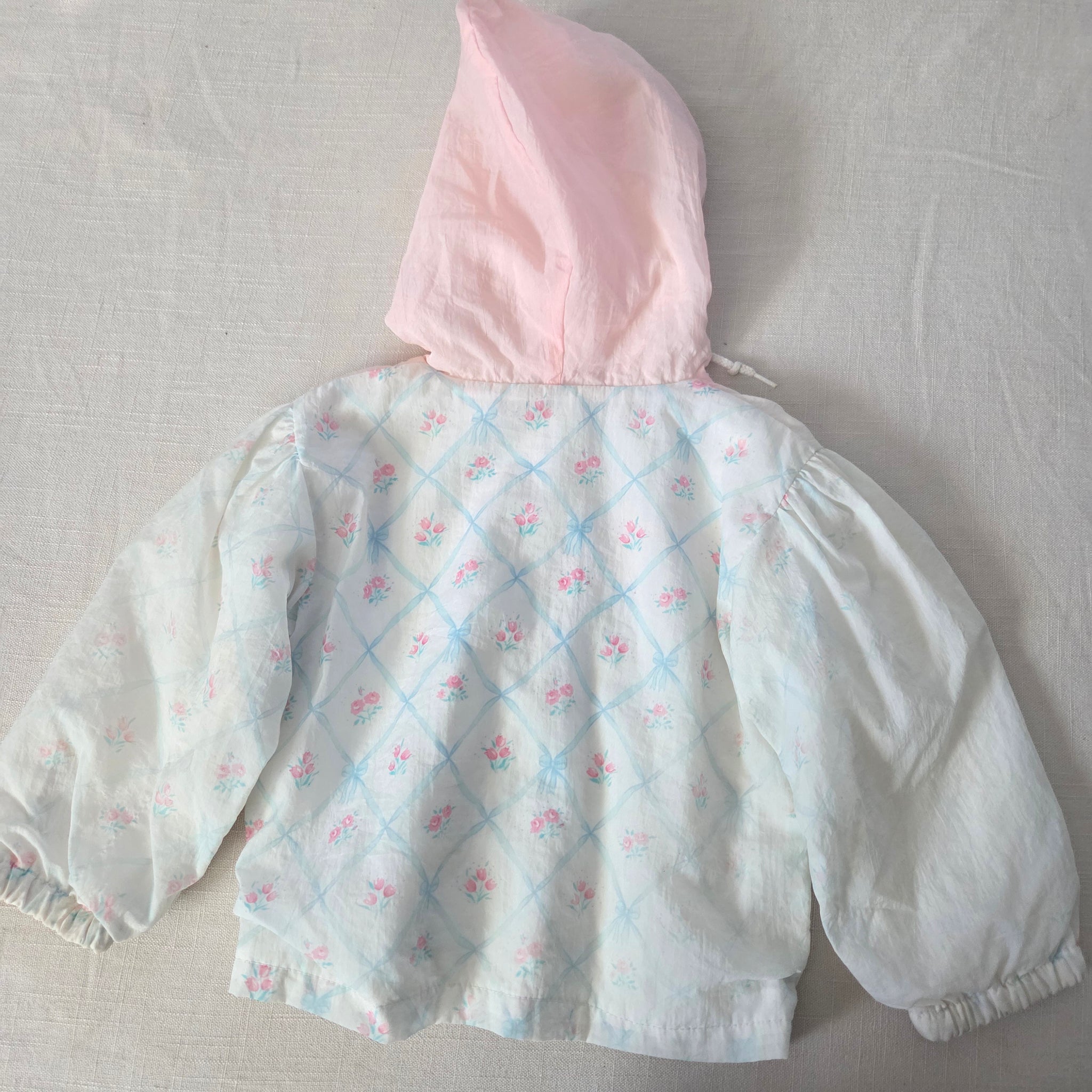 Vintage Tot Trends brand white and pink ribbon and floral + bows pattern hooded jacket! Note fade to sleeves shown. Please see all photos for condition and measurements