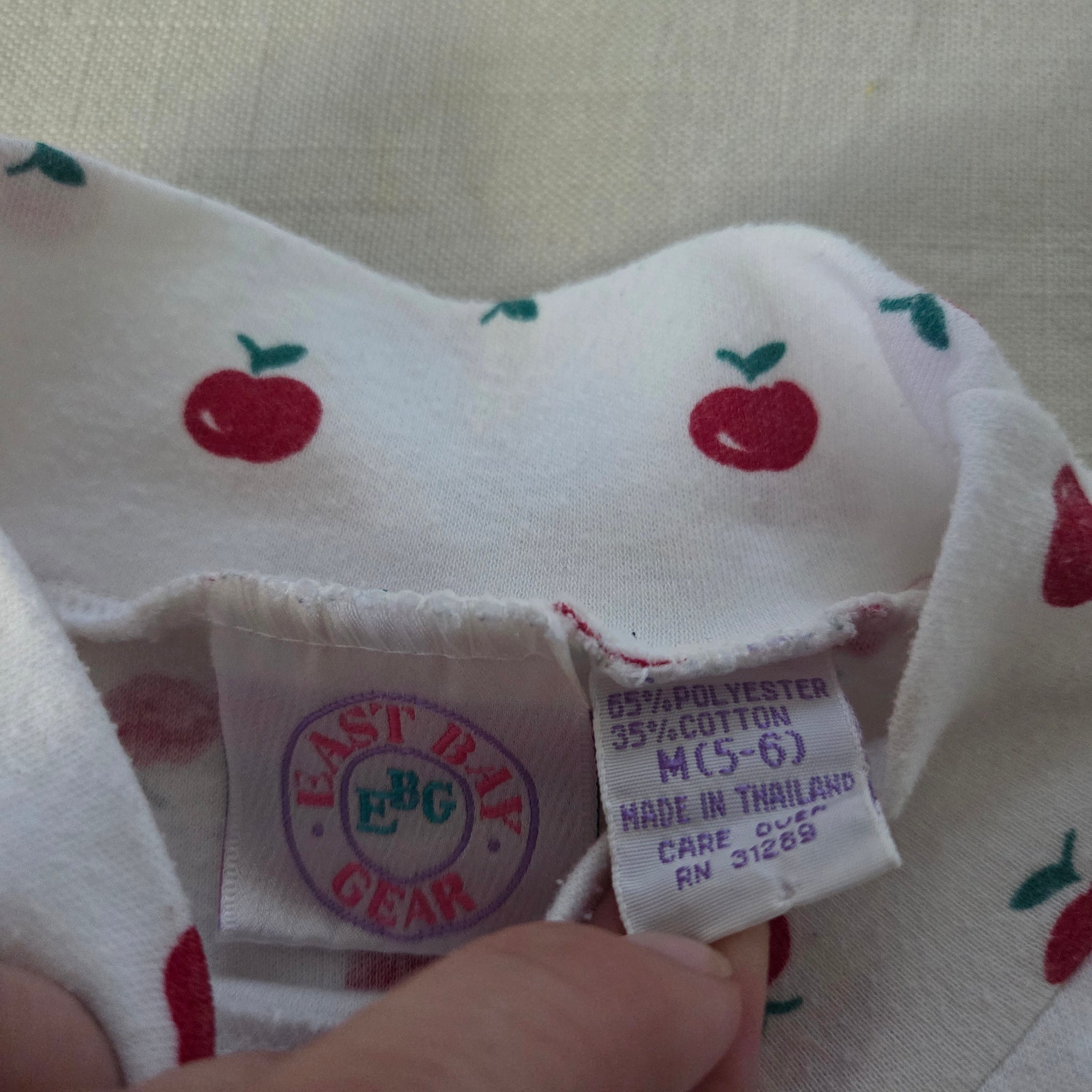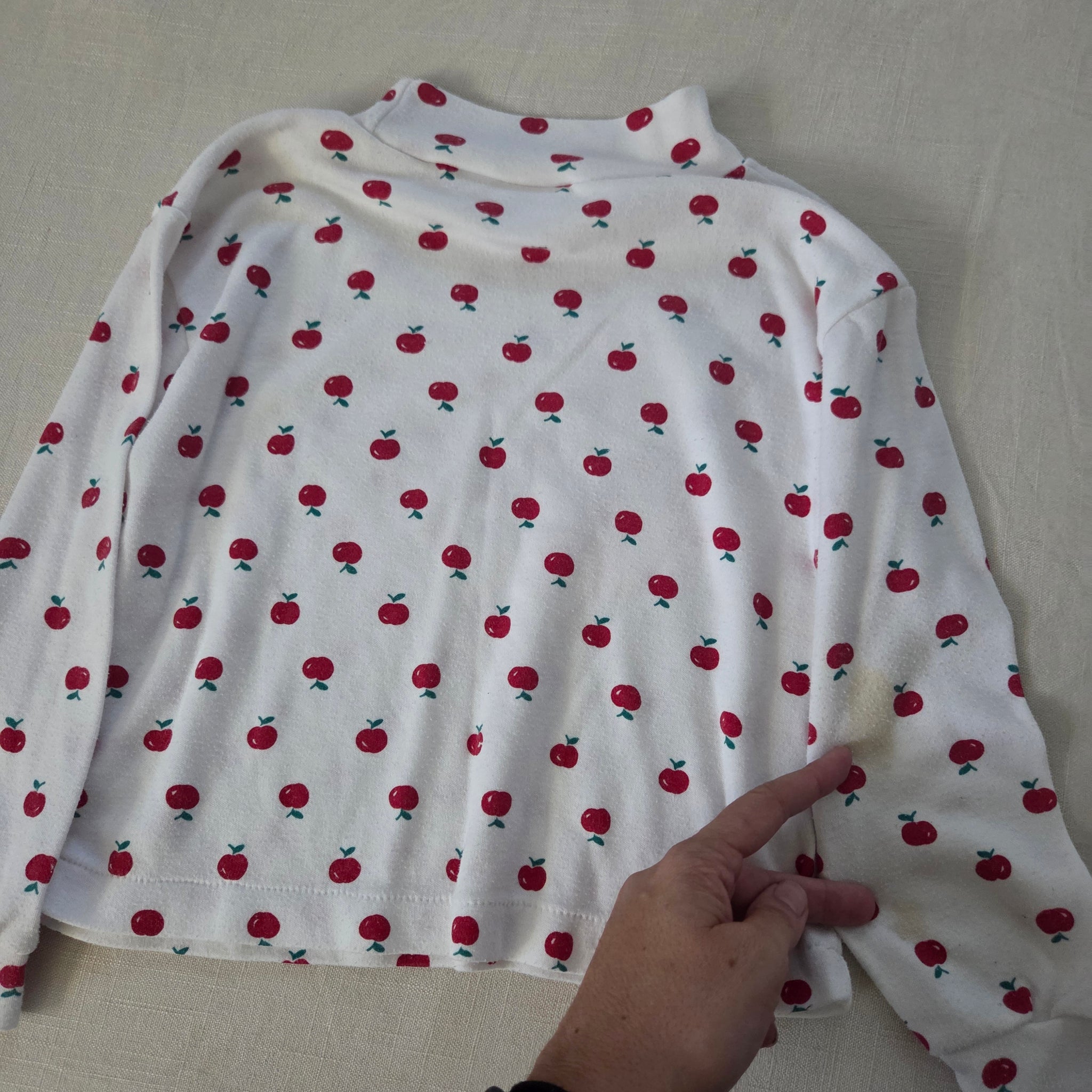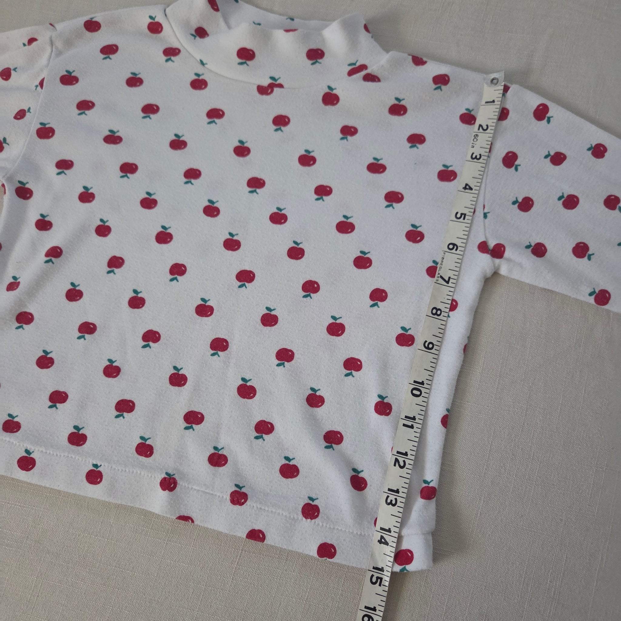 Vintage East Bay Gear brand apple pattern turtleneck long sleeve shirt! Note back of one sleeve has yellow spot shown. Please see all photos for condition and measurements