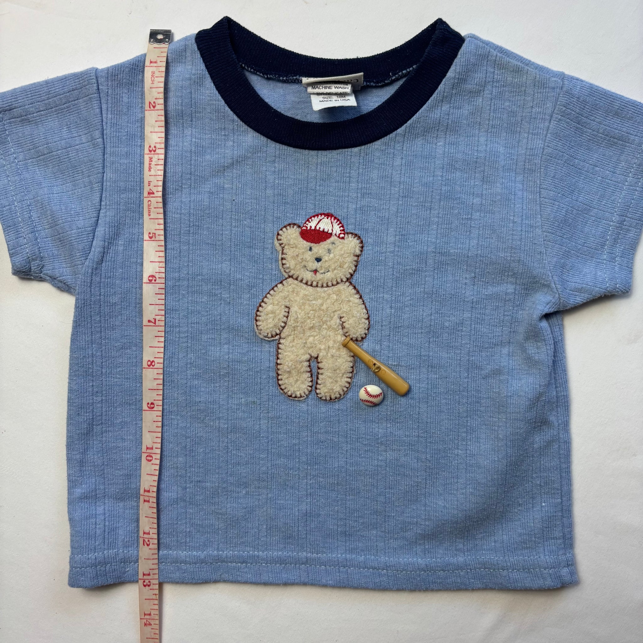 Vintage Cachcach brand blue tee with fuzzy baseball bear applique! Please see all photos for condition and measurements