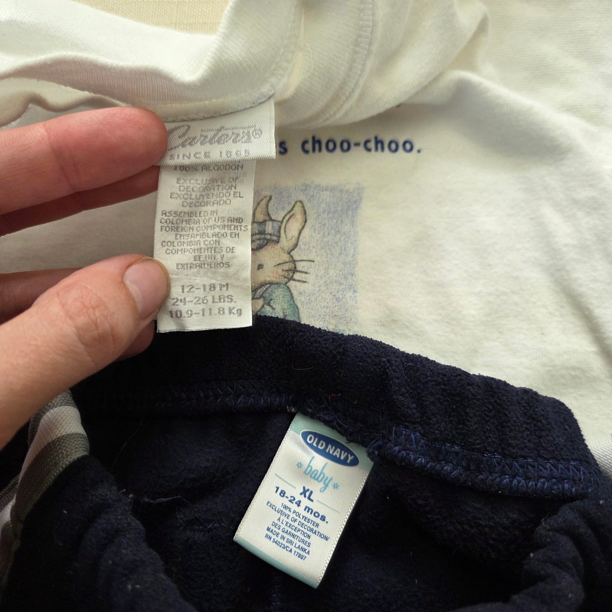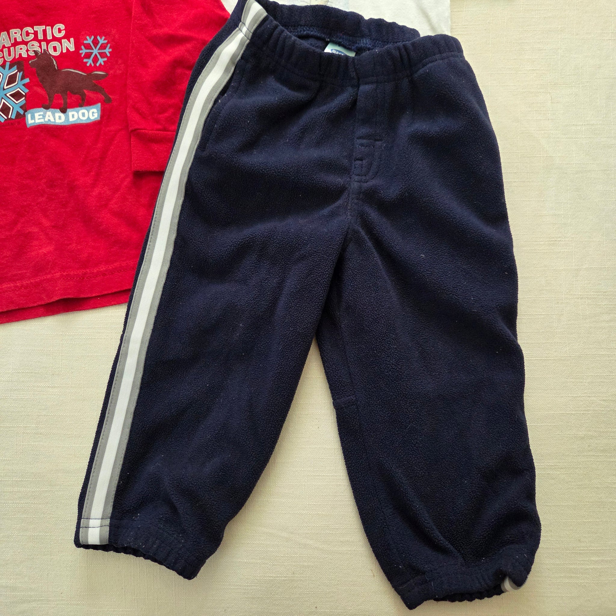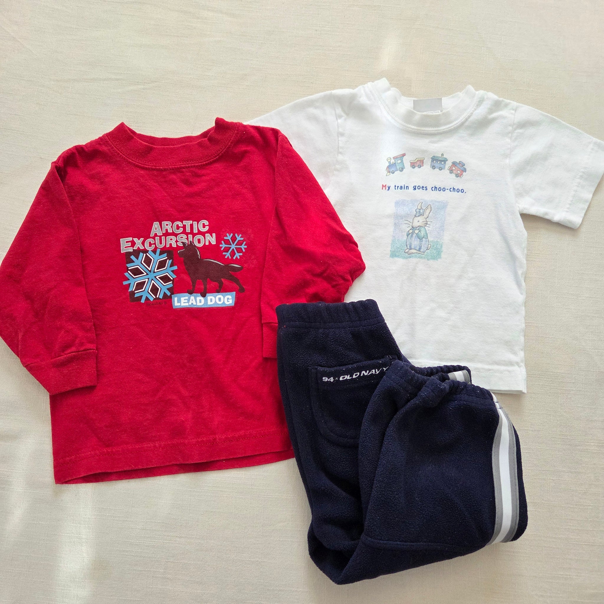 Vintage boyish bundle of 2 shirts (one red, one white with bunny) and a pair of navy blue Old Navy pants with stretchy elastic waist! Please see all photos for condition and measurements