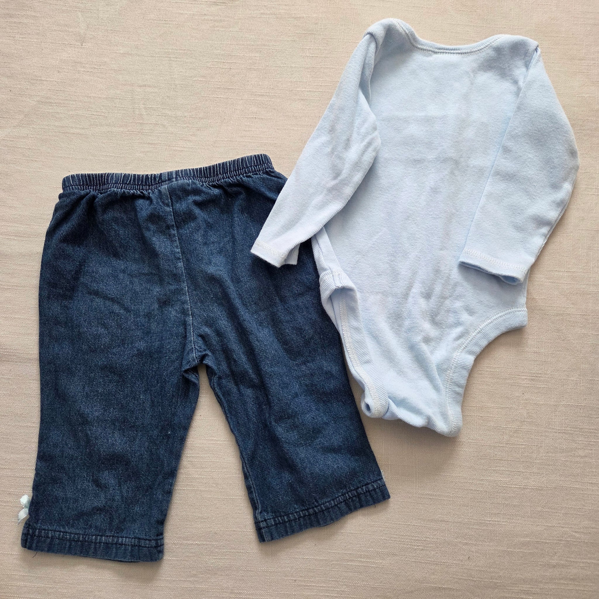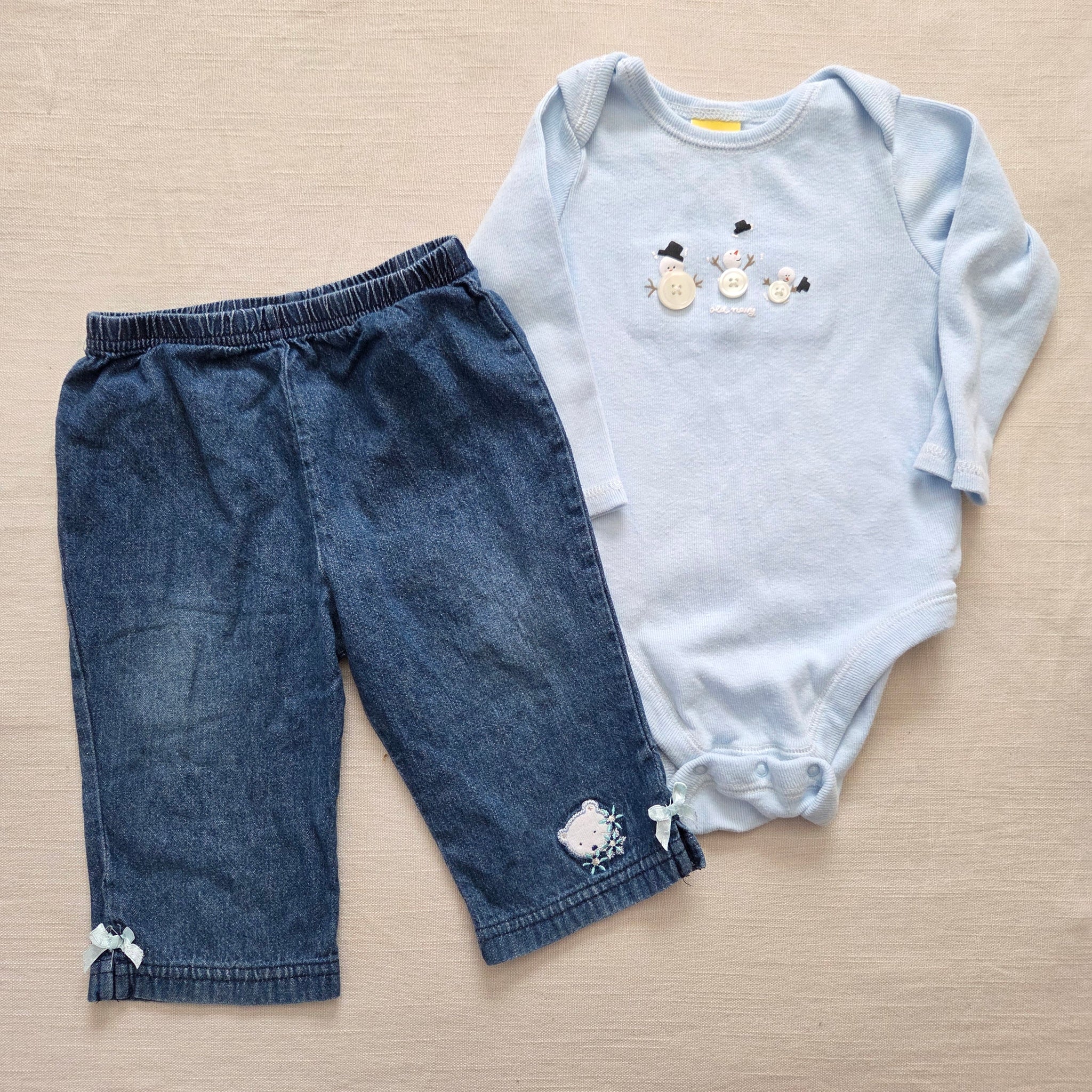 Vintage bundle of Old Navy snowmen blue long sleeve romper and jeans with polar bear embroidery and bows on ankles! Please see all photos for condition and measurements