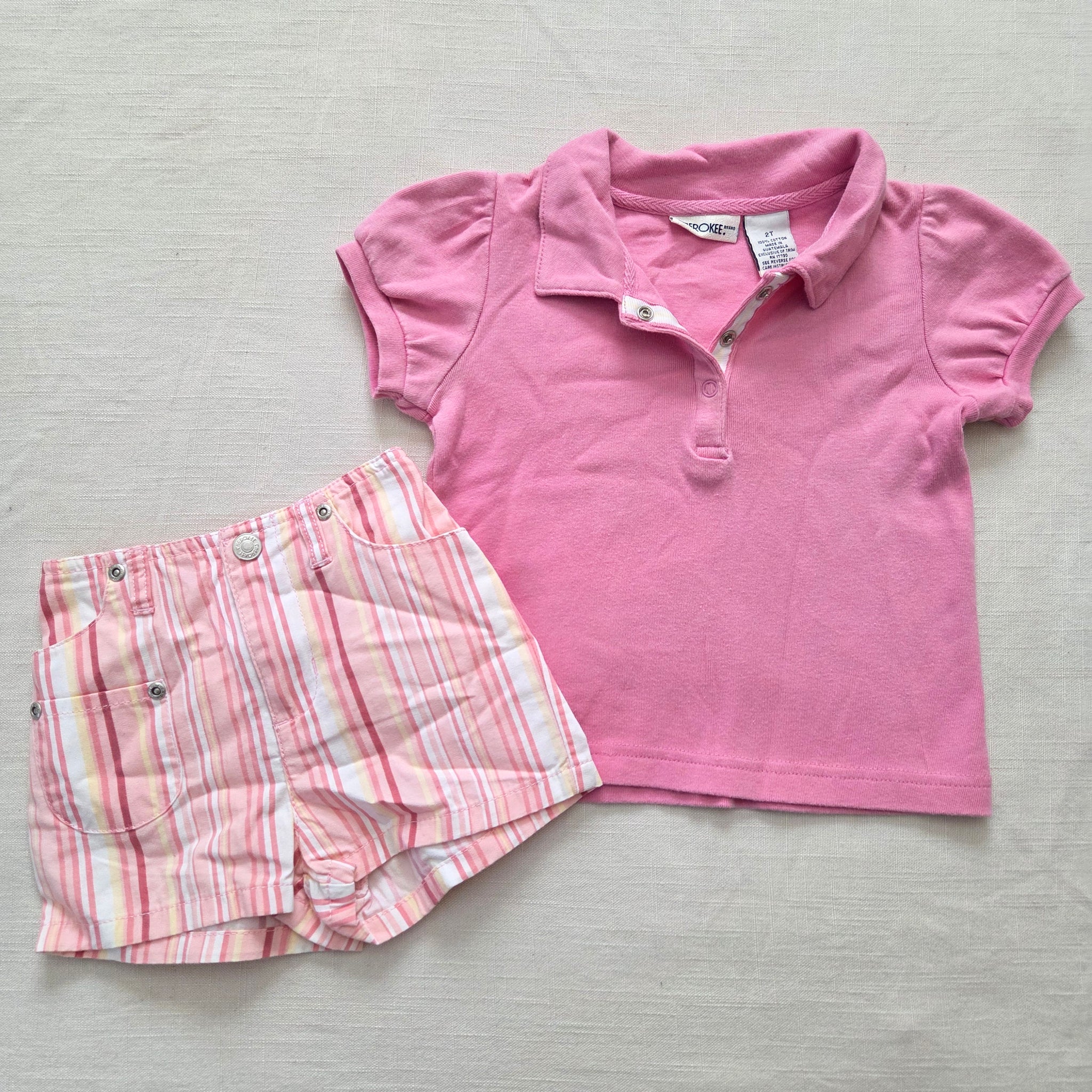 Vintage bundle of pink shirt and striped pink shorts with stretchy elastic waist! Please see all photos for condition and measurements