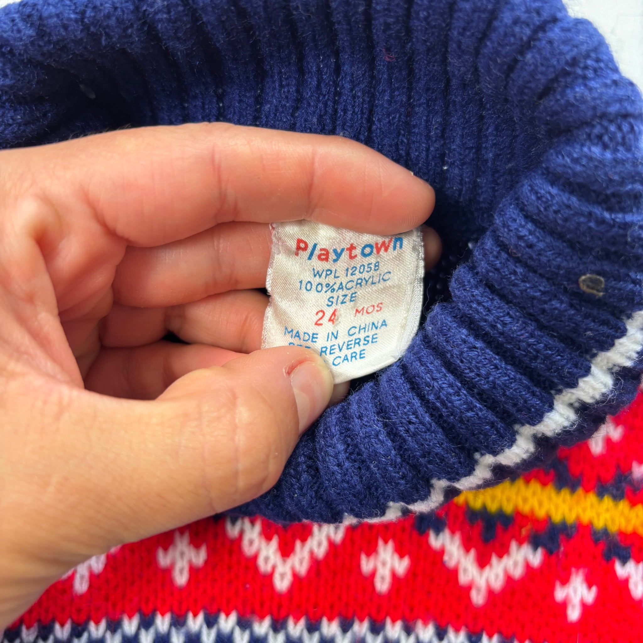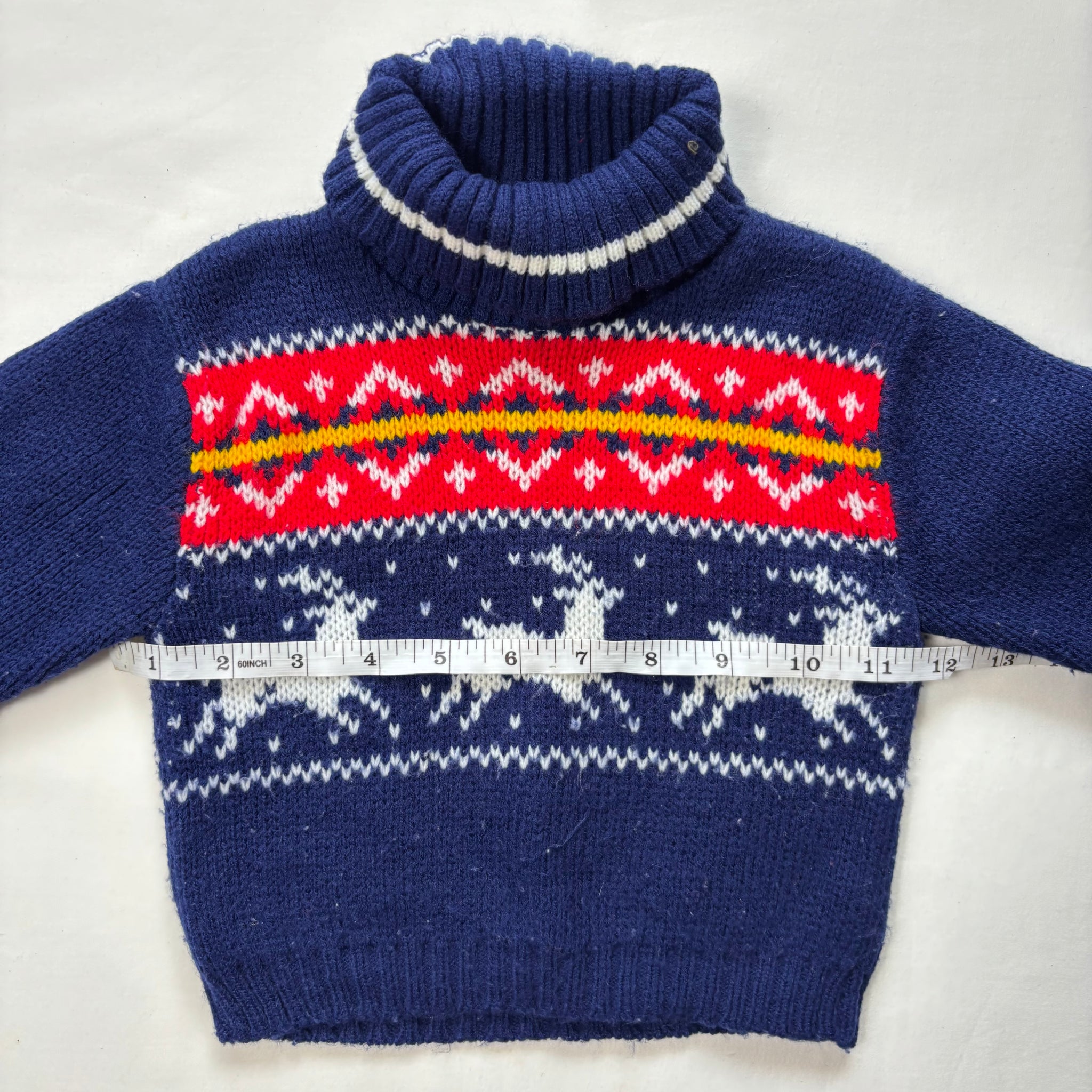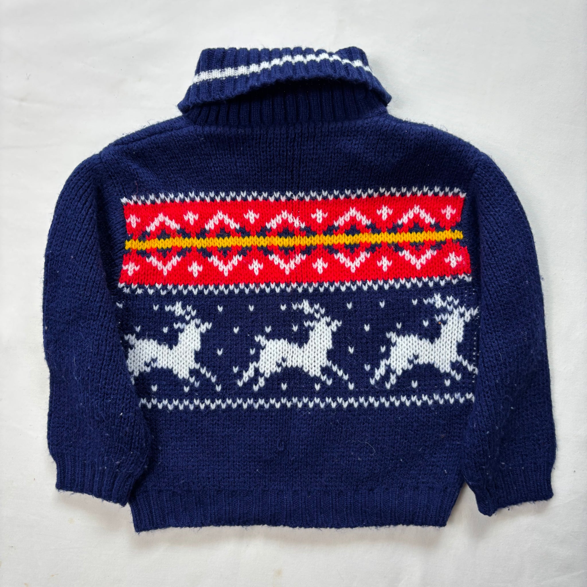 Vintage Playtown brand navy blue and red/white knit turtleneck sweater with reindeer on belly! Please see all photos for condition and measurements