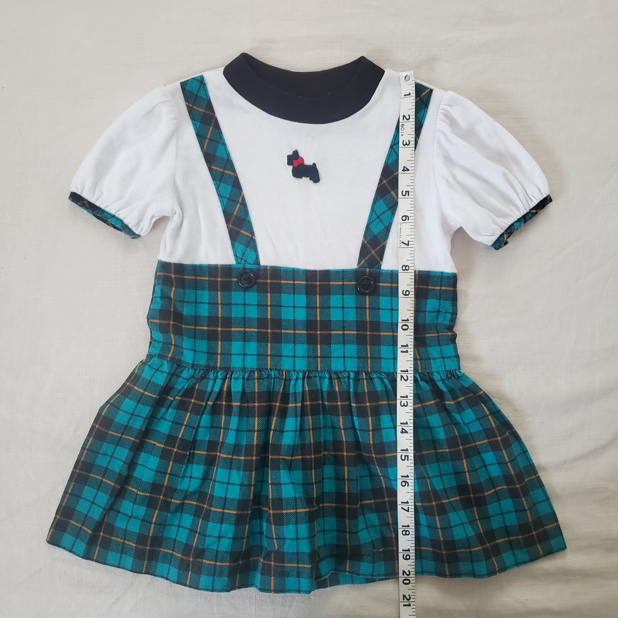 Vintage Roanna brand white and green/black plaid short fitting dress with Scottish terrier on chest! Please see all photos for condition and measurements