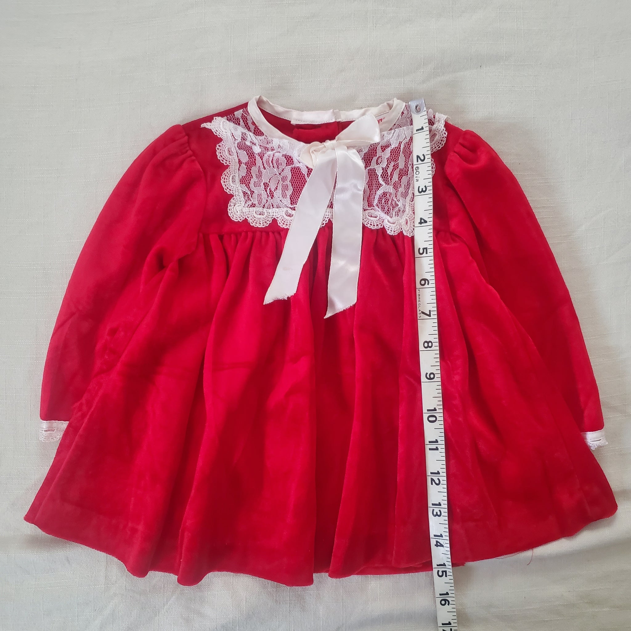 Vintage red soft velour long sleeve dress with lace and bow details! Please see all photos for condition and measurements