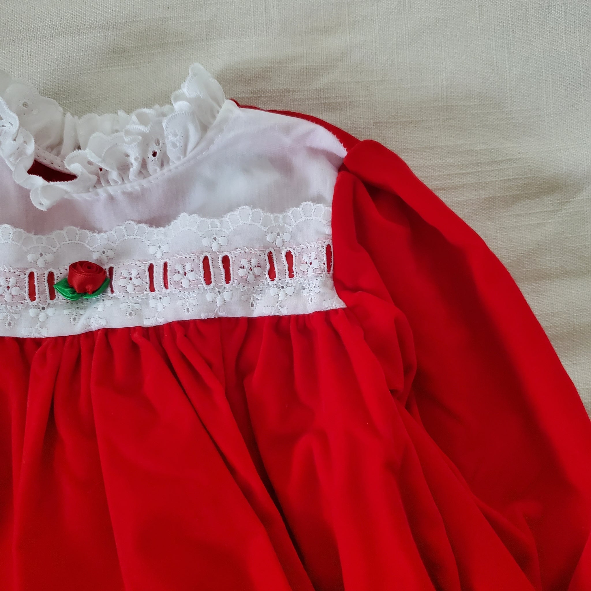 Vintage Jo Lene brand red velour/suede long sleeve smdress with white lace and rose details! Please see all photos for condition and measurements