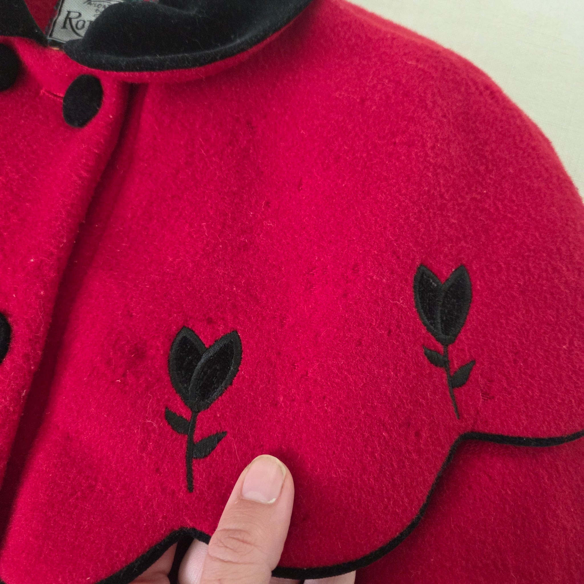 Vintage Rothschild red coat with black flowers and details! Note several superficial holes shown on front chest, back, and sleeves. Still could be worn for far away photos or play. Please see all photos for condition and measurements