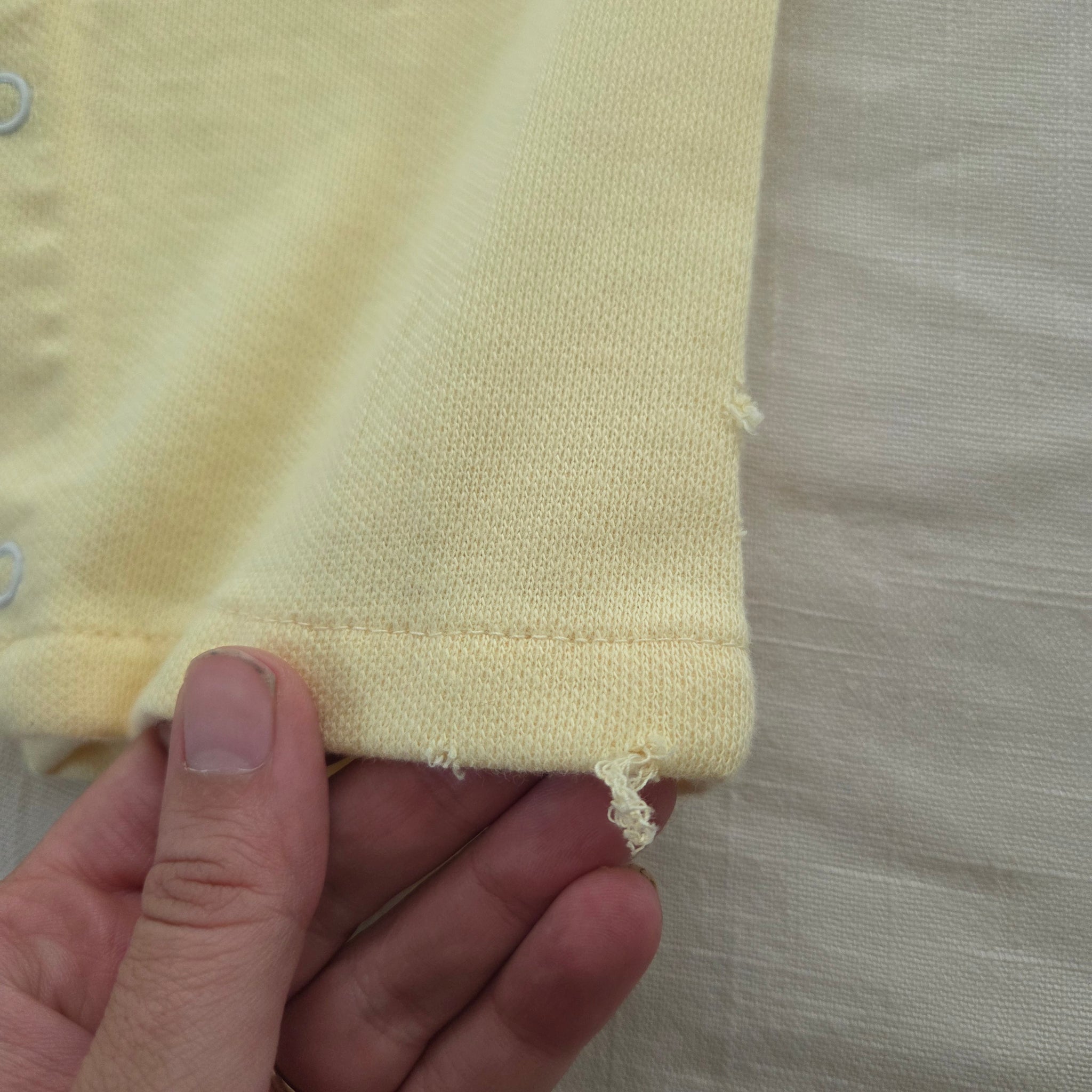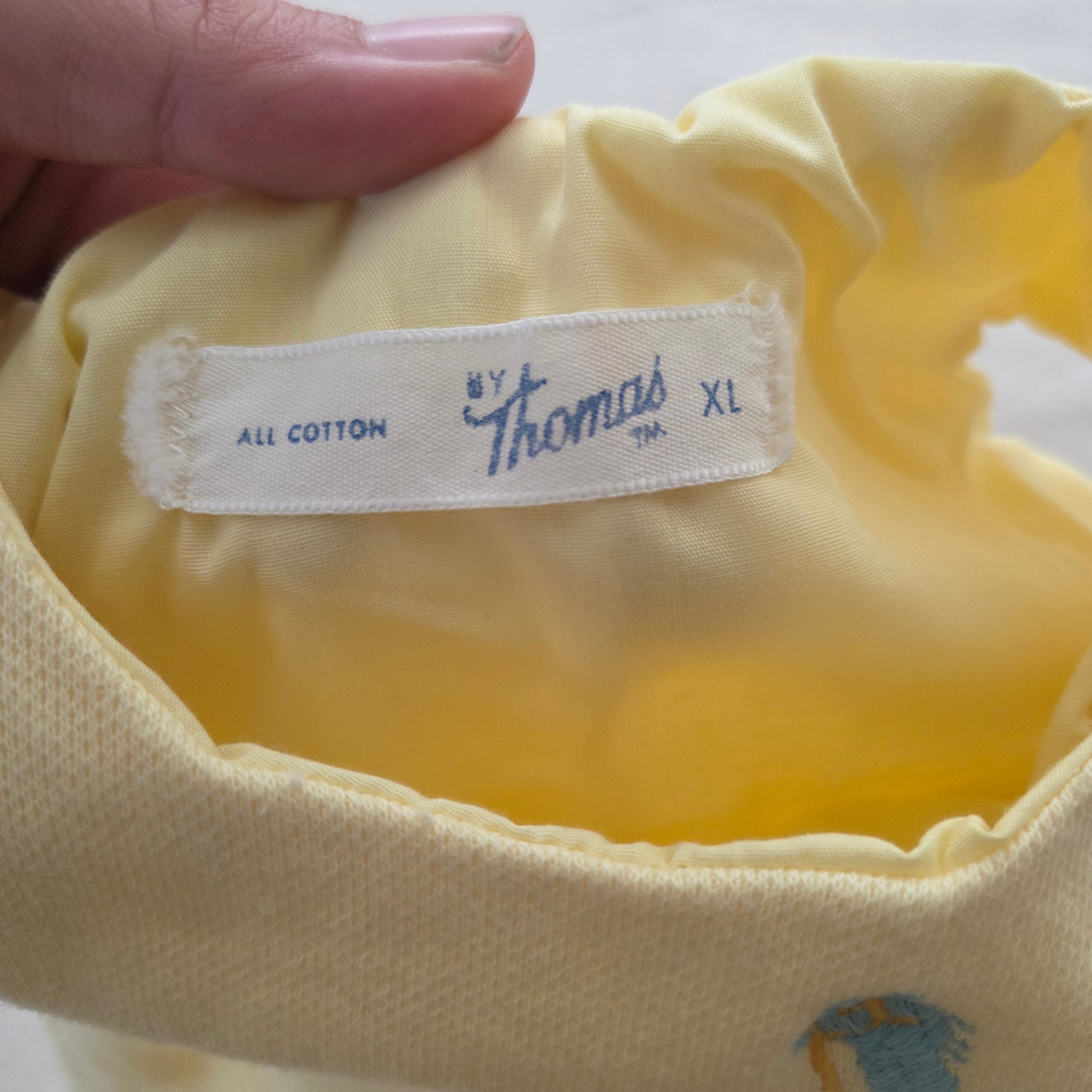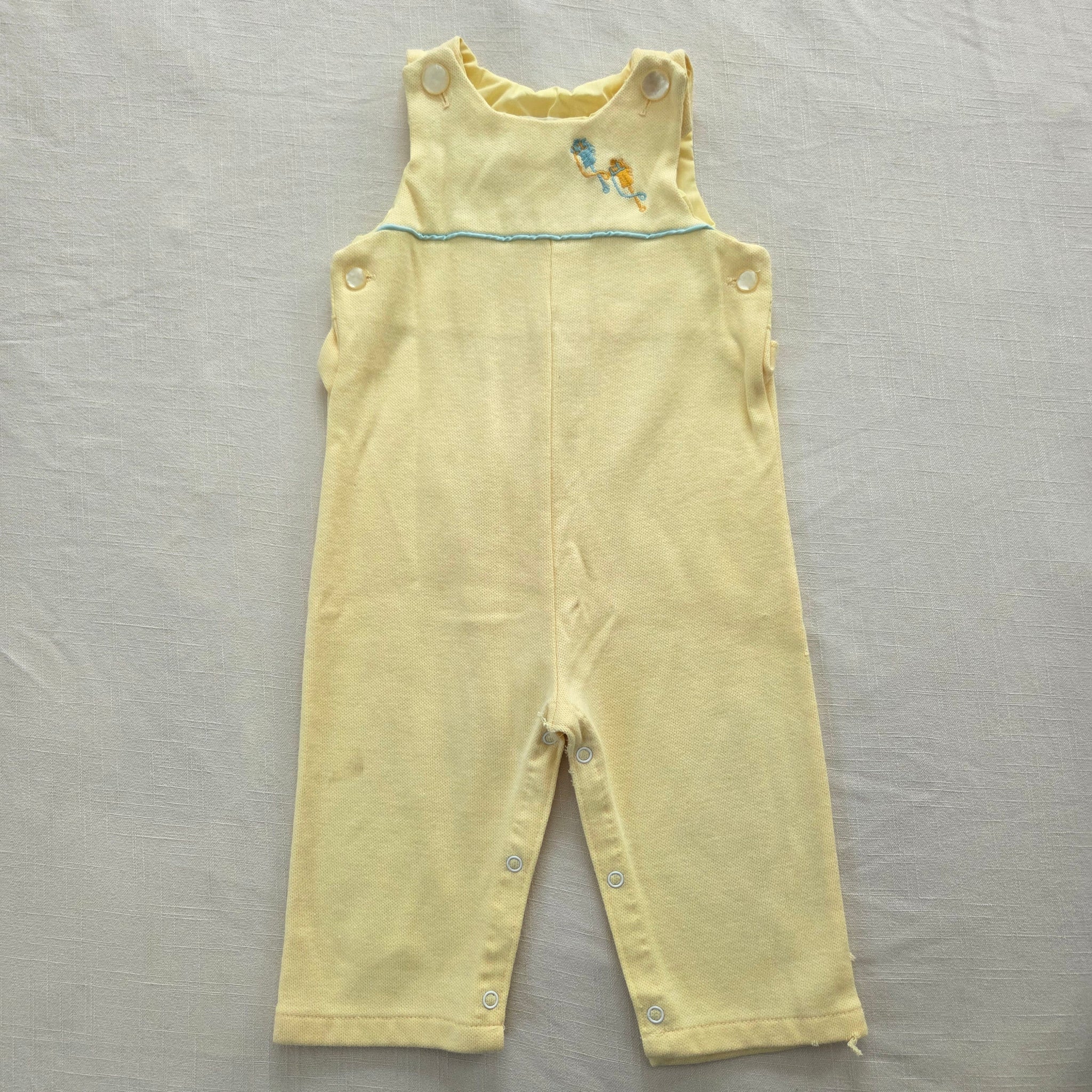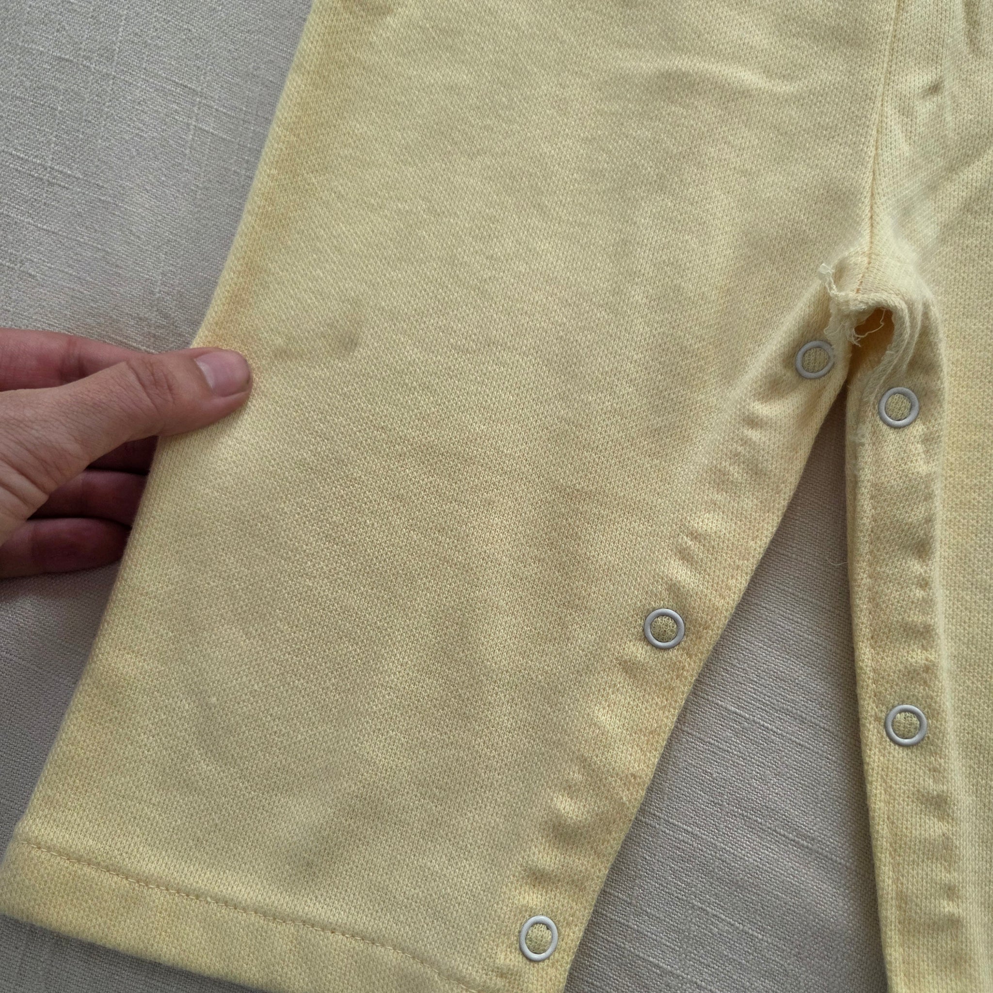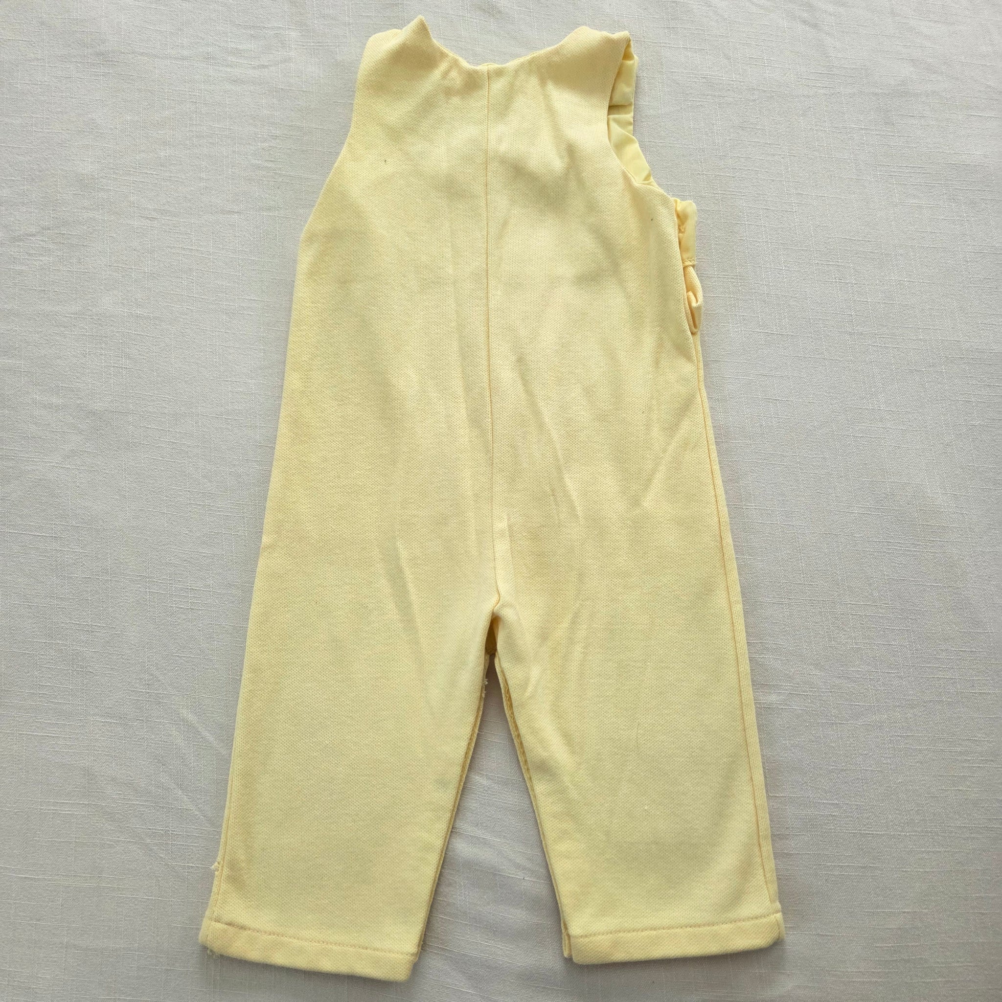 Vintage Thomas brand pastel yellow 100% cotton pantsuit with horse sticks embroidered on chest from the 50s or 60s! Note a little spot on leg shown. Please see all photos for condition and measurements