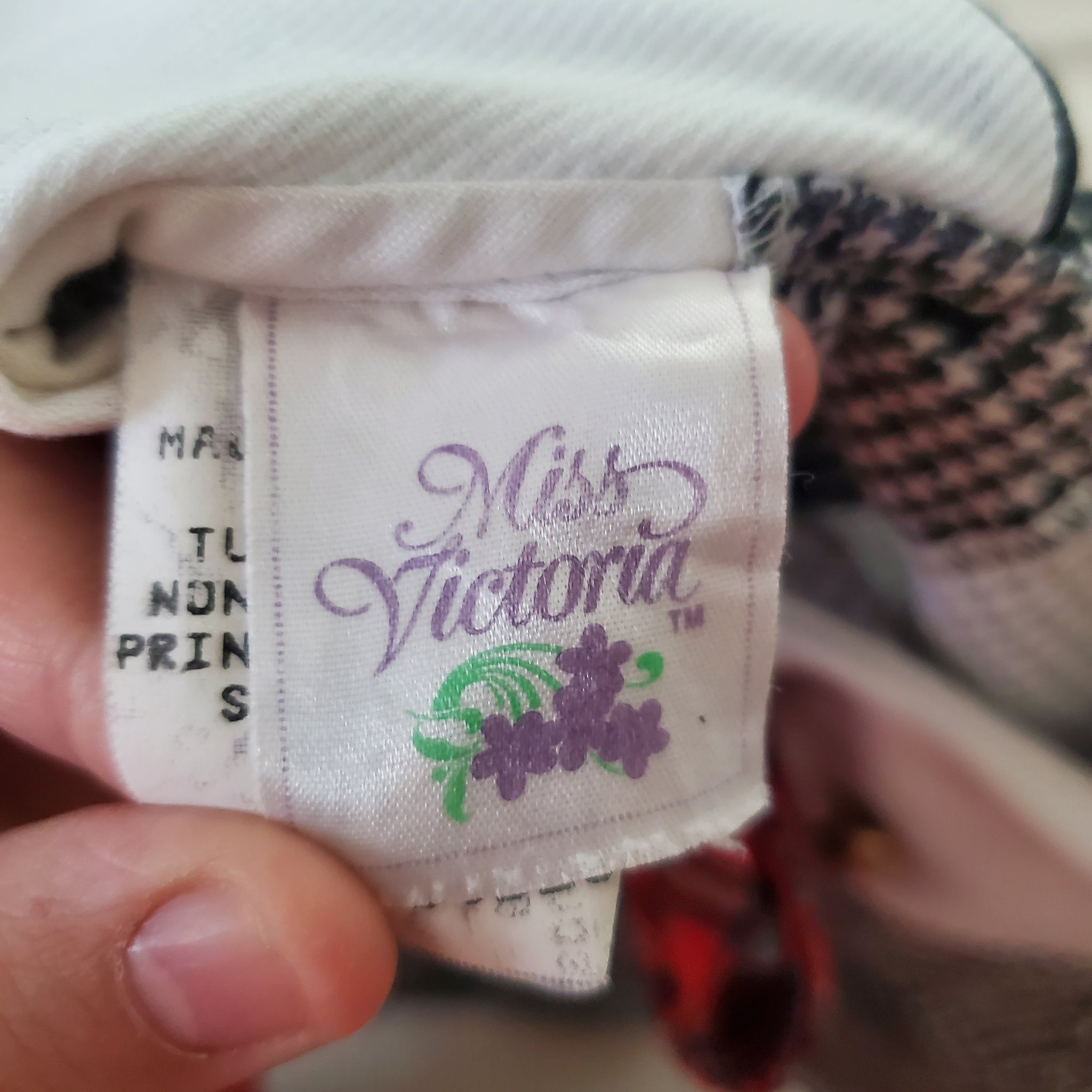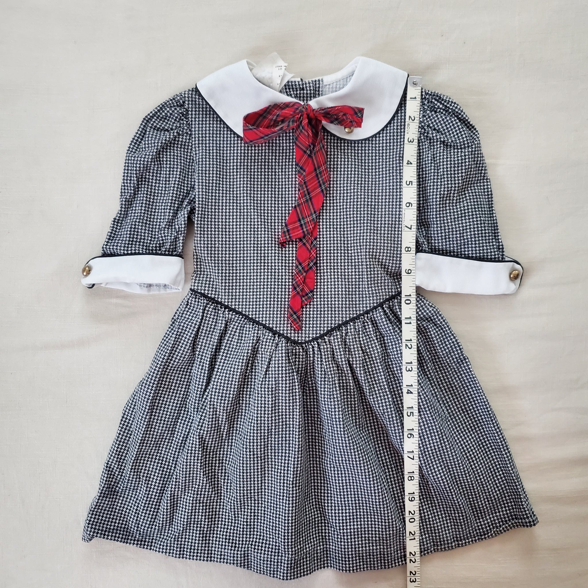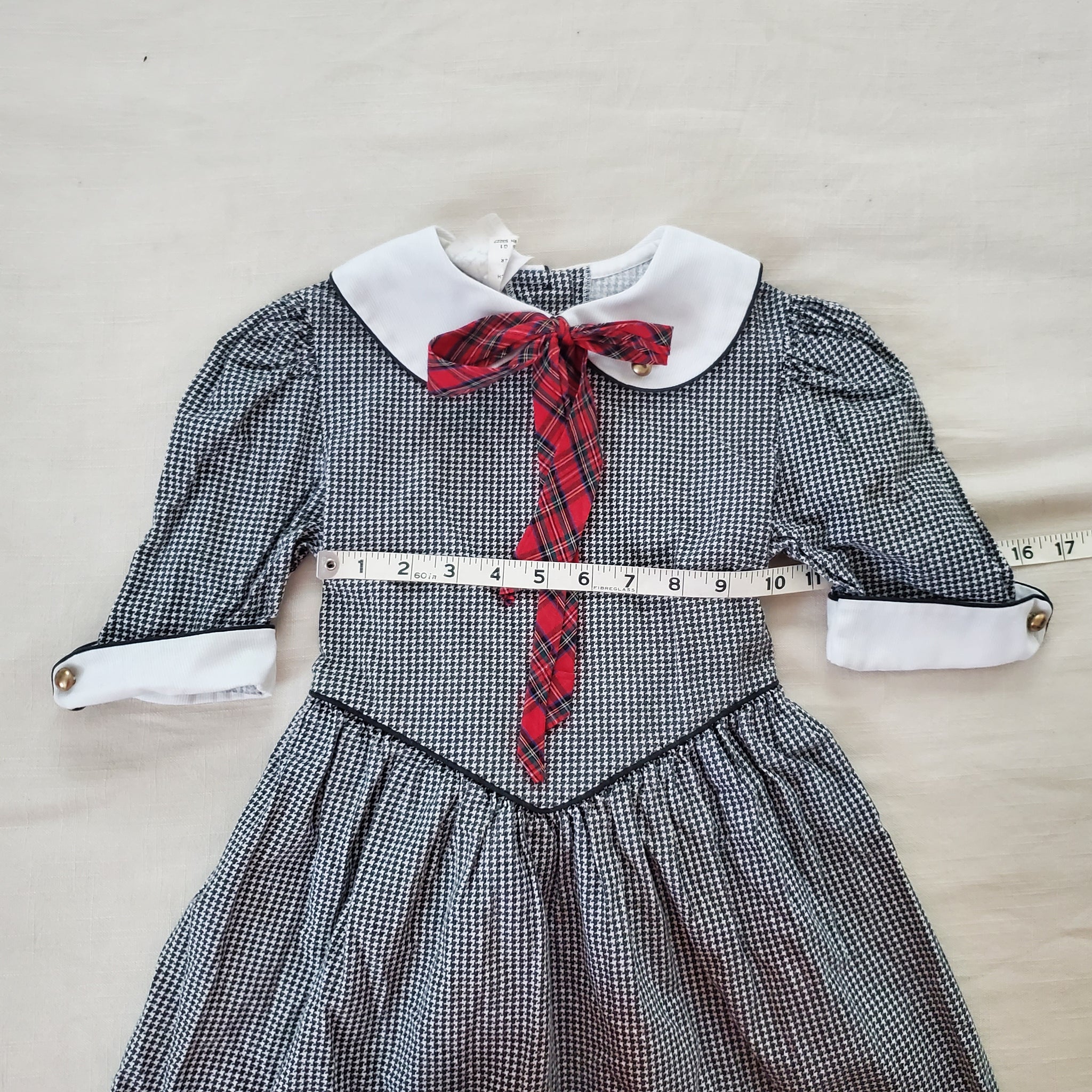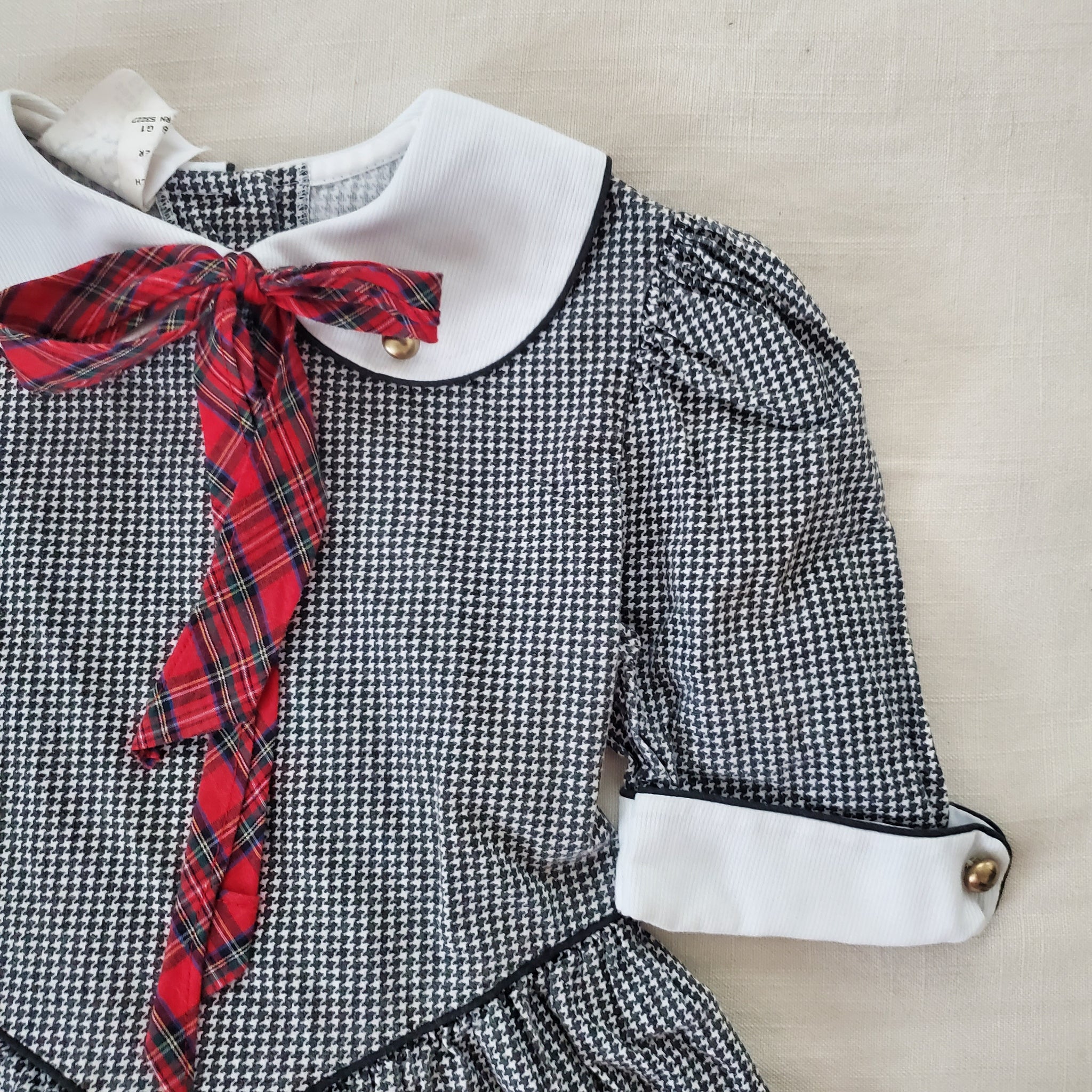 Vintage Miss Victoria brand black and white small houndstooth pattern dress with red plaid bow tied at neck and cute collar! Please see all photos for condition and measurements