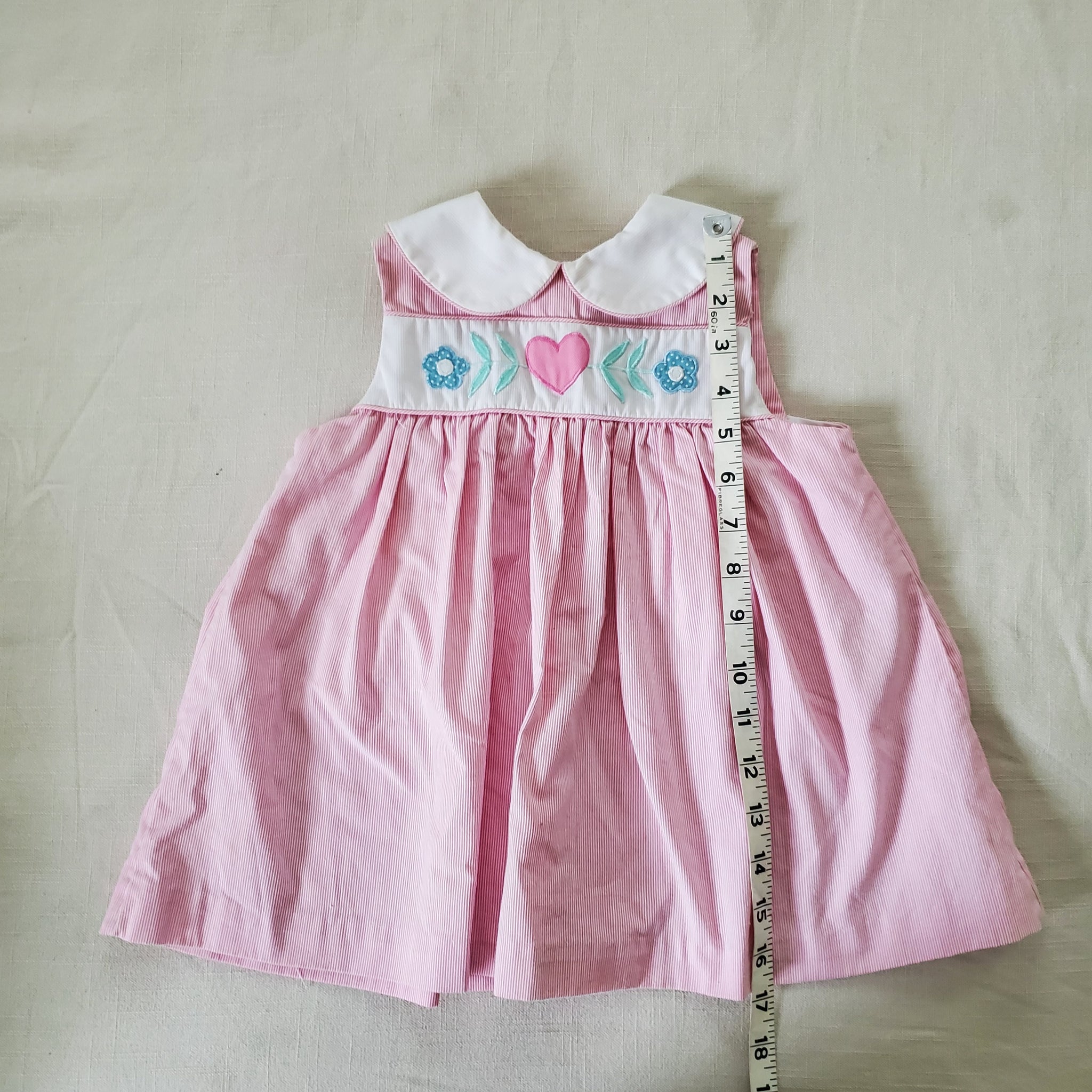 Vintage pink sleeveless dress with heart and flowers applique on chest! Please see all photos for condition and measurements