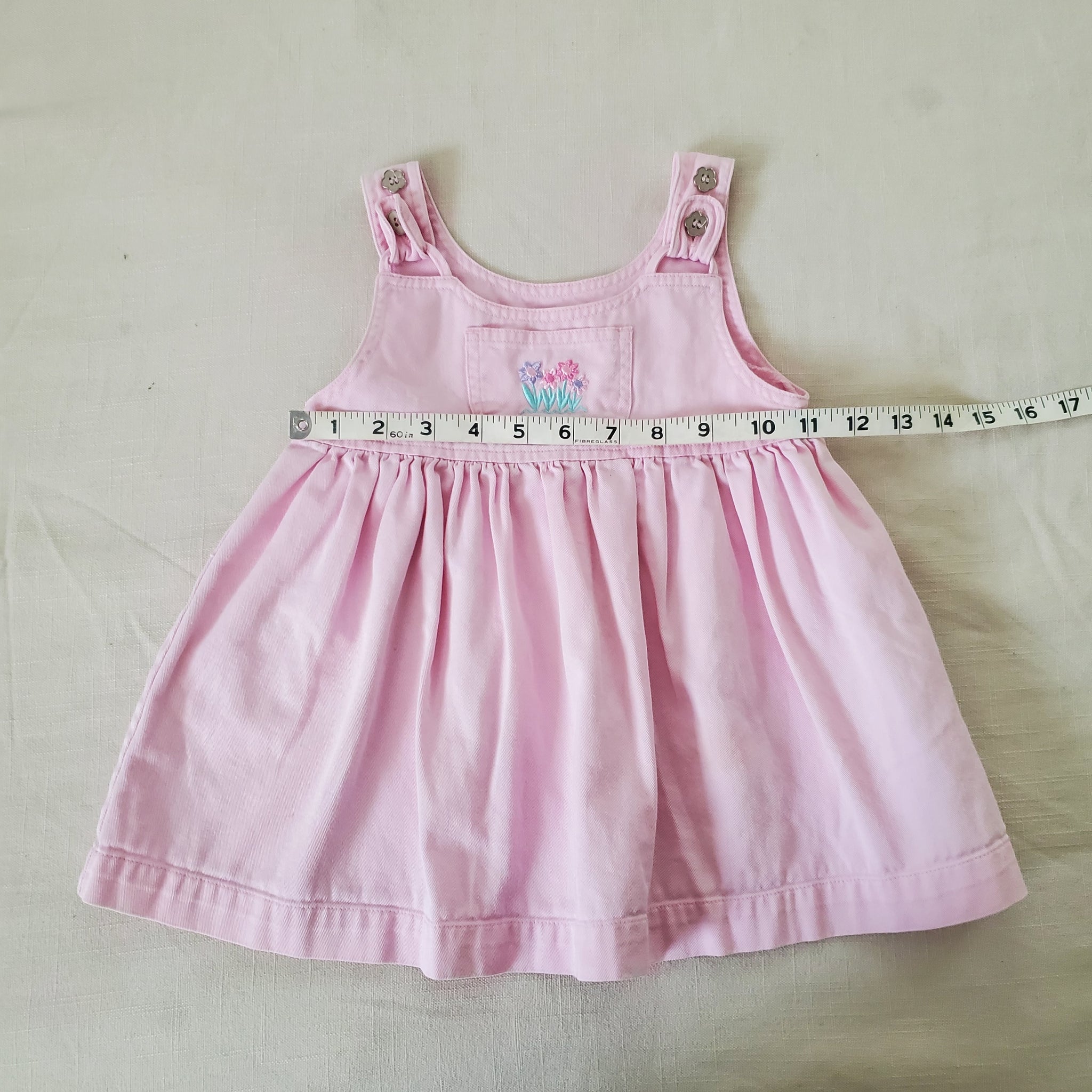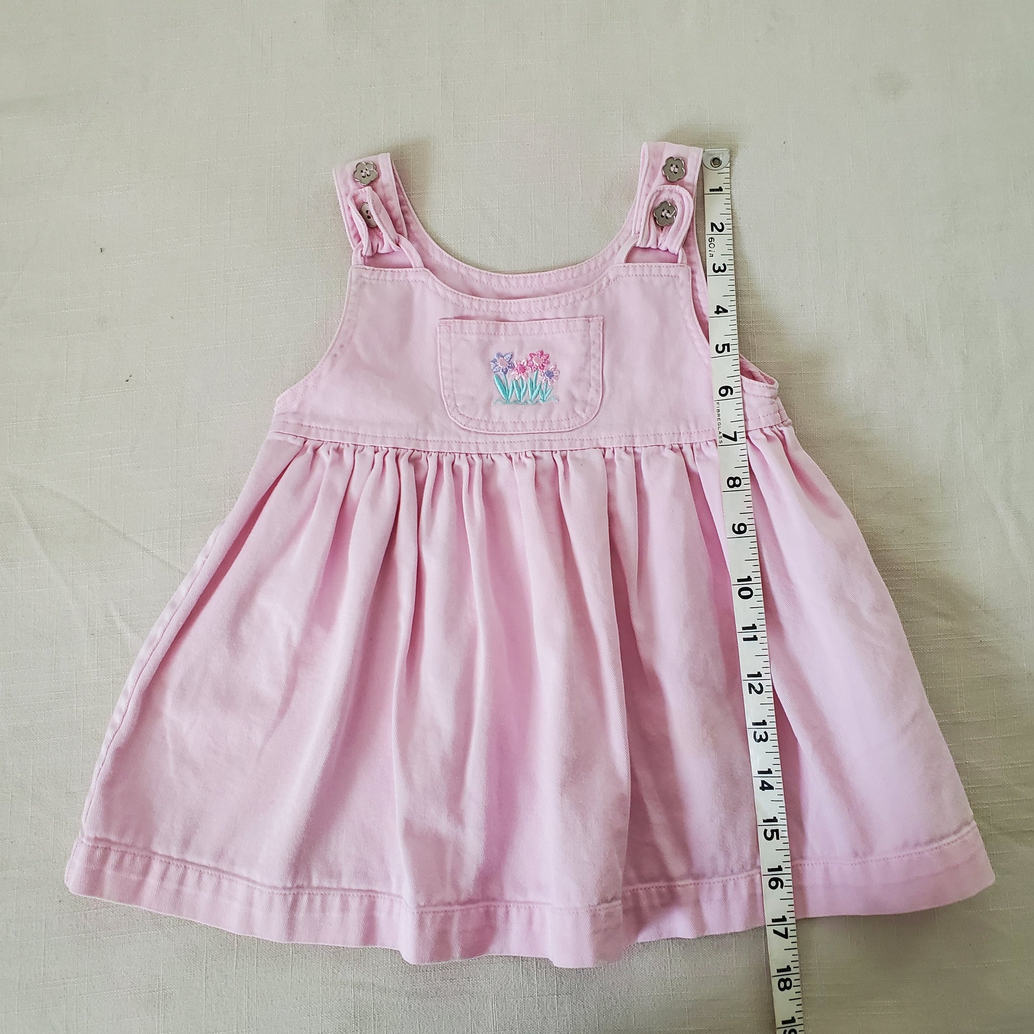 Vintage pink denim dress with flower embroidery on chest and adjustable adorable flower buttons at straps! Layer over a shirt or wear as is! Please see all photos for condition and measurements