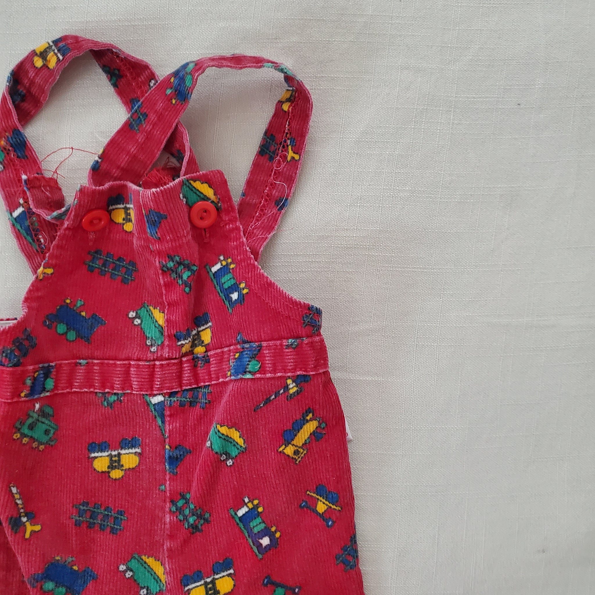 Vintage Pixie Playmates brand red train pattern corduroy footed overalls with straps that can cross in the back! Please see all photos for condition and measurements