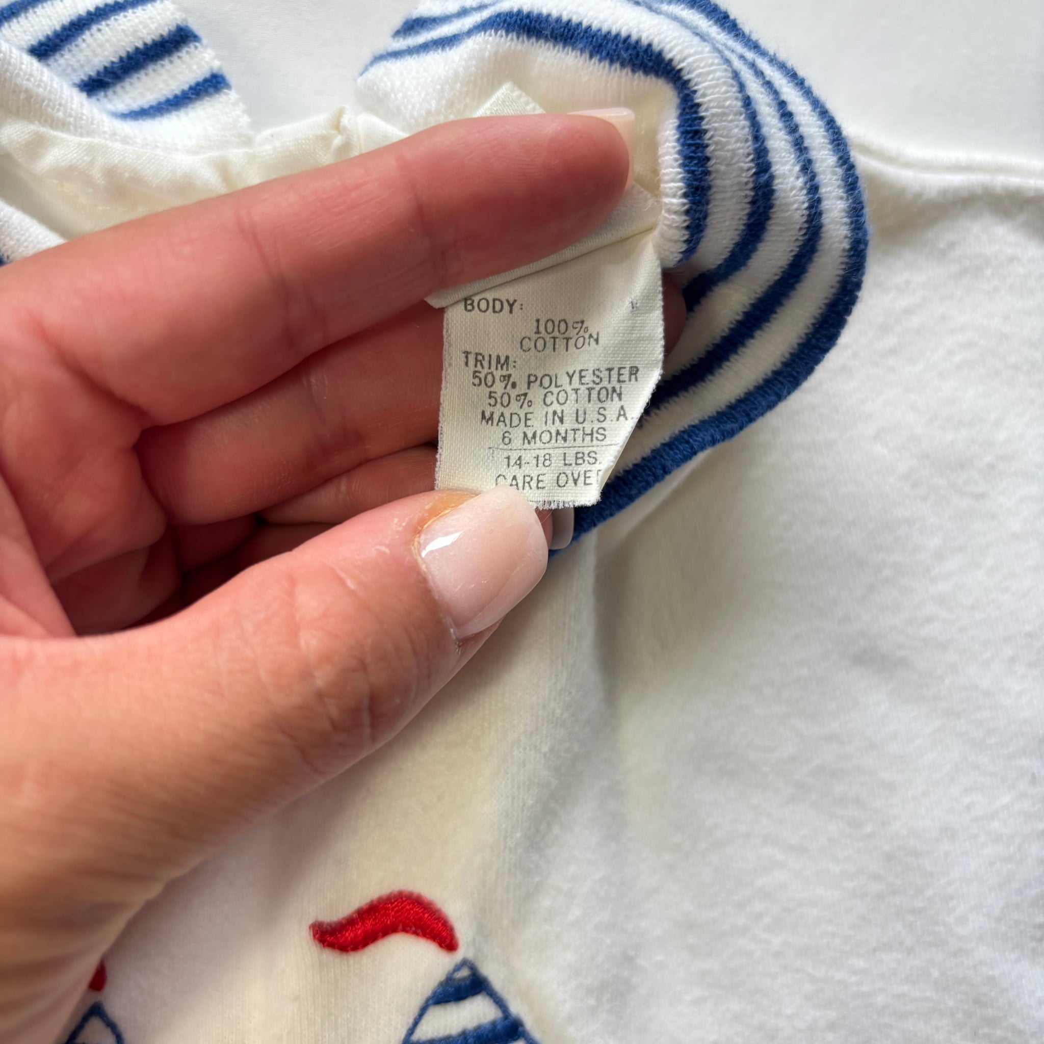 Vintage Baby Dior brand bodysuit with sailboat applique on chest! Note a little yellow spot on arm shown. Please see all photos for condition and measurements