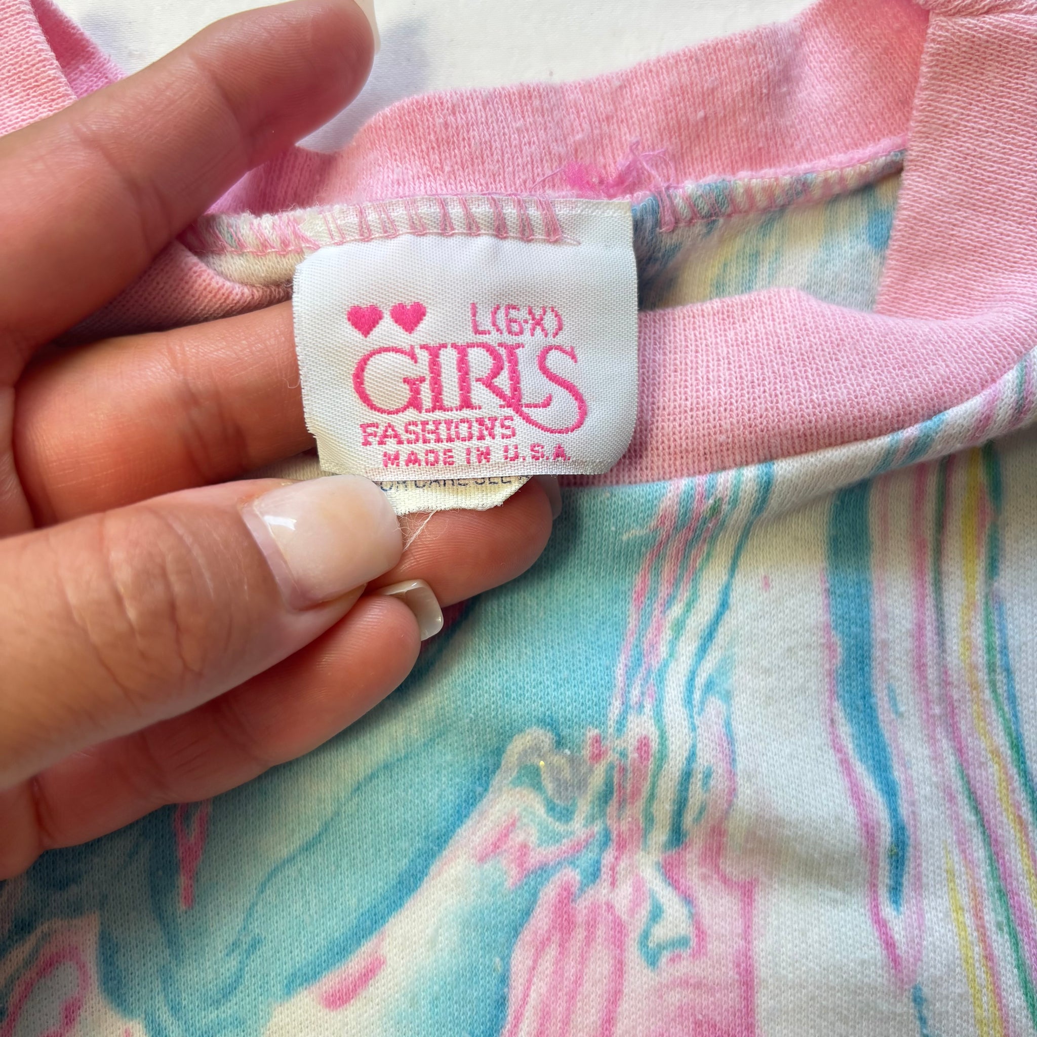 Vintage Girls Fashions brand marble painted tee! Little spots on belly shown. Please see all photos for condition and measurements