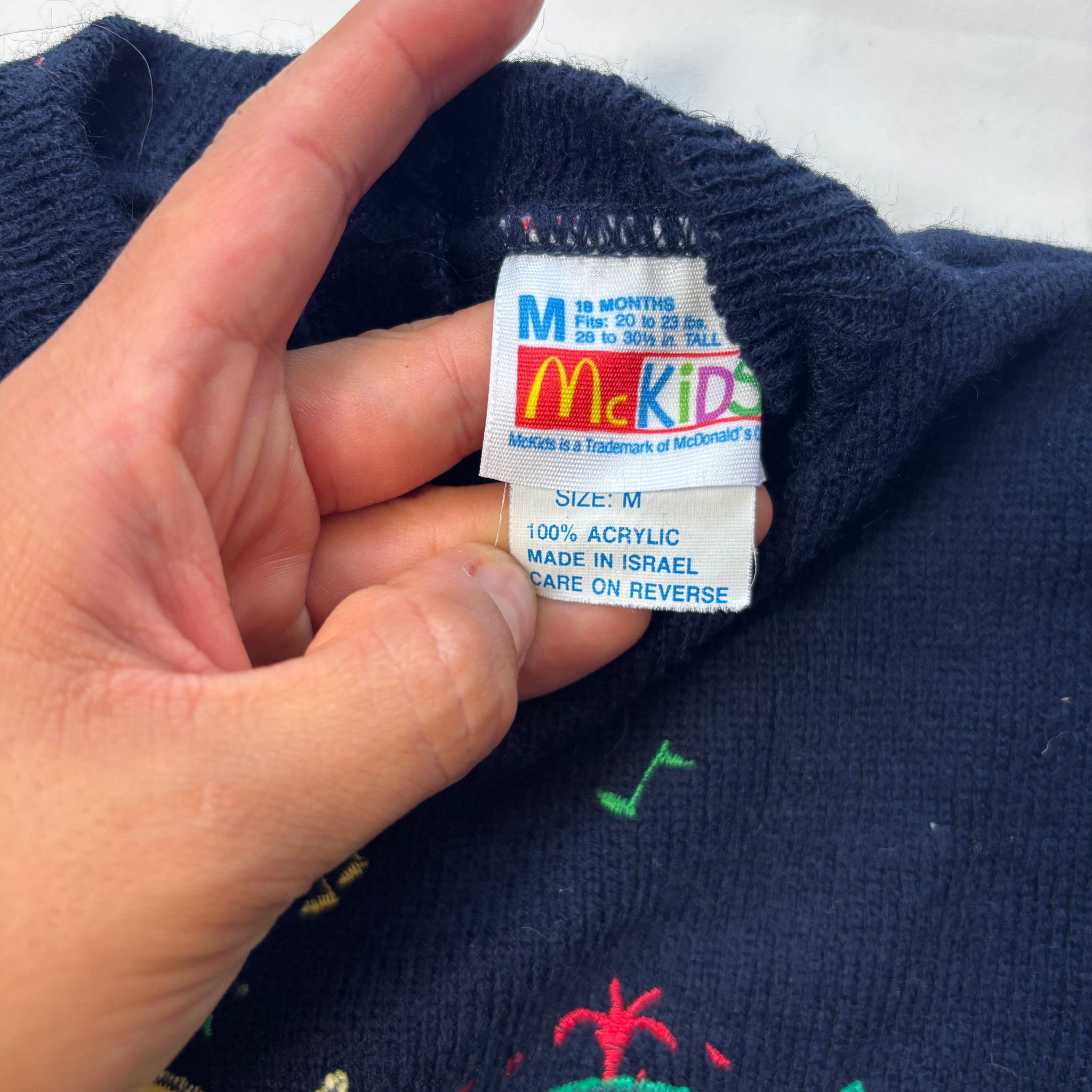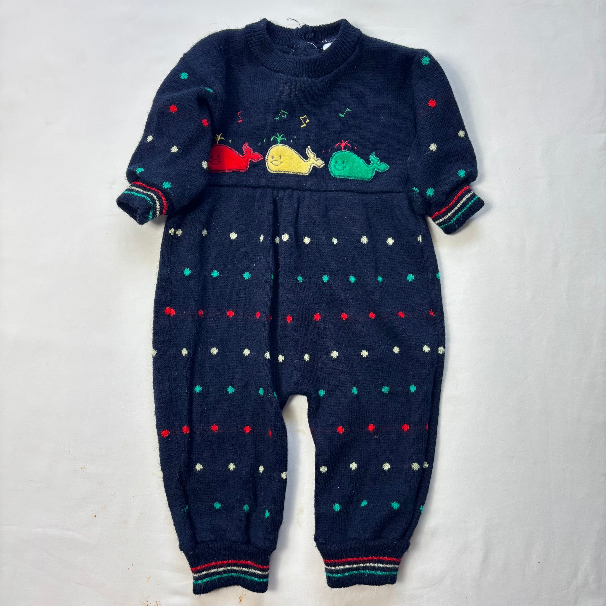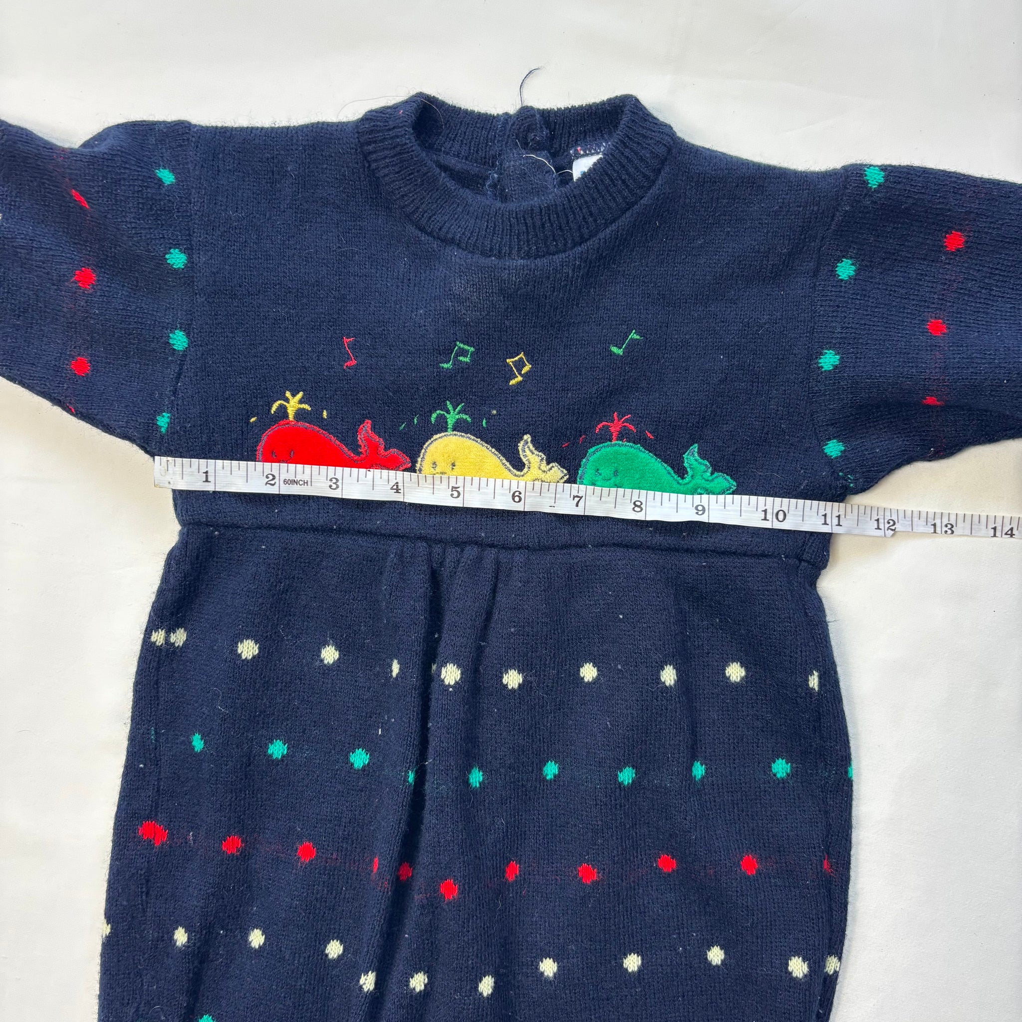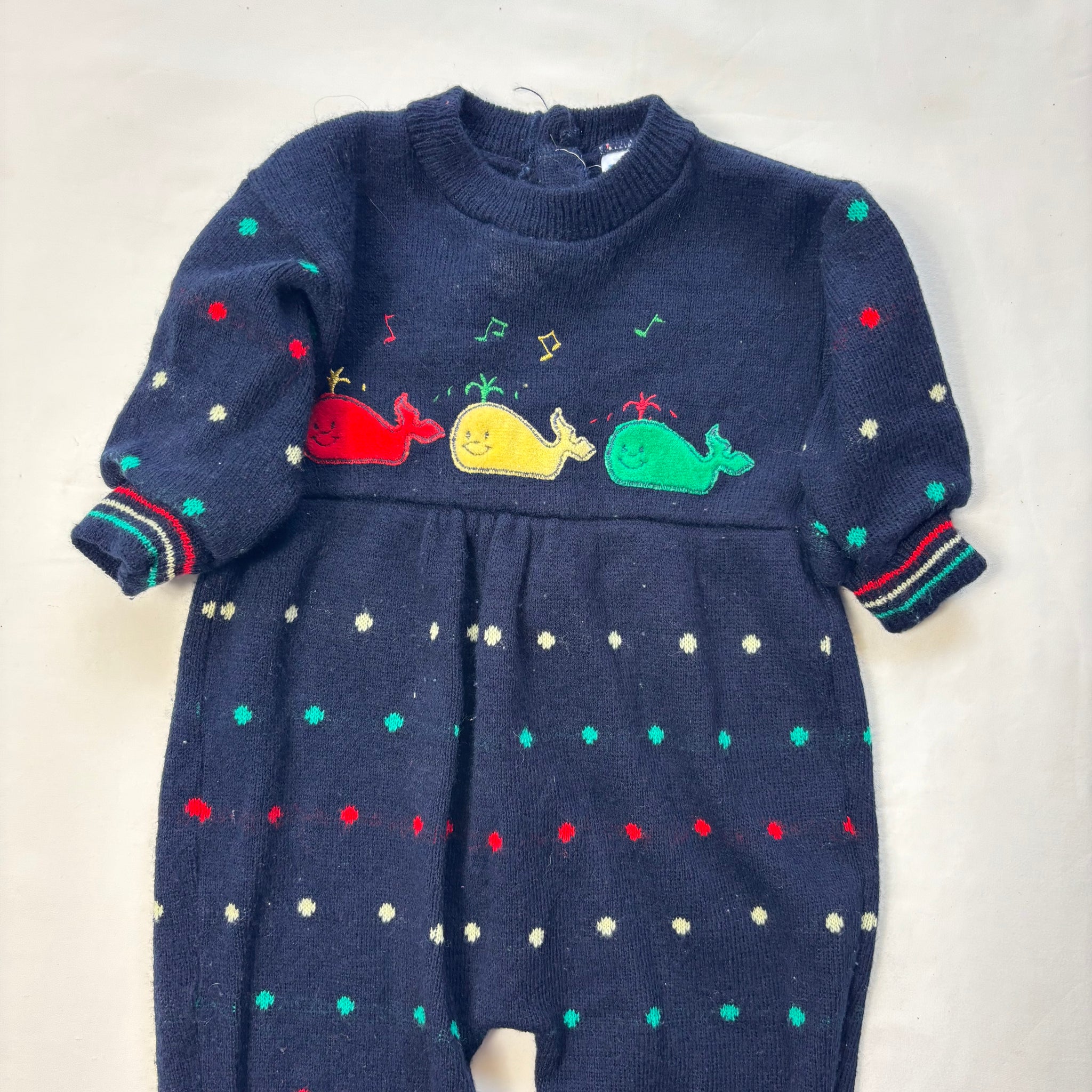 Vintage McKids brand navy blue and multicolored pattern knit bodysuit with colorful whales on chest! Please see all photos for condition and measurements