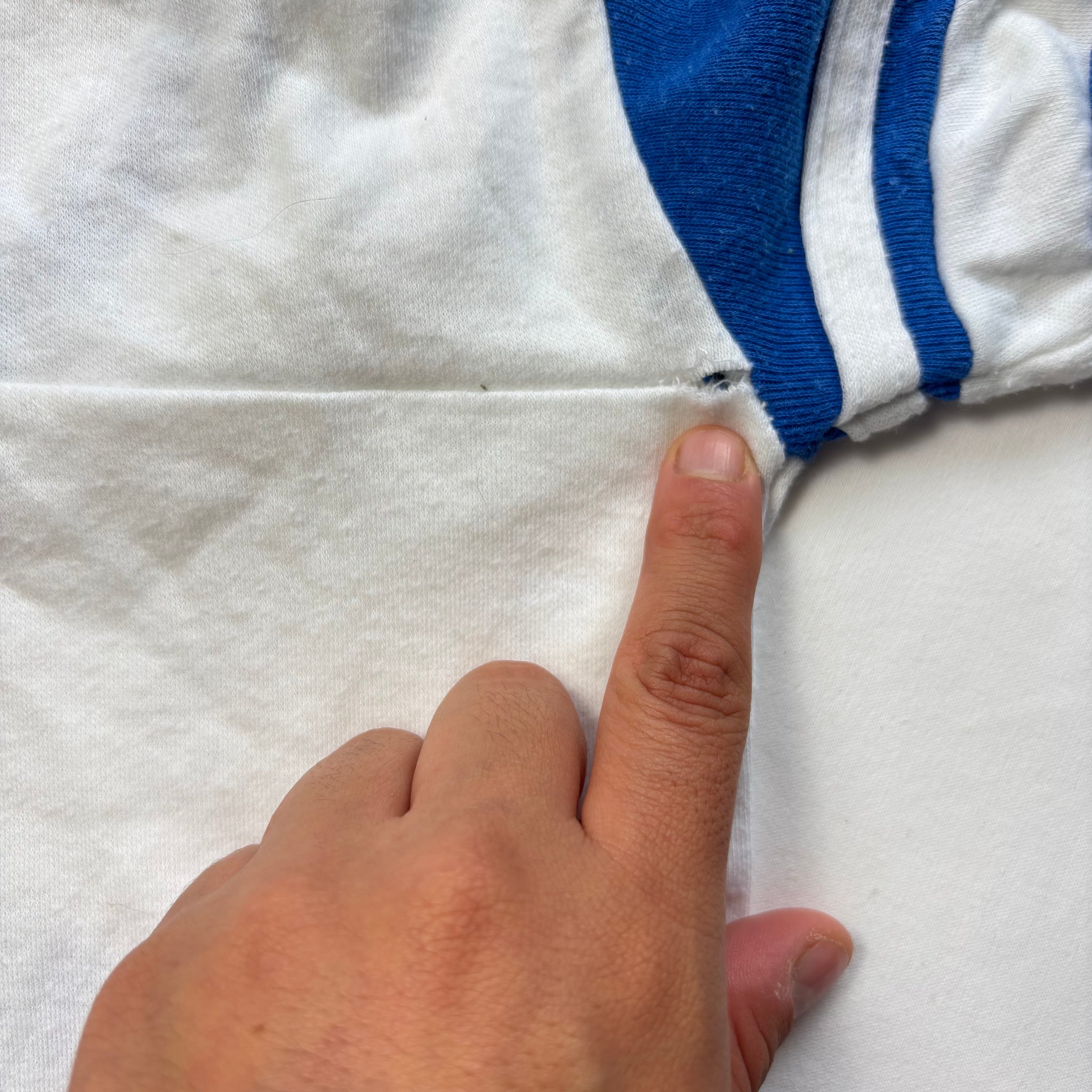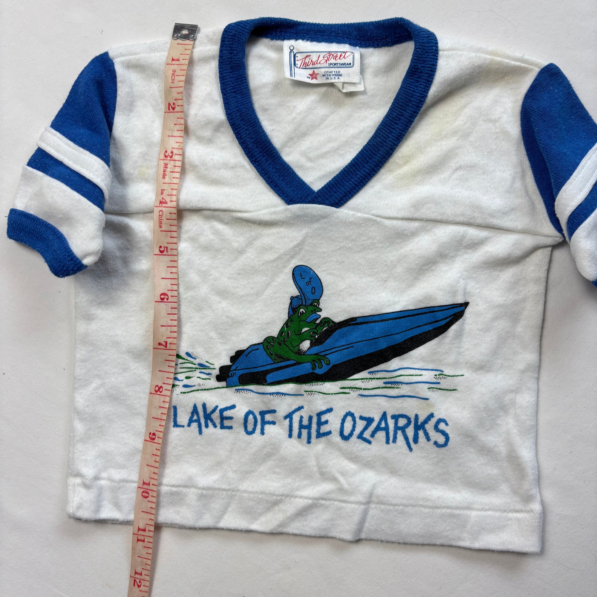 Vintage Third Street brand "Lake of the Ozarks" frog riding jetski souvenir white and blue tee! Note a tiny bit of seam coming undone on back arm area. Please see all photos for condition and measurements