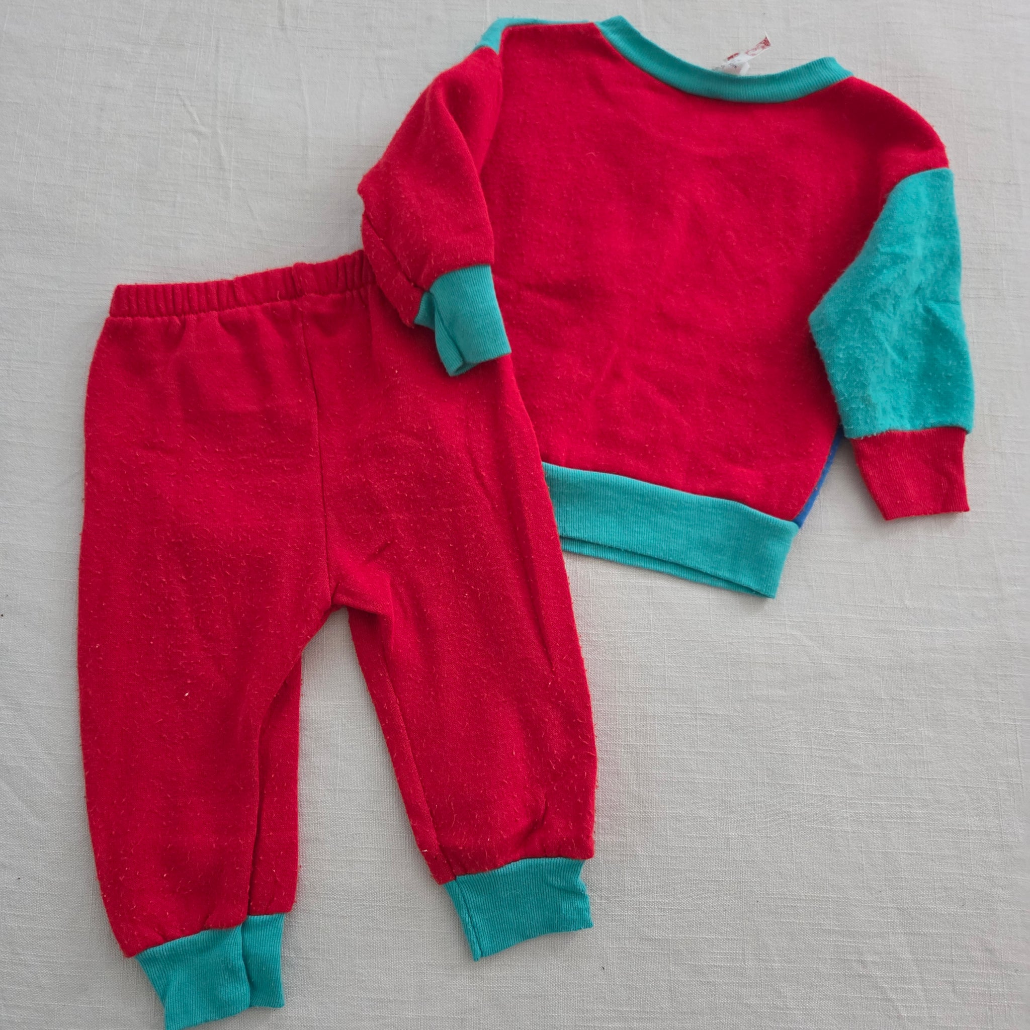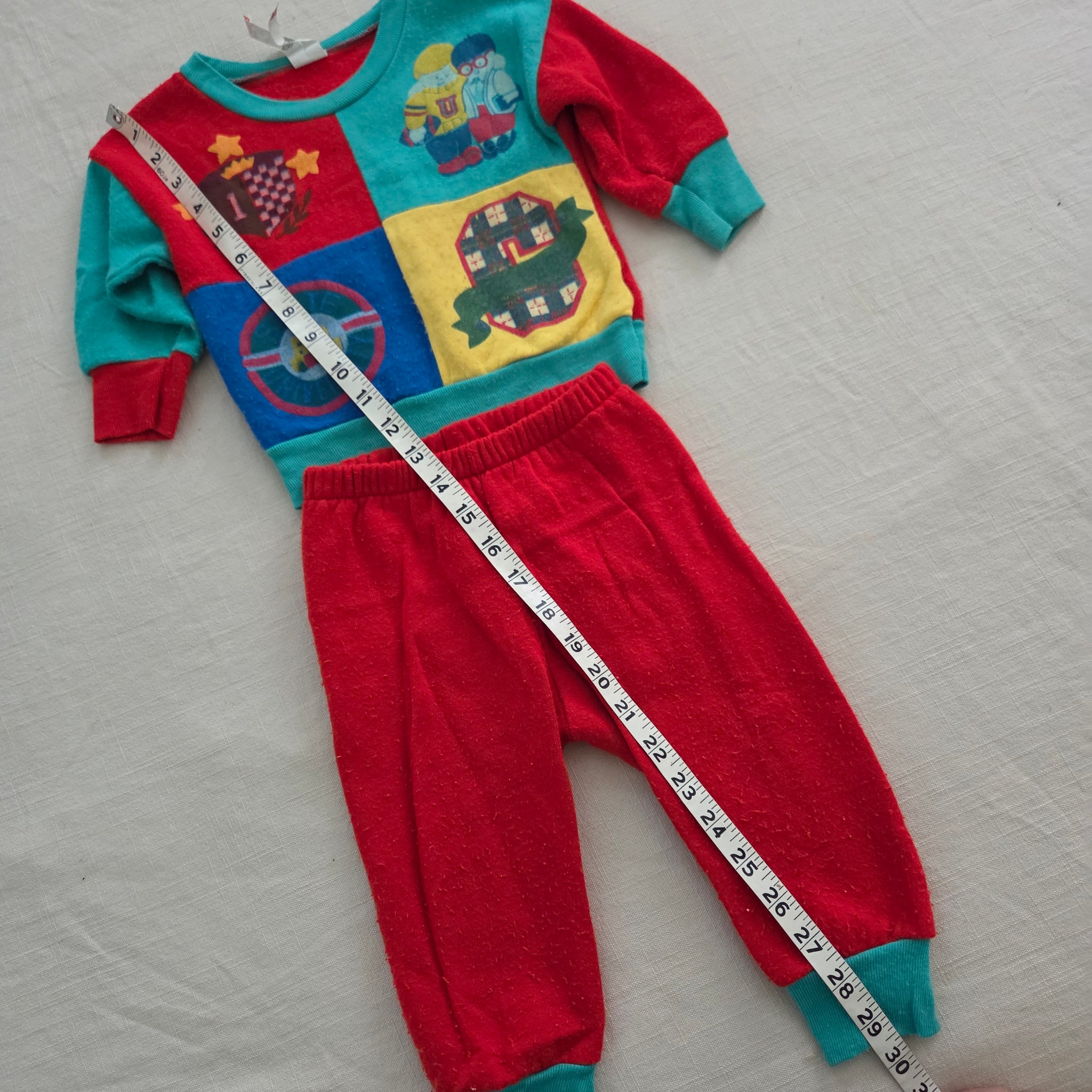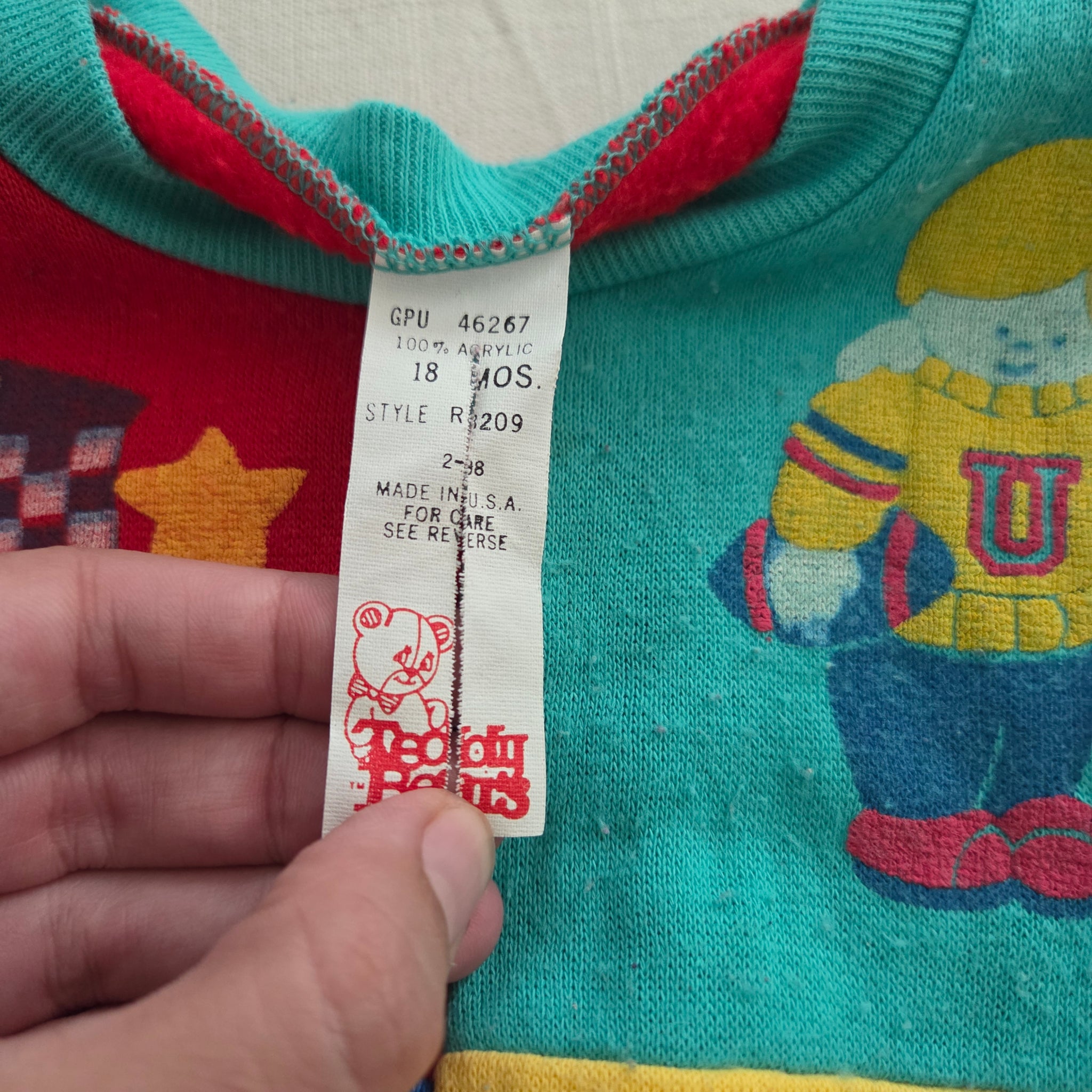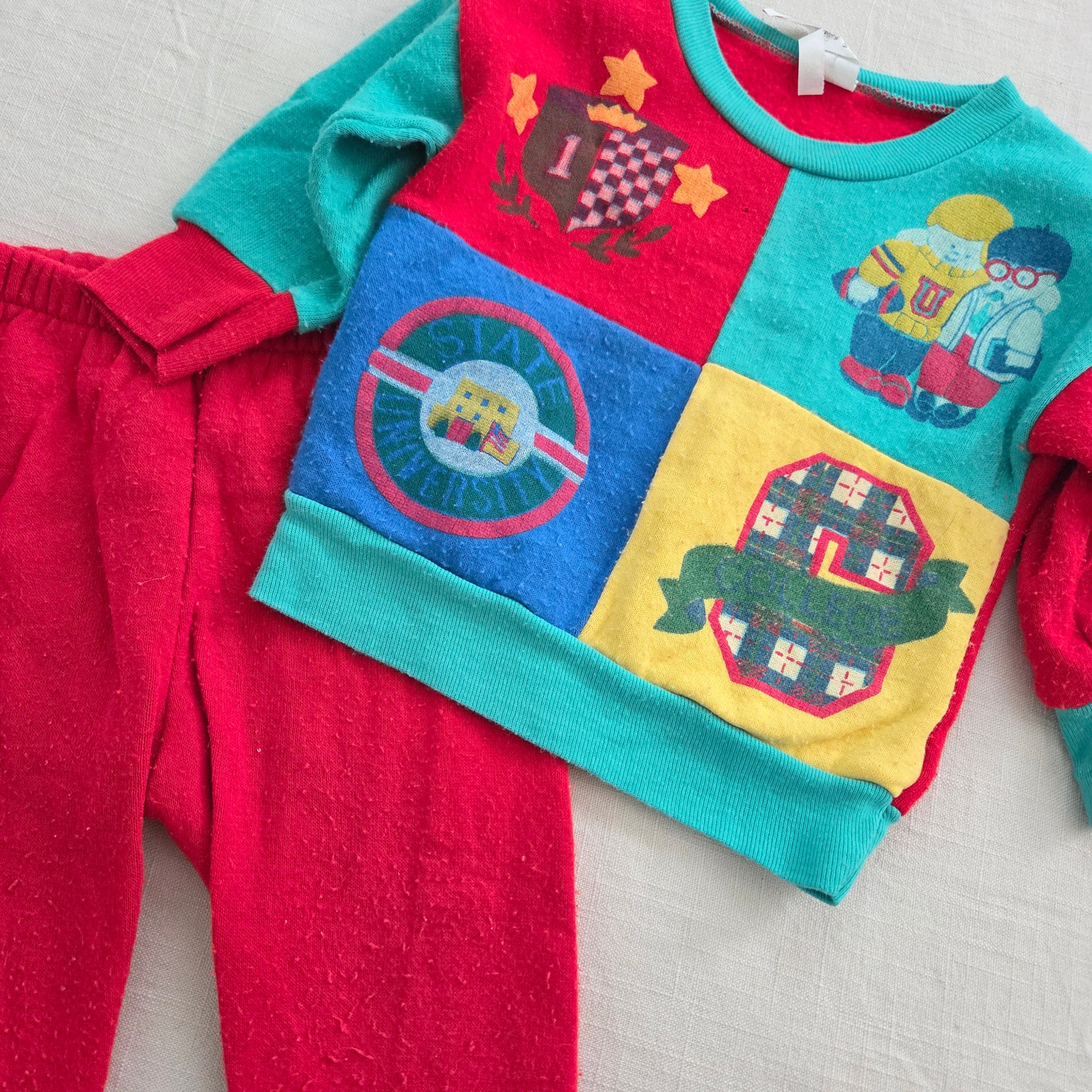 Vintage Teddy Bears brand colorful sweater/shirt and pants set with "university" and football theme! Note sweater/shirt has a tiny hole shown on chest, also some pilling that can easily be shaved off. Please see all photos for condition and measurements