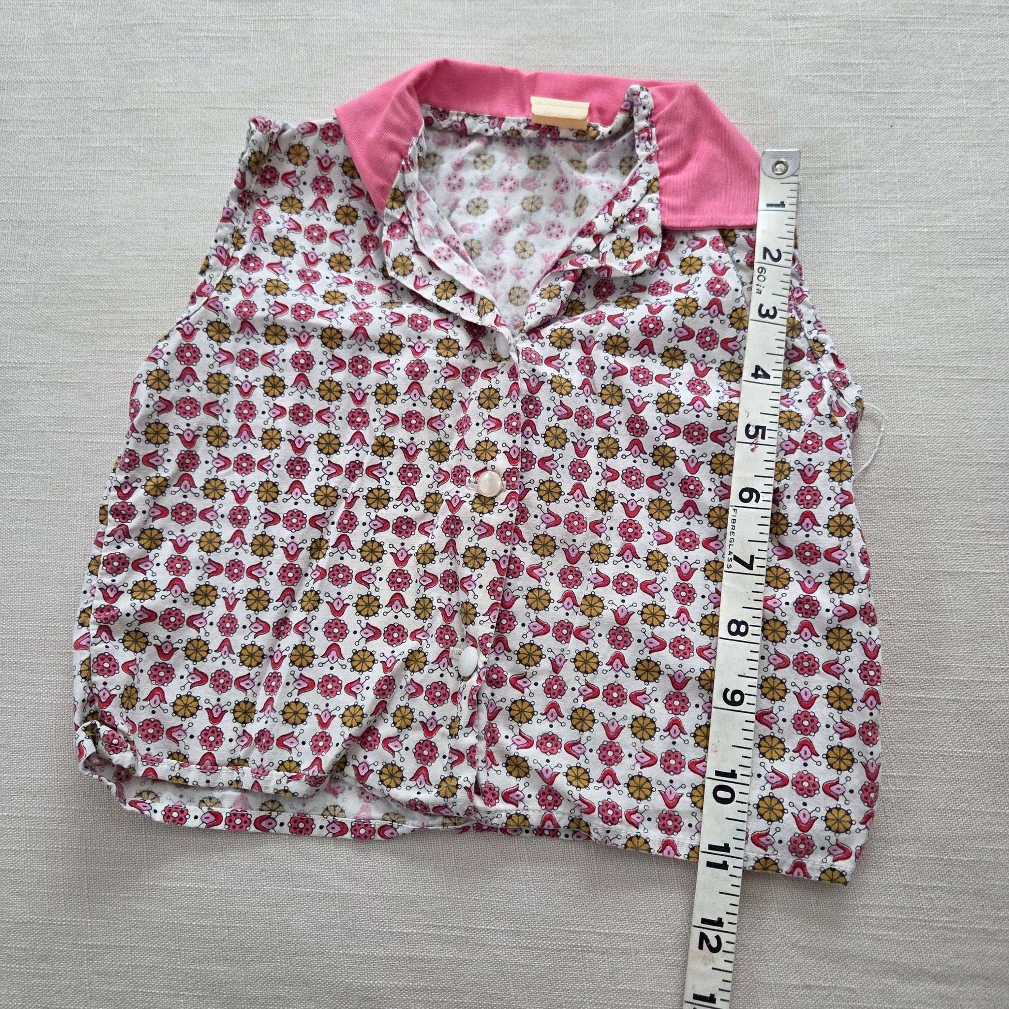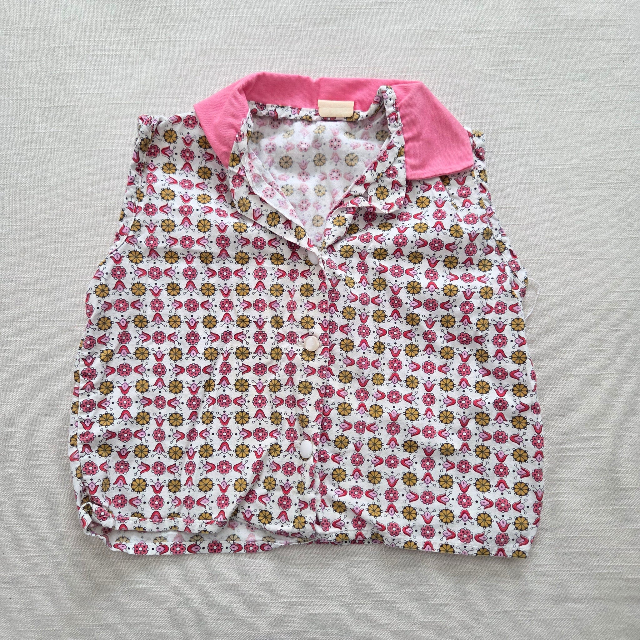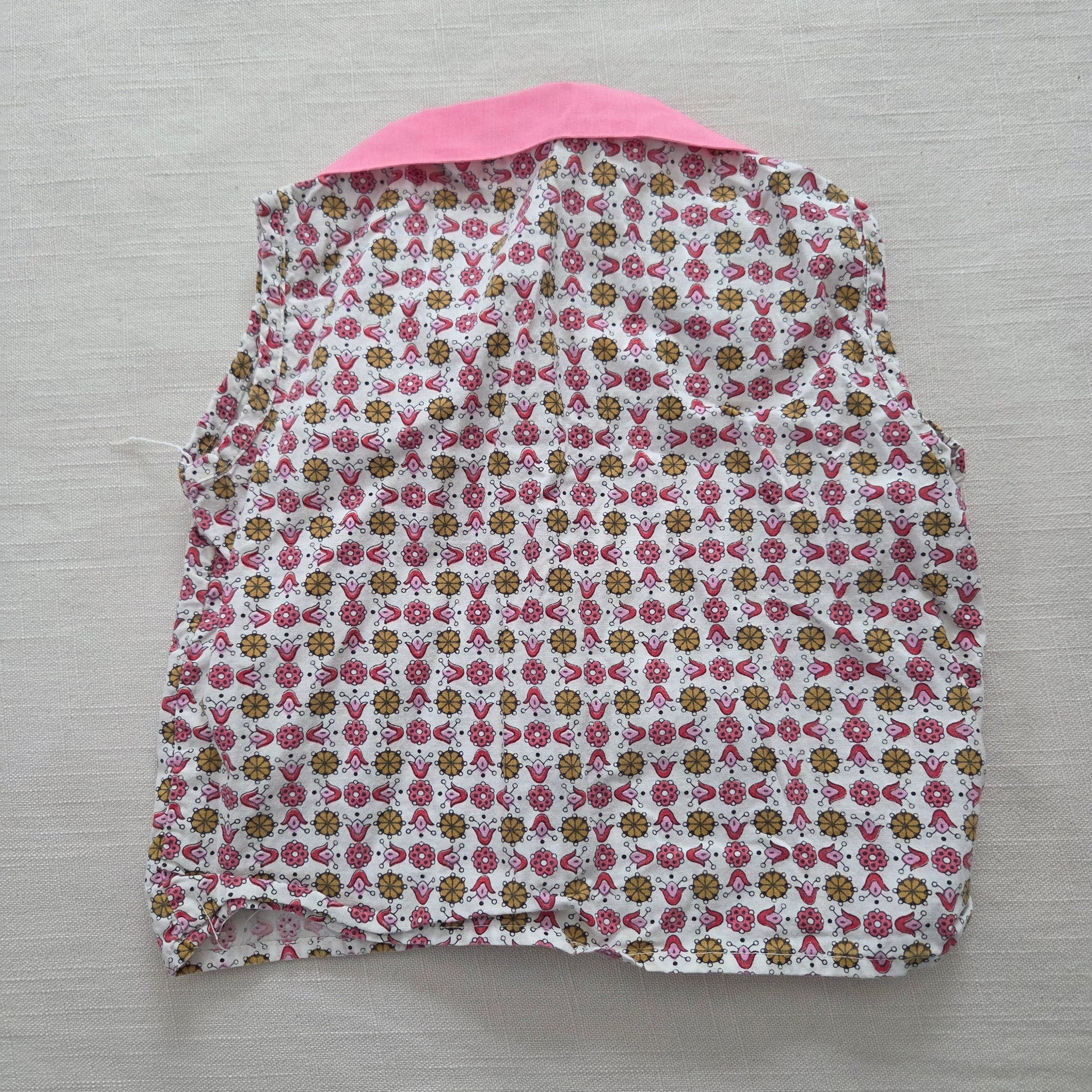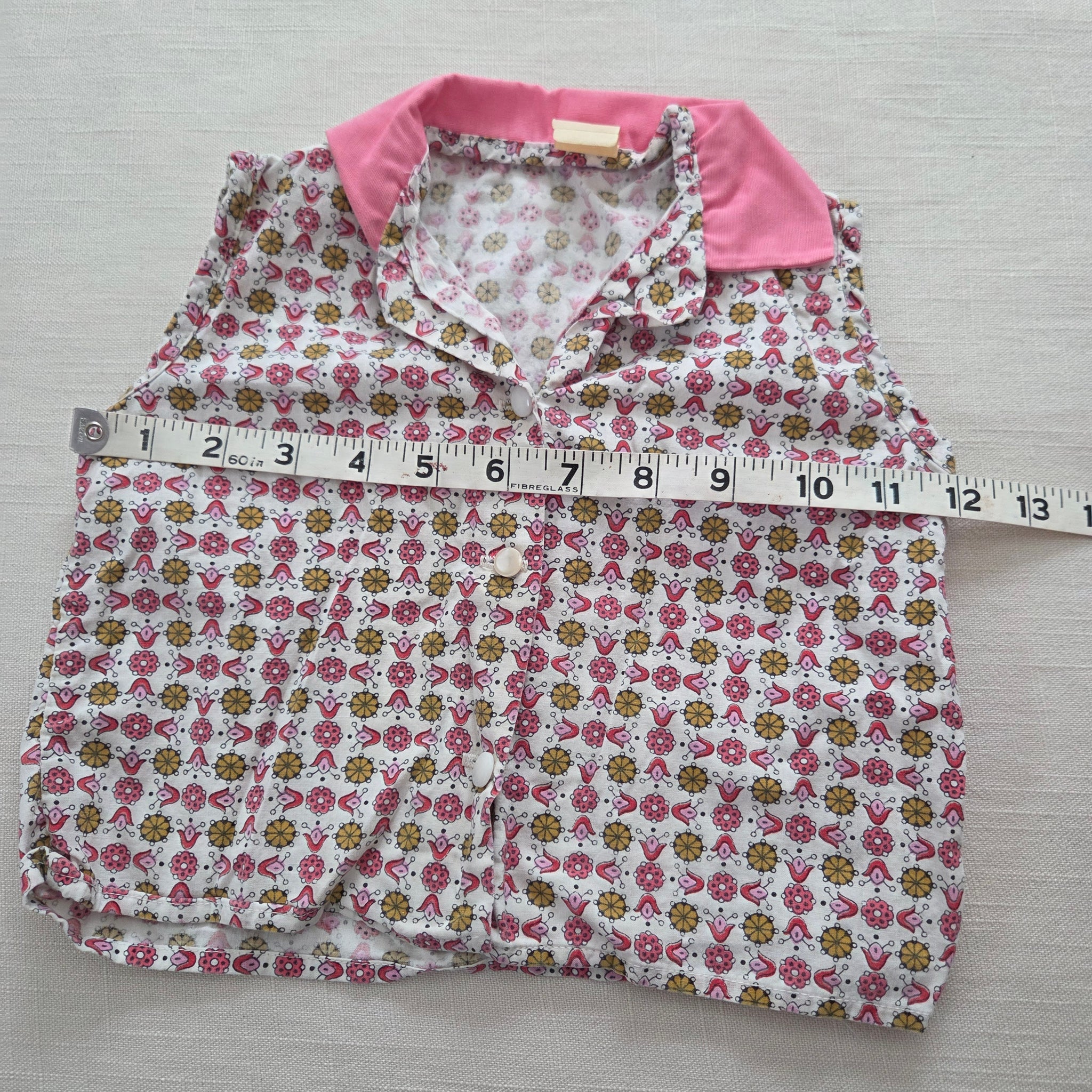 Vintage geometric floral pattern sleeveless buttondown shirt with pink collar! Super groovy! Please see all photos for condition and measurements