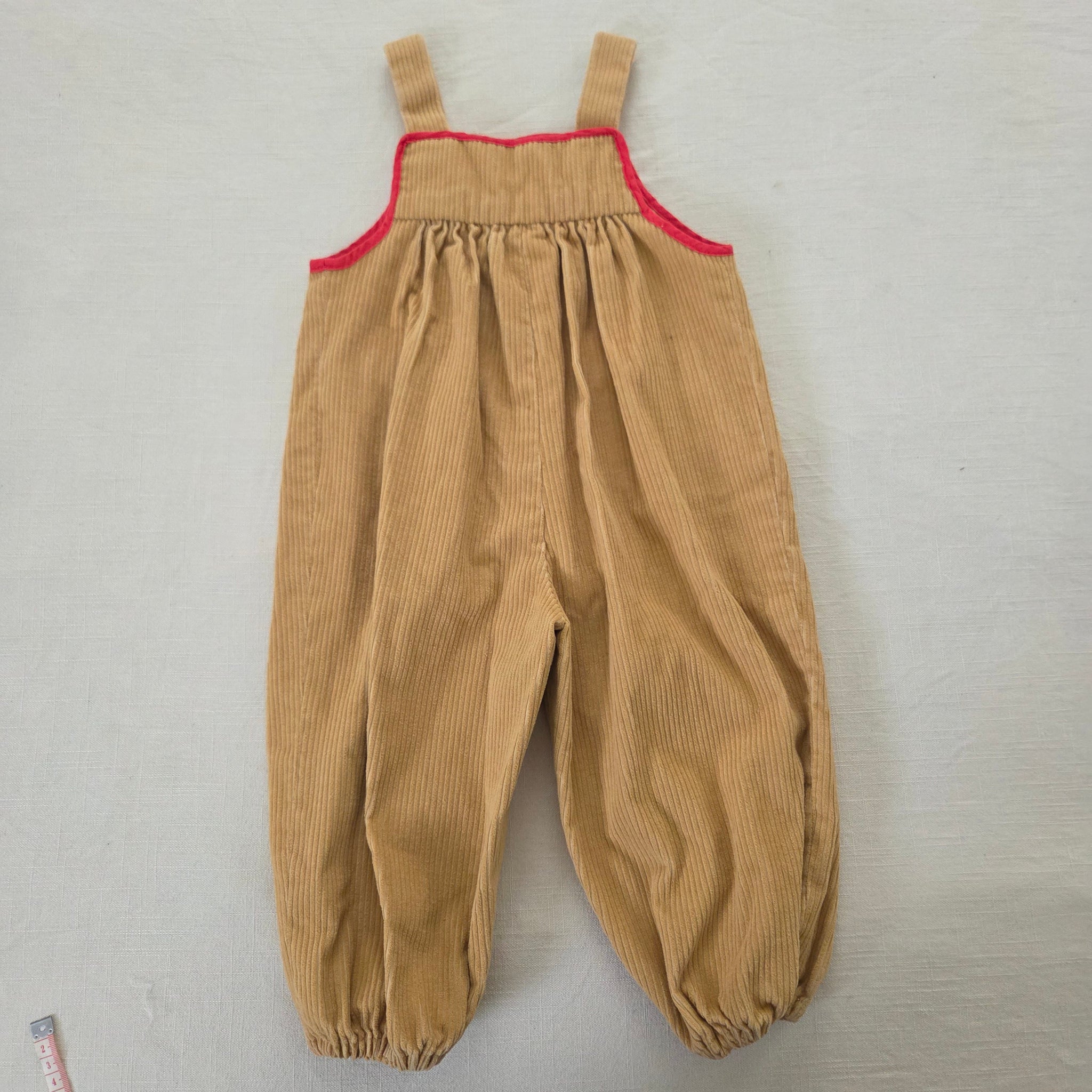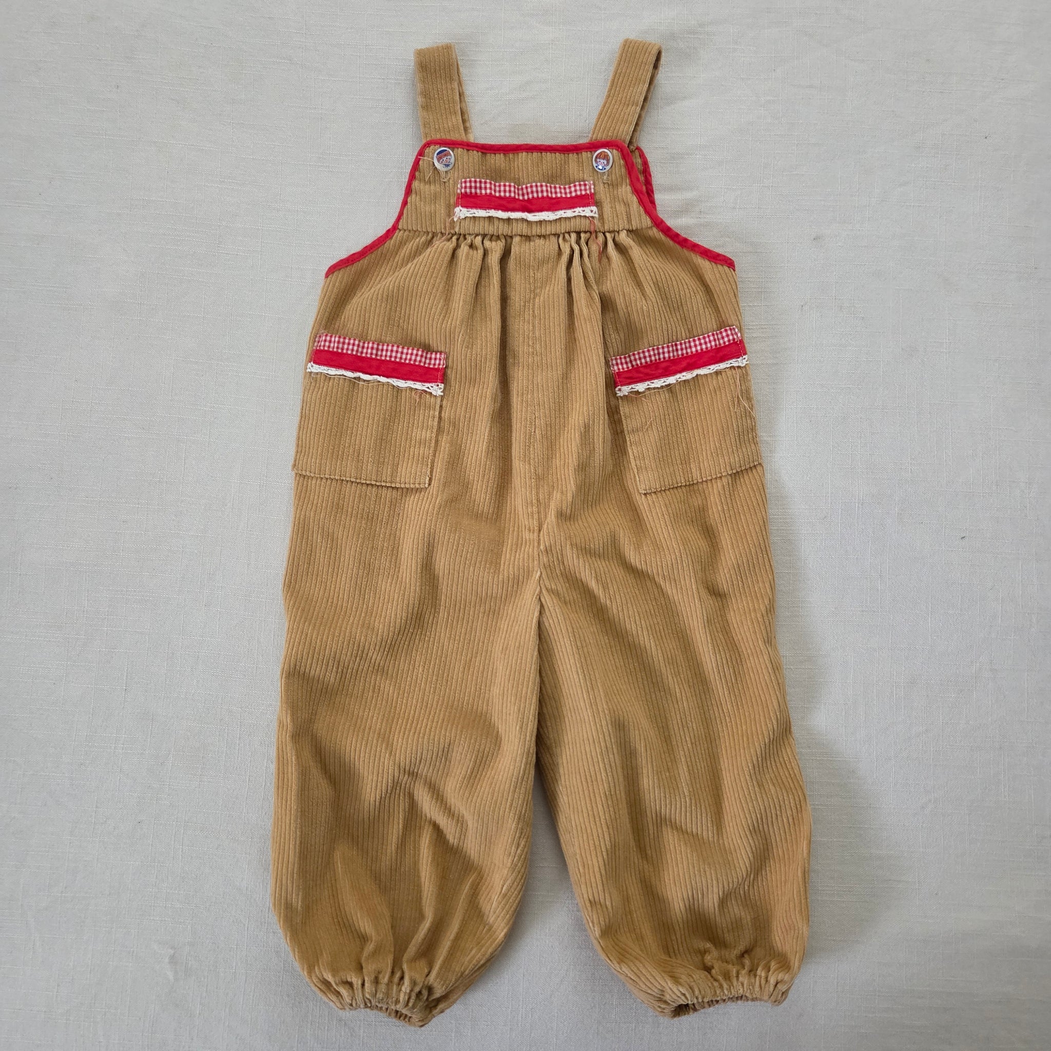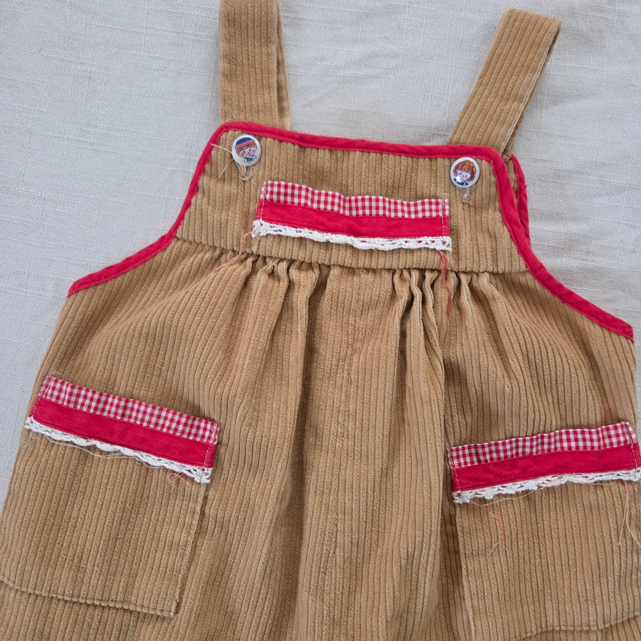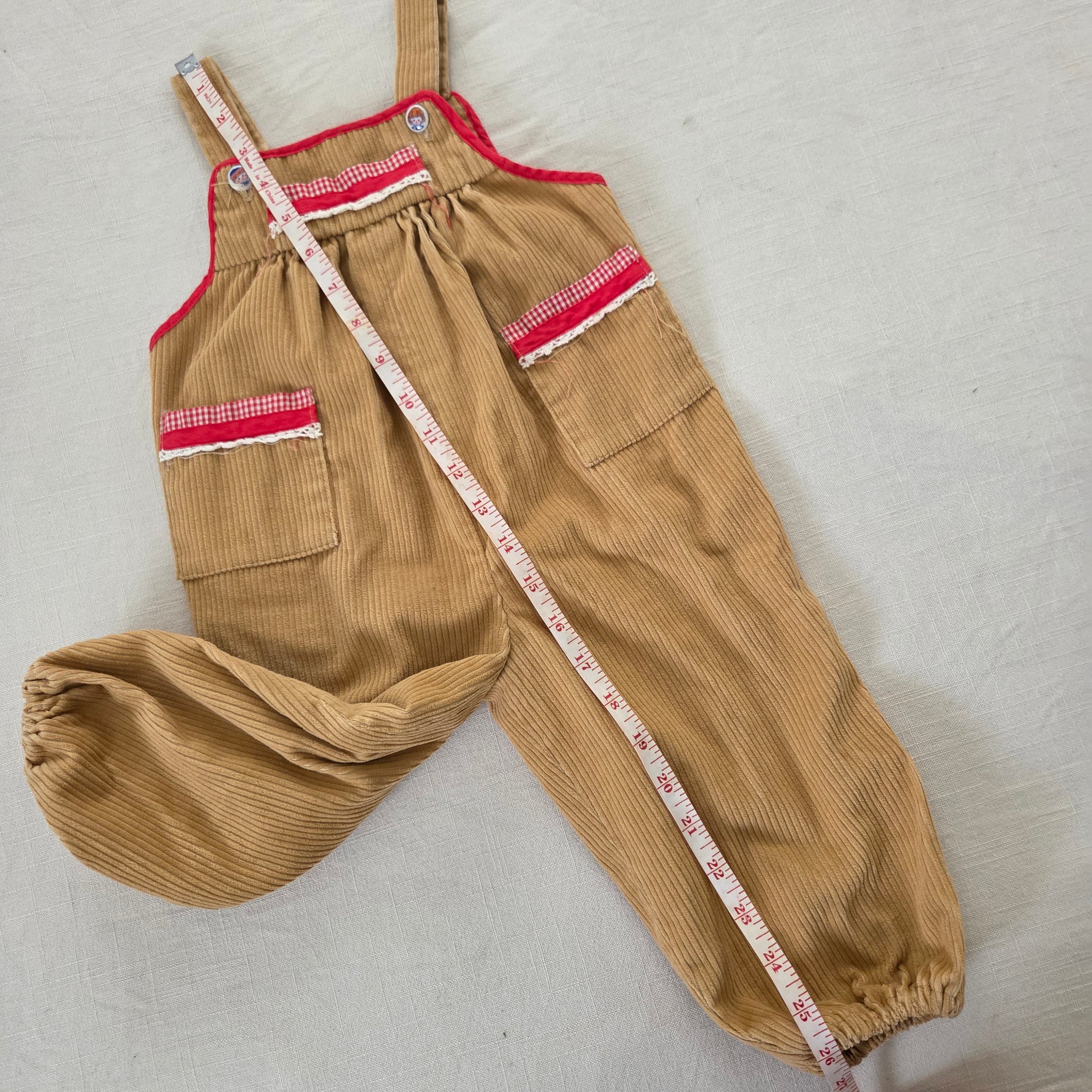 Vintage caramel and red ruffle trim corduroy overalls! Please see all photos for condition and measurements