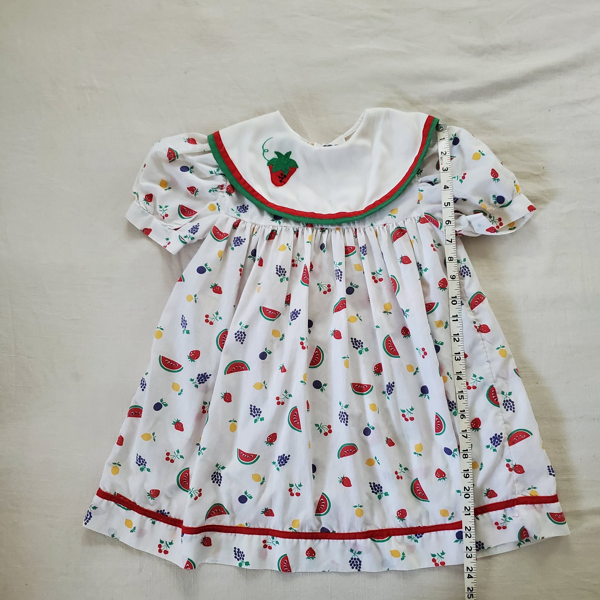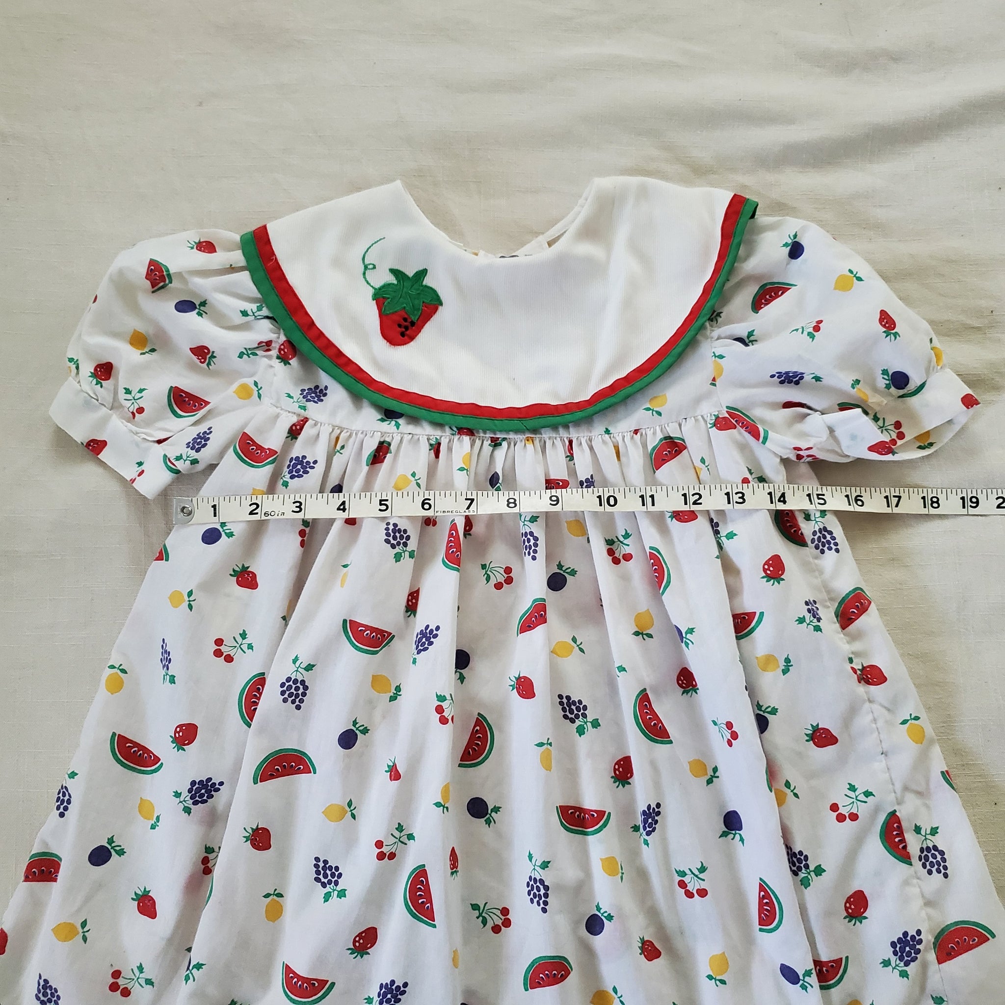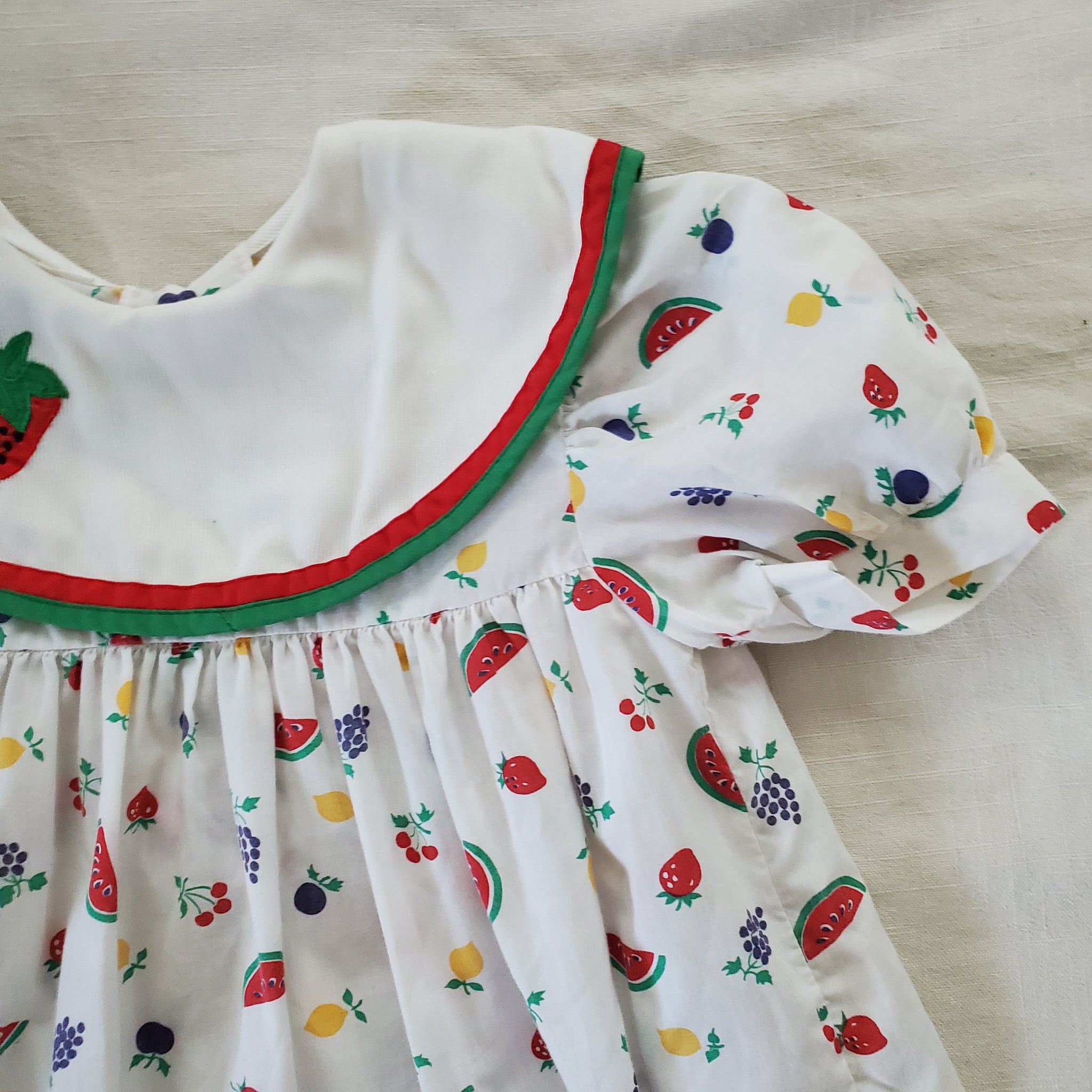 Vintage fruity pattern dress with cute bib and puff sleeves! Please see all photos for condition and measurements
