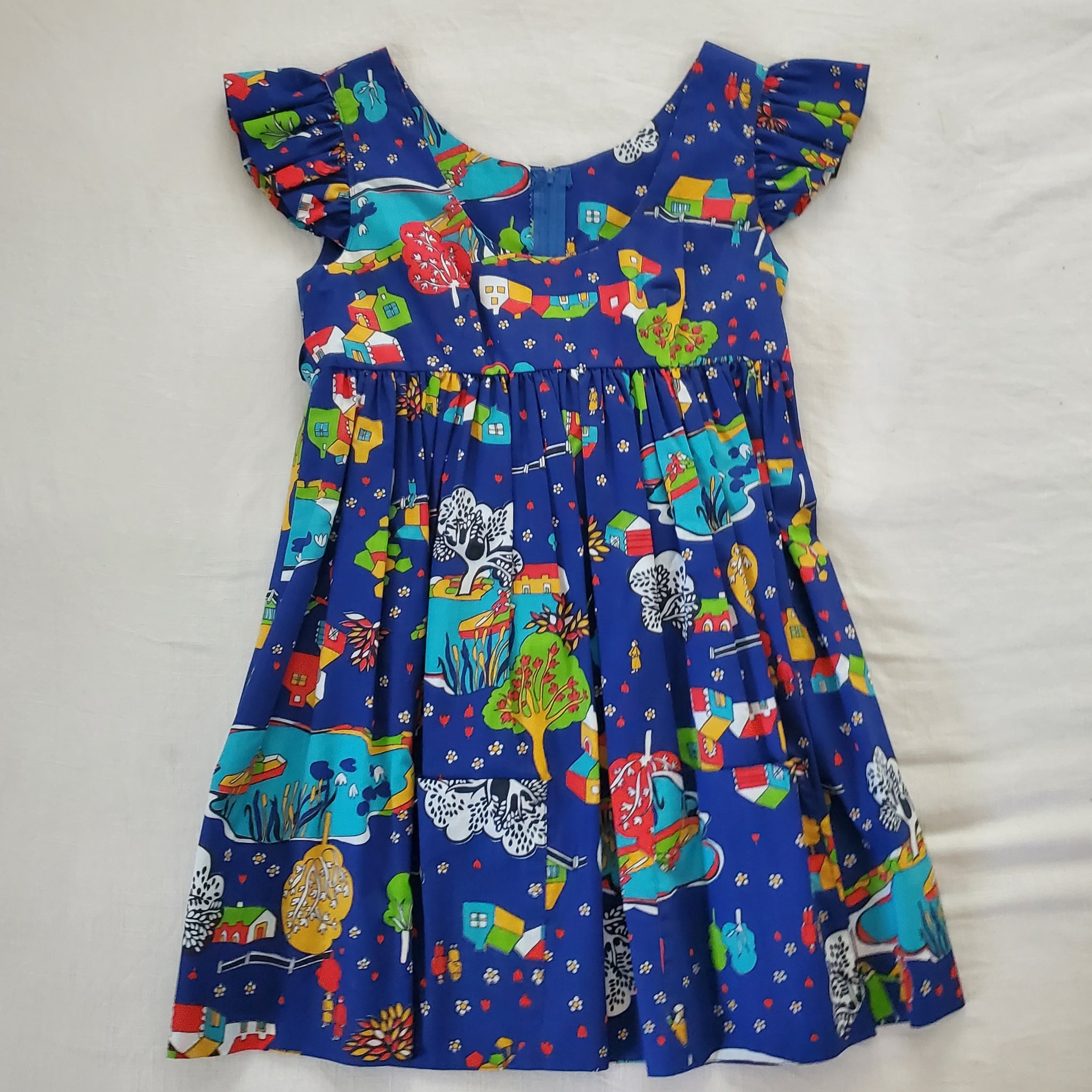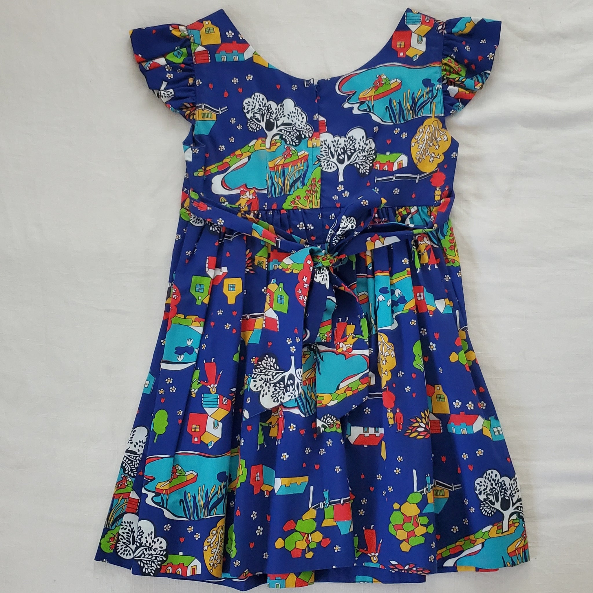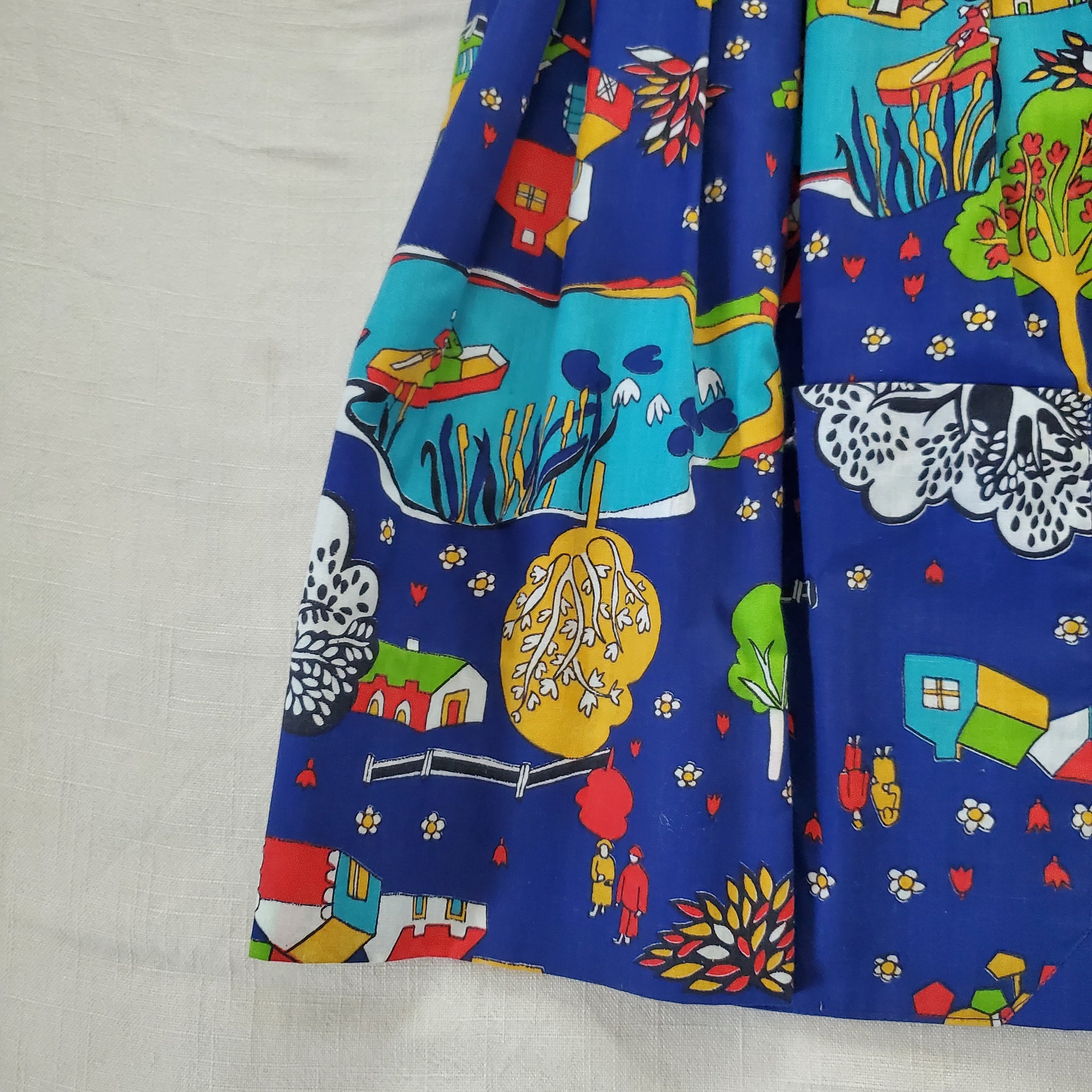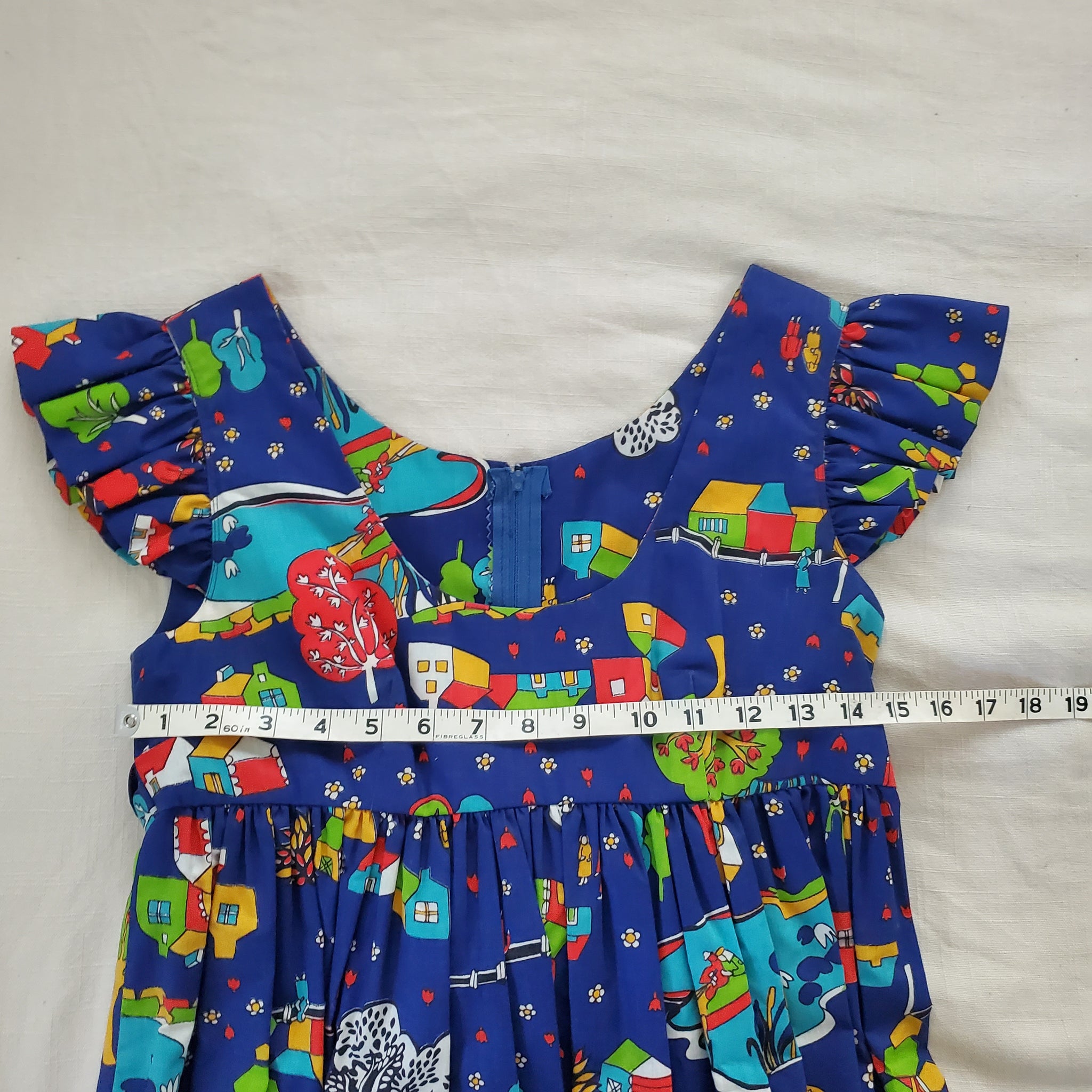 Vintage possibly handmade blue house and landscape dress with ruffle sleeves! Please see all photos for condition and measurements