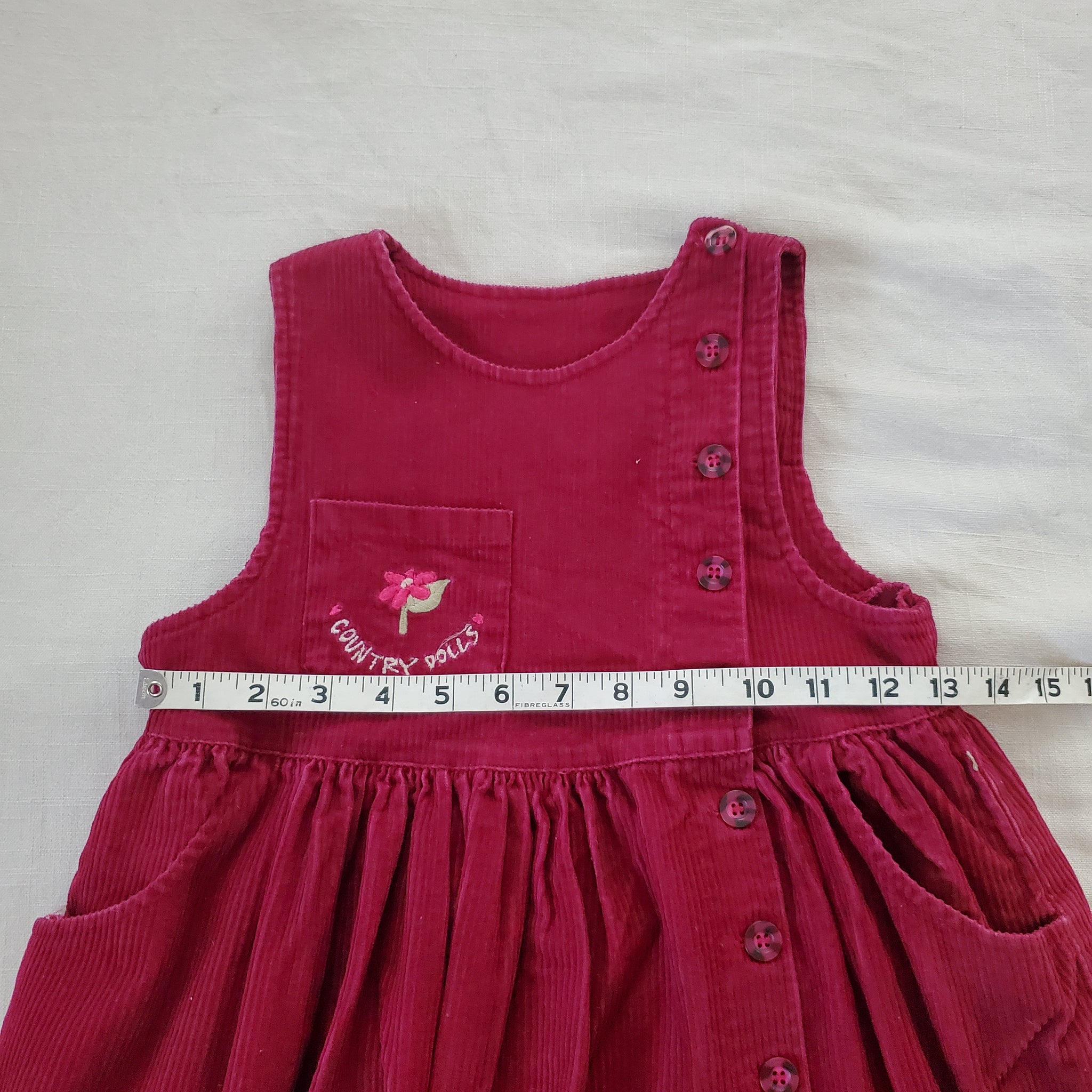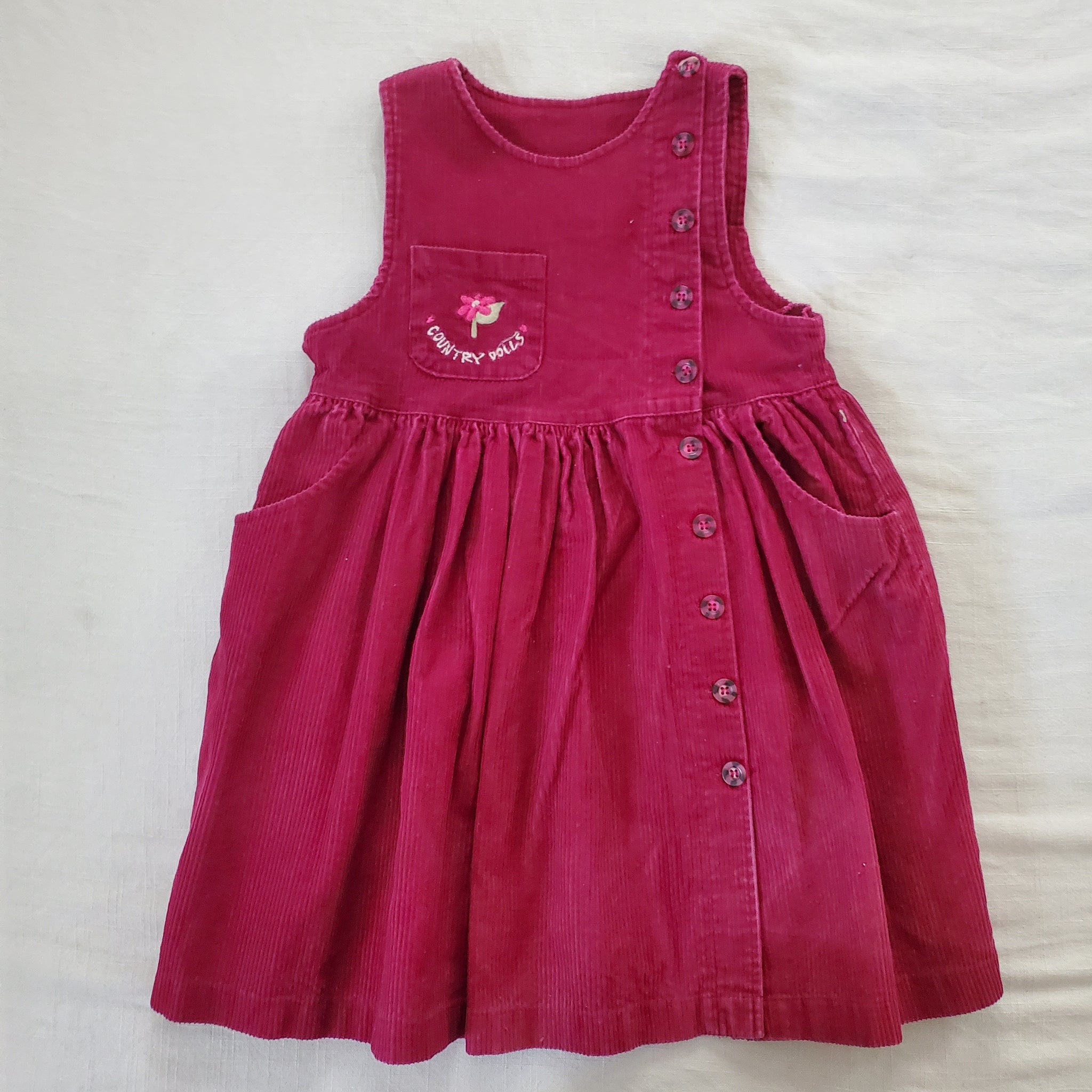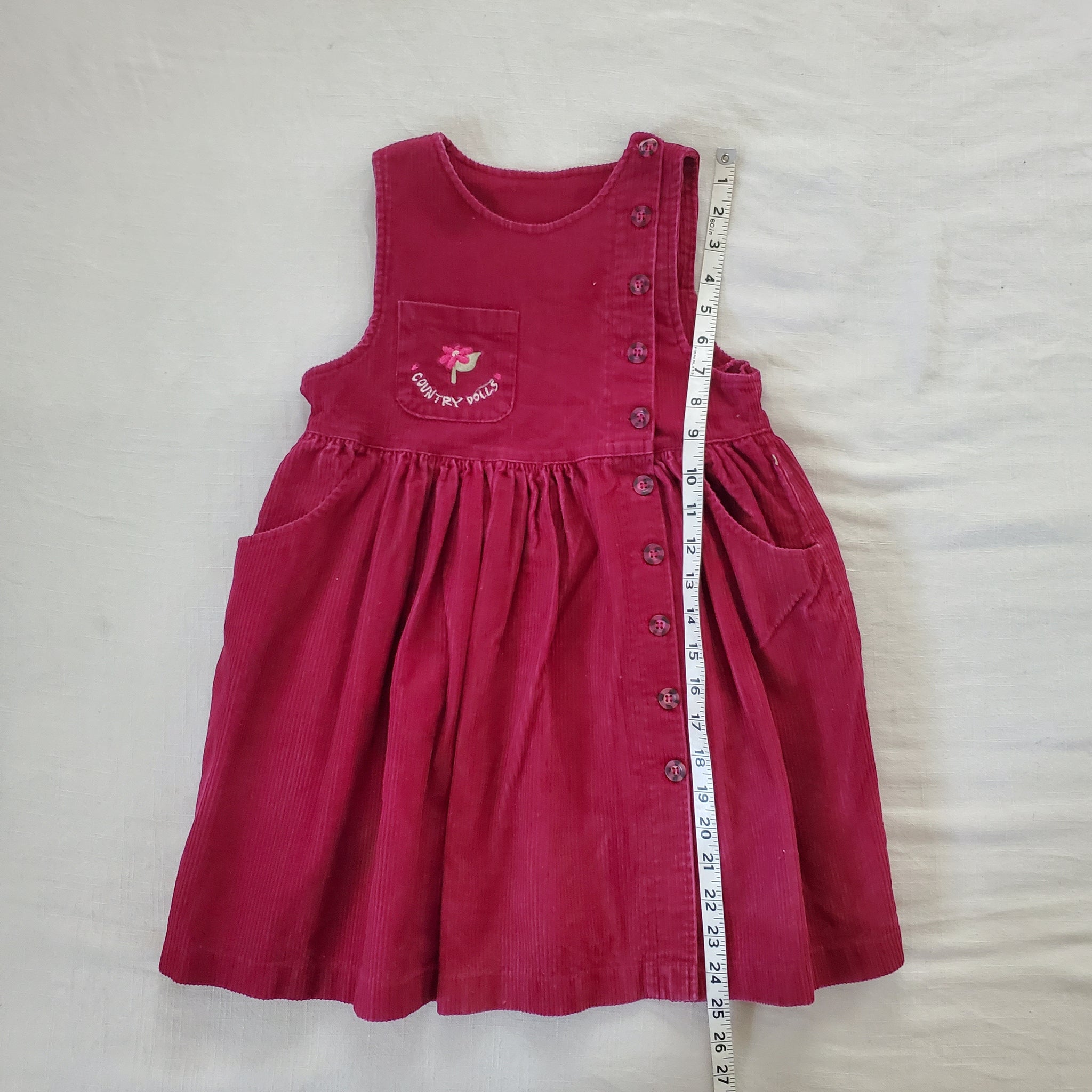 Vintage tage dark red corduroy sleeveless dress with "Country dolls" embroidered on chest! Perfect for layering! Please see all photos for condition and measurements