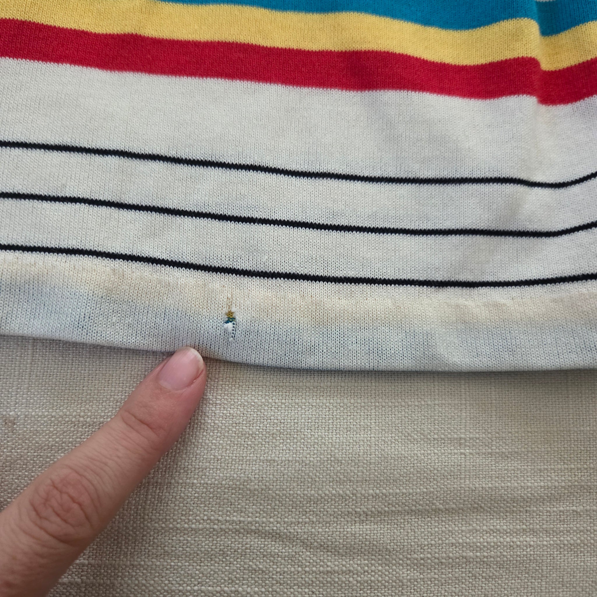 Vintage Healthtex white and bright red/blue/yellow striped long sleeve shirt with collar! Note one little hole shown near hem. Please see all photos for condition and measurements