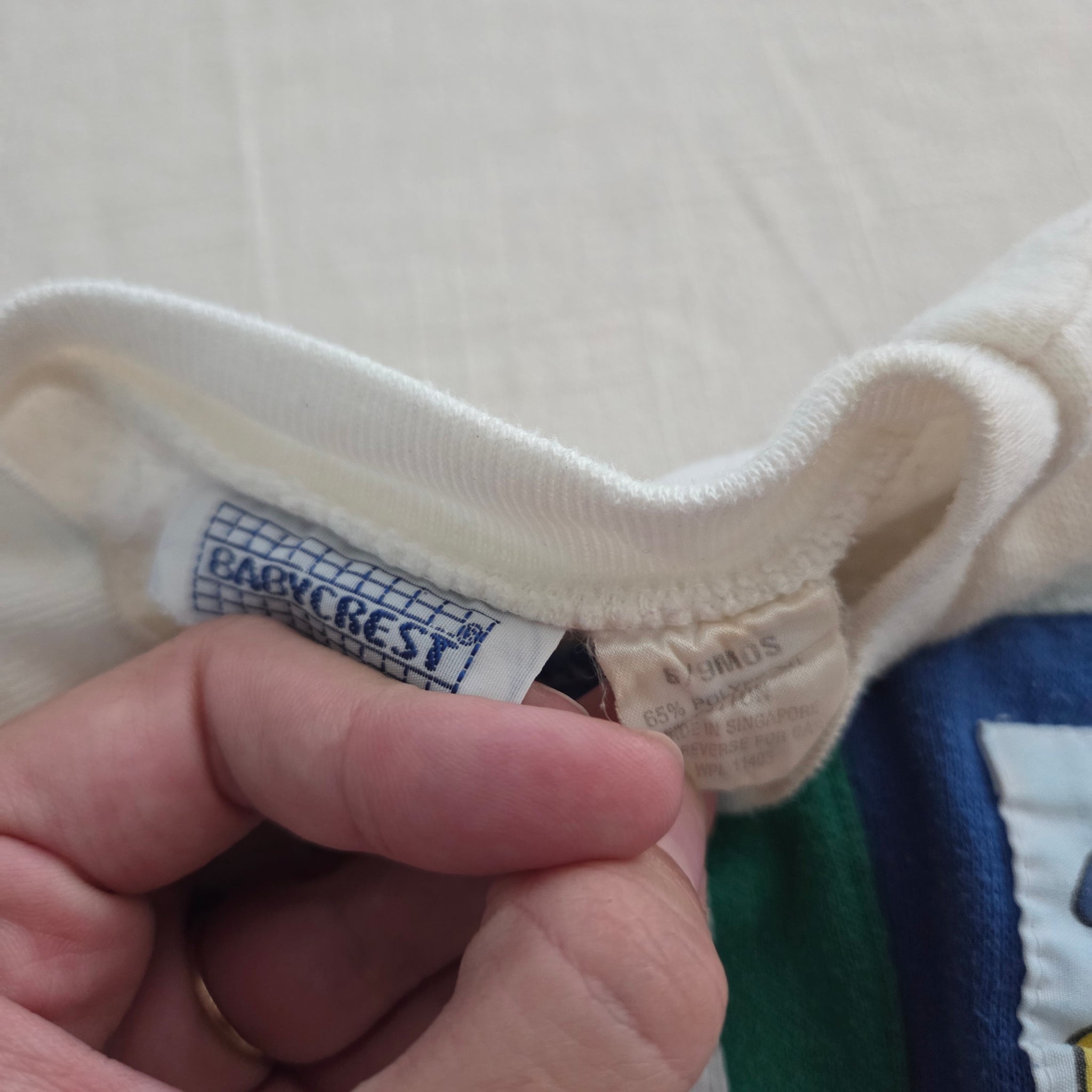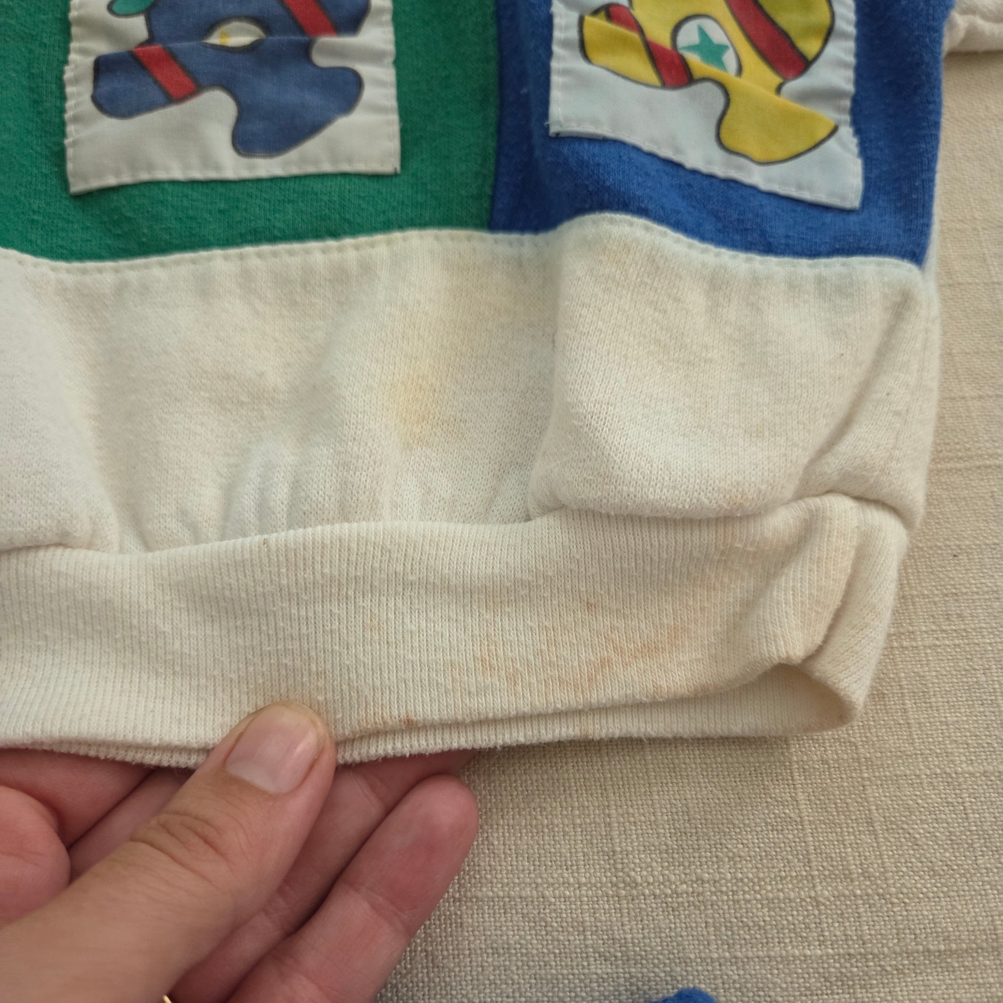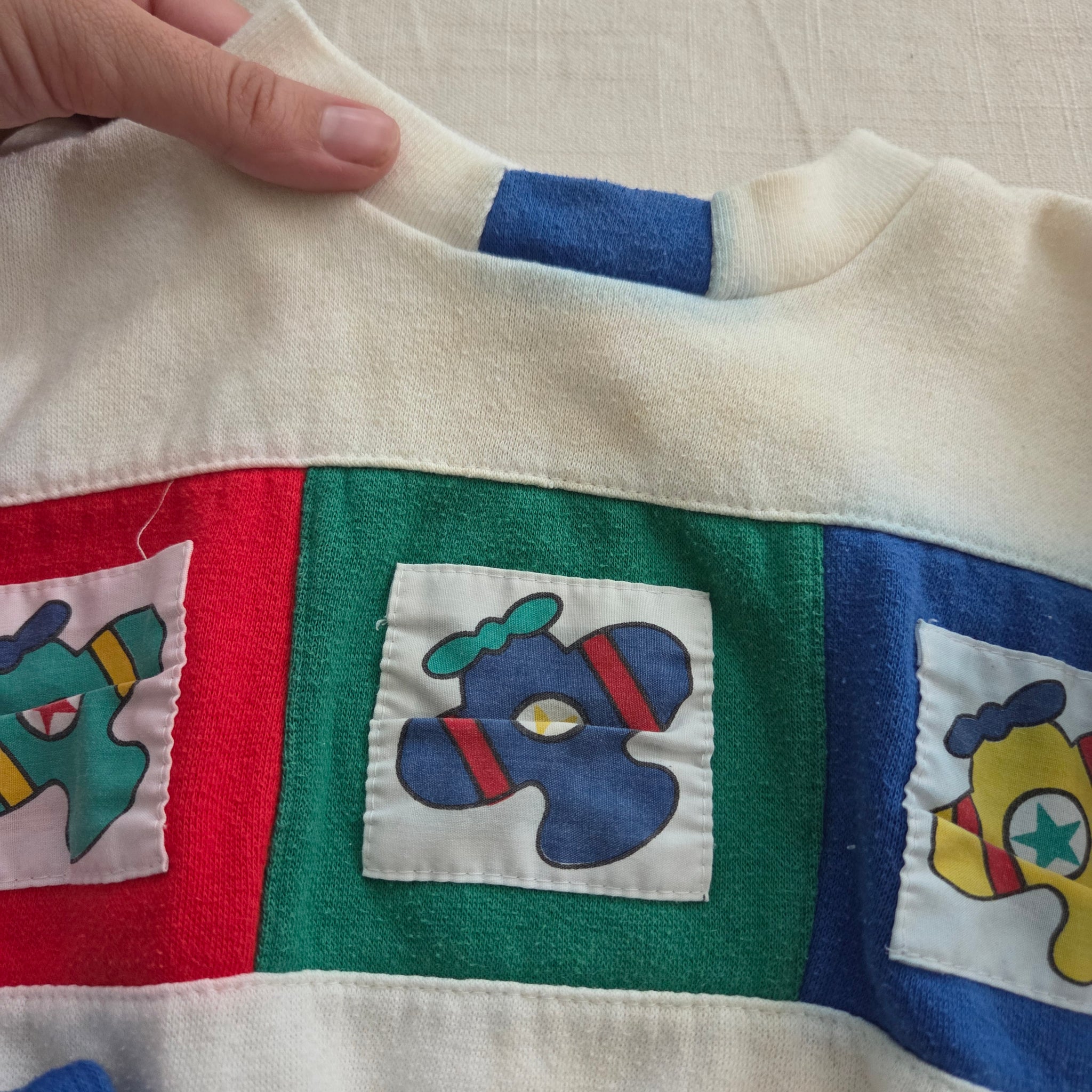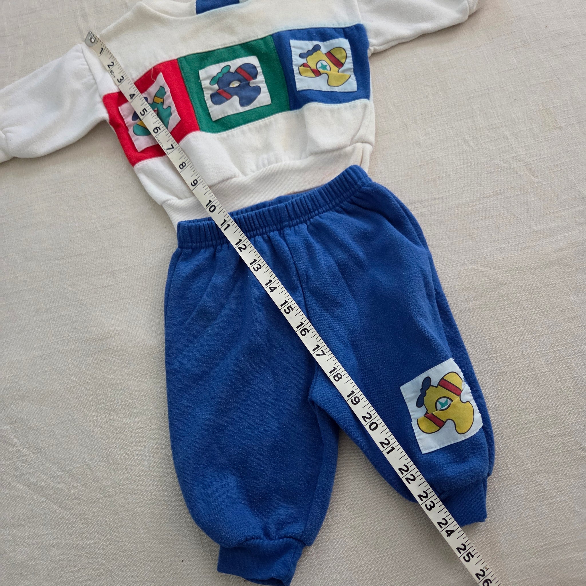 Vintage Baby Crest brand sweater and blue pants set with airplane details on both! Note white sweater has color bleed on neck and light spots on belly shown. Please see all photos for condition and measurements