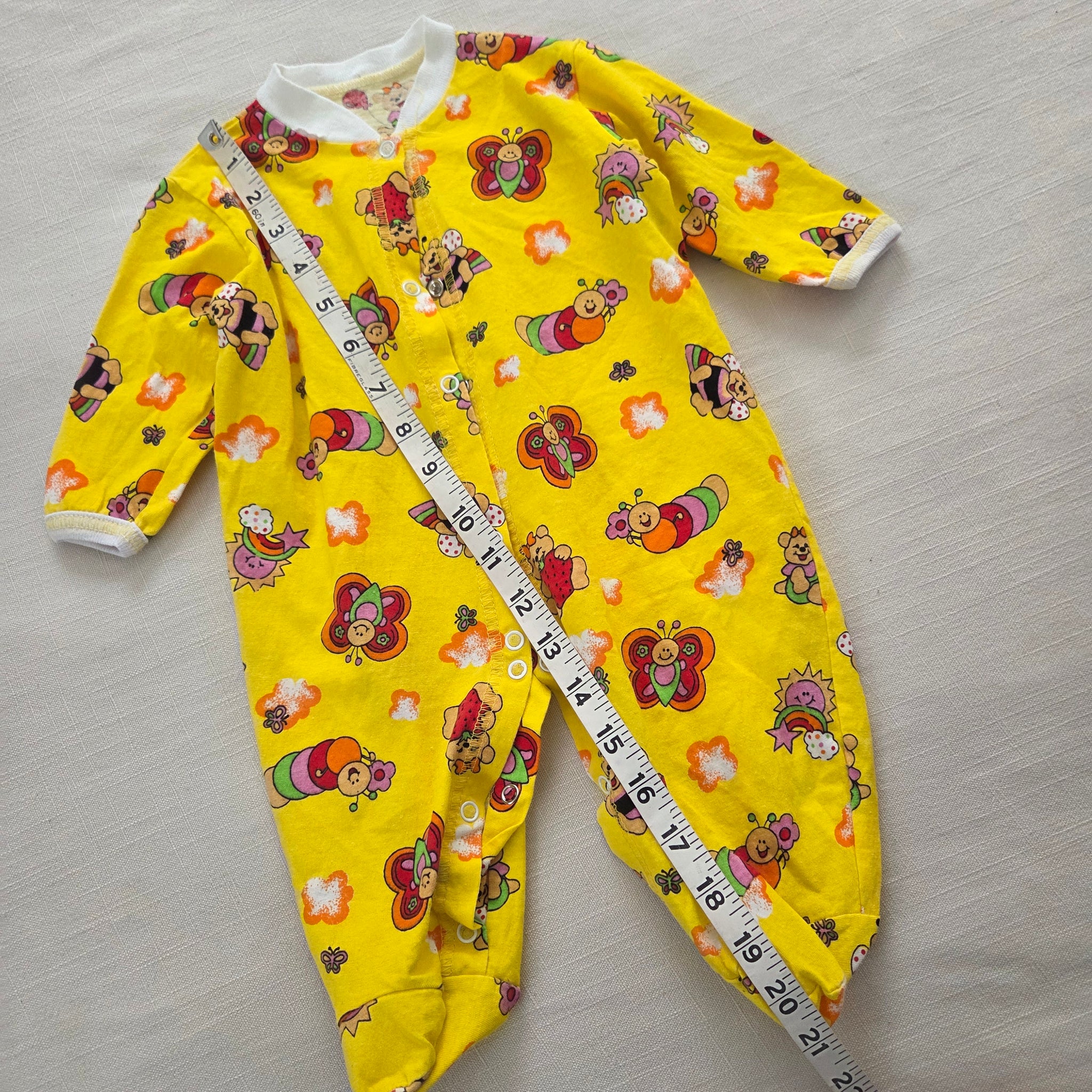 Vintage yellow footed pajamas with bears and butterflies and caterpillars all over! No tags. Please see all photos for condition and measurements