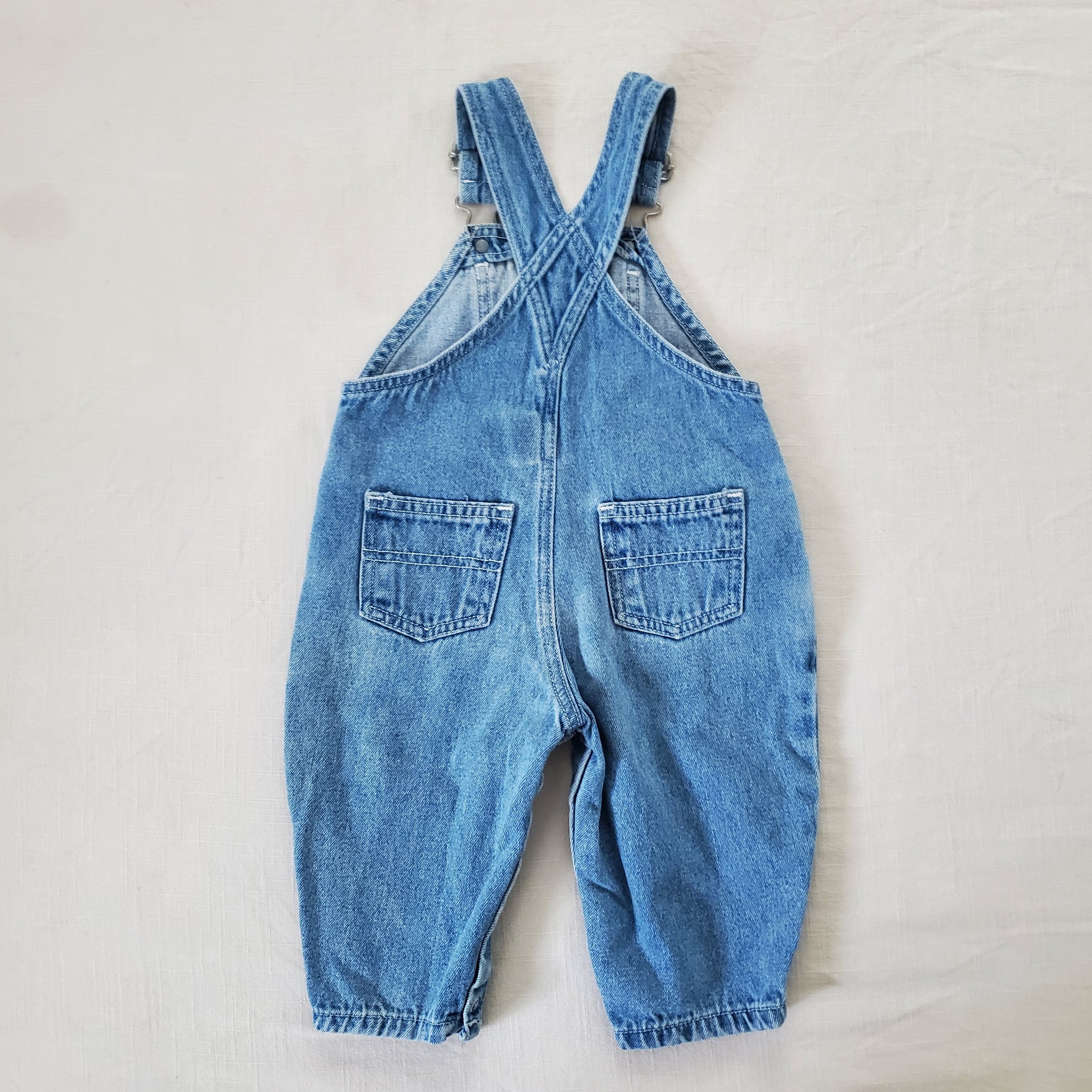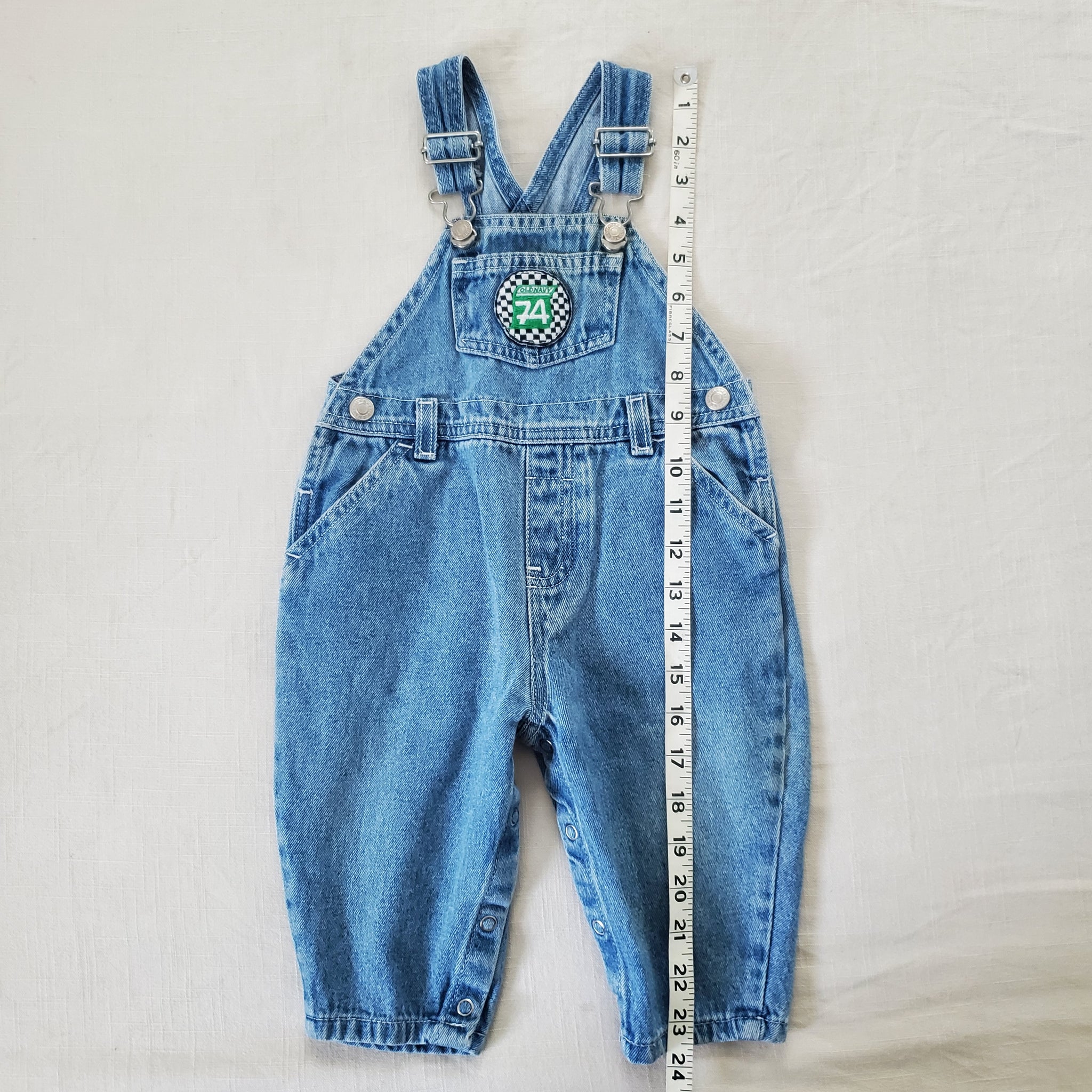 Vintage Old Navy denim overalls with cute patch on chest! Please see all photos for condition and measurements