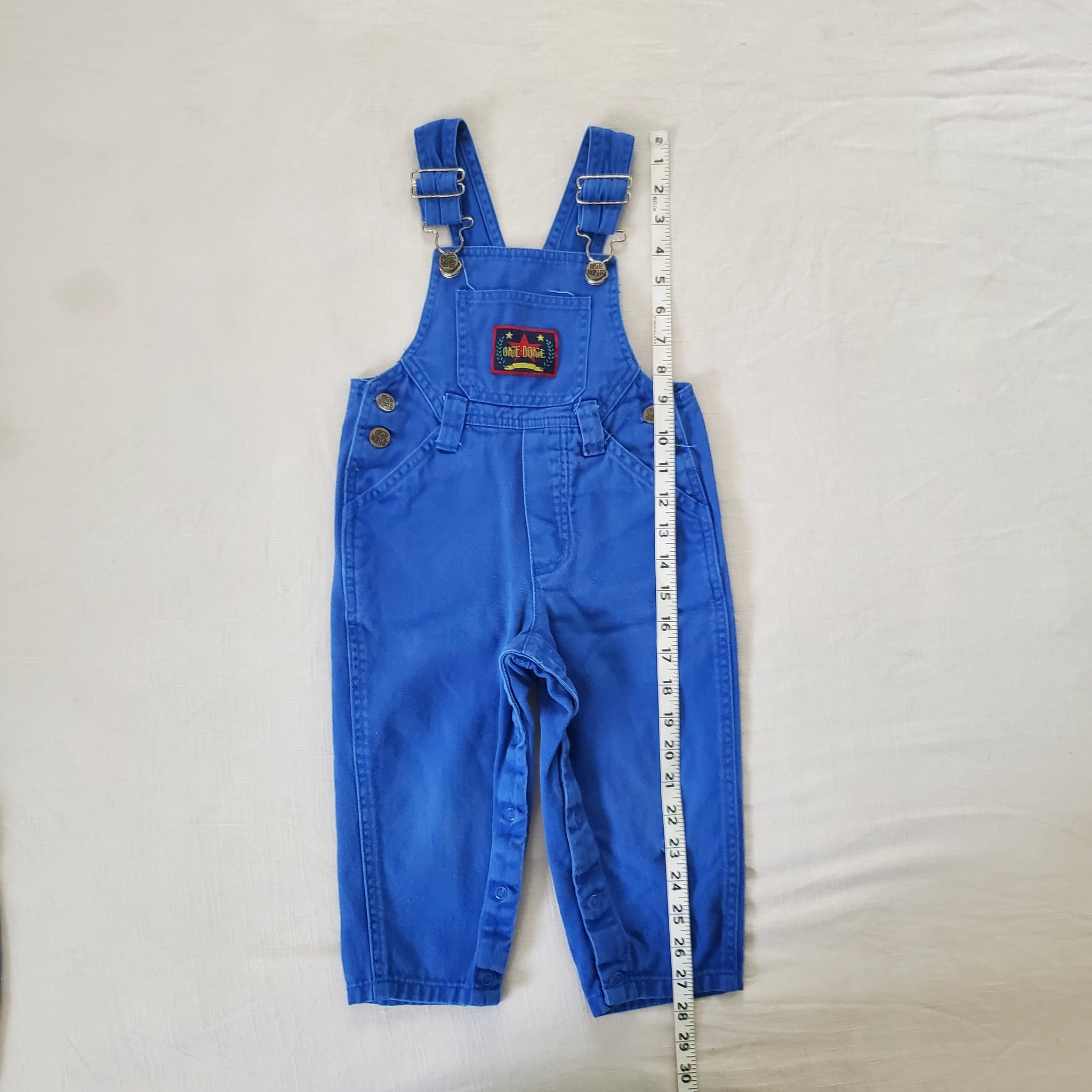 Vintage Okie Dokie blue denim overalls! Note a hole below one knee shown. Please see all photos for condition and measurements