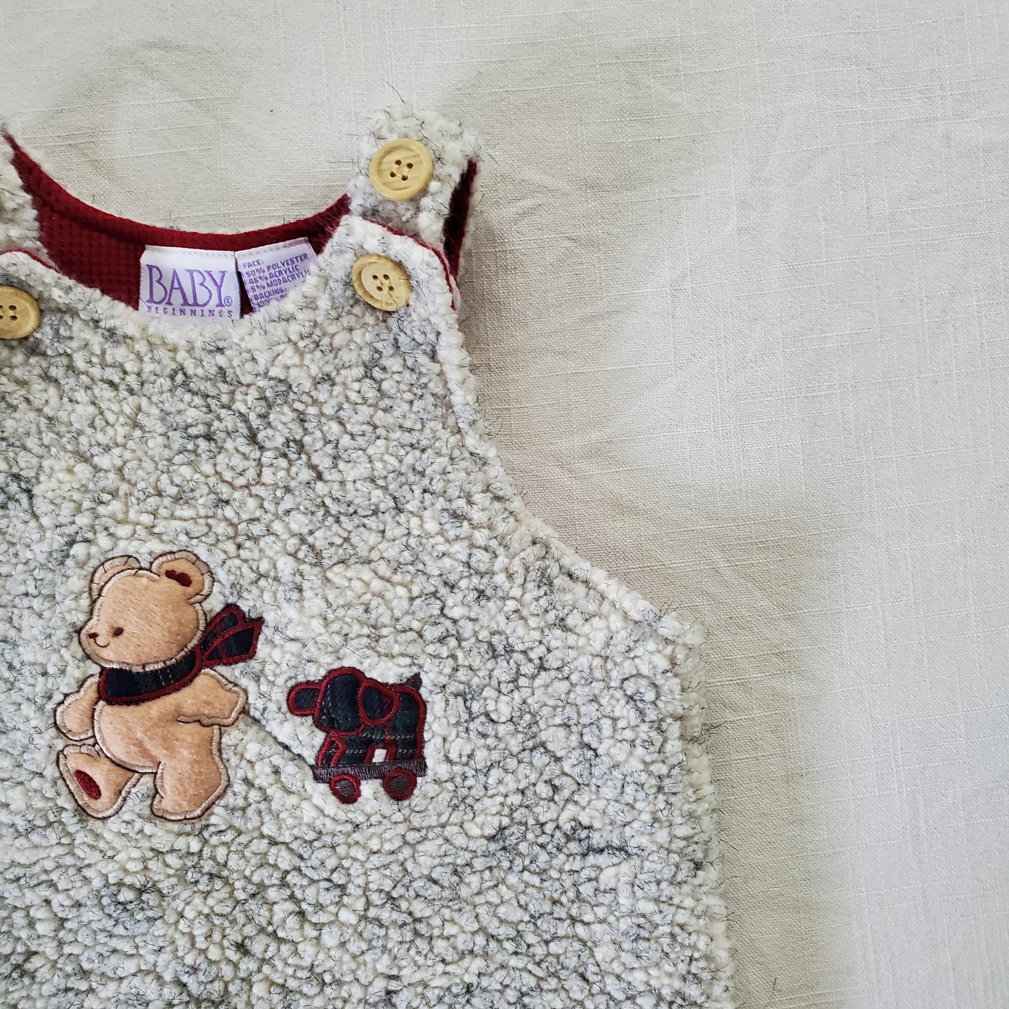 Vintage Baby Headquarters brand tan sherpa overalls with bear pulling a horse toy embroidery on chest! Please see all photos for condition and measurements