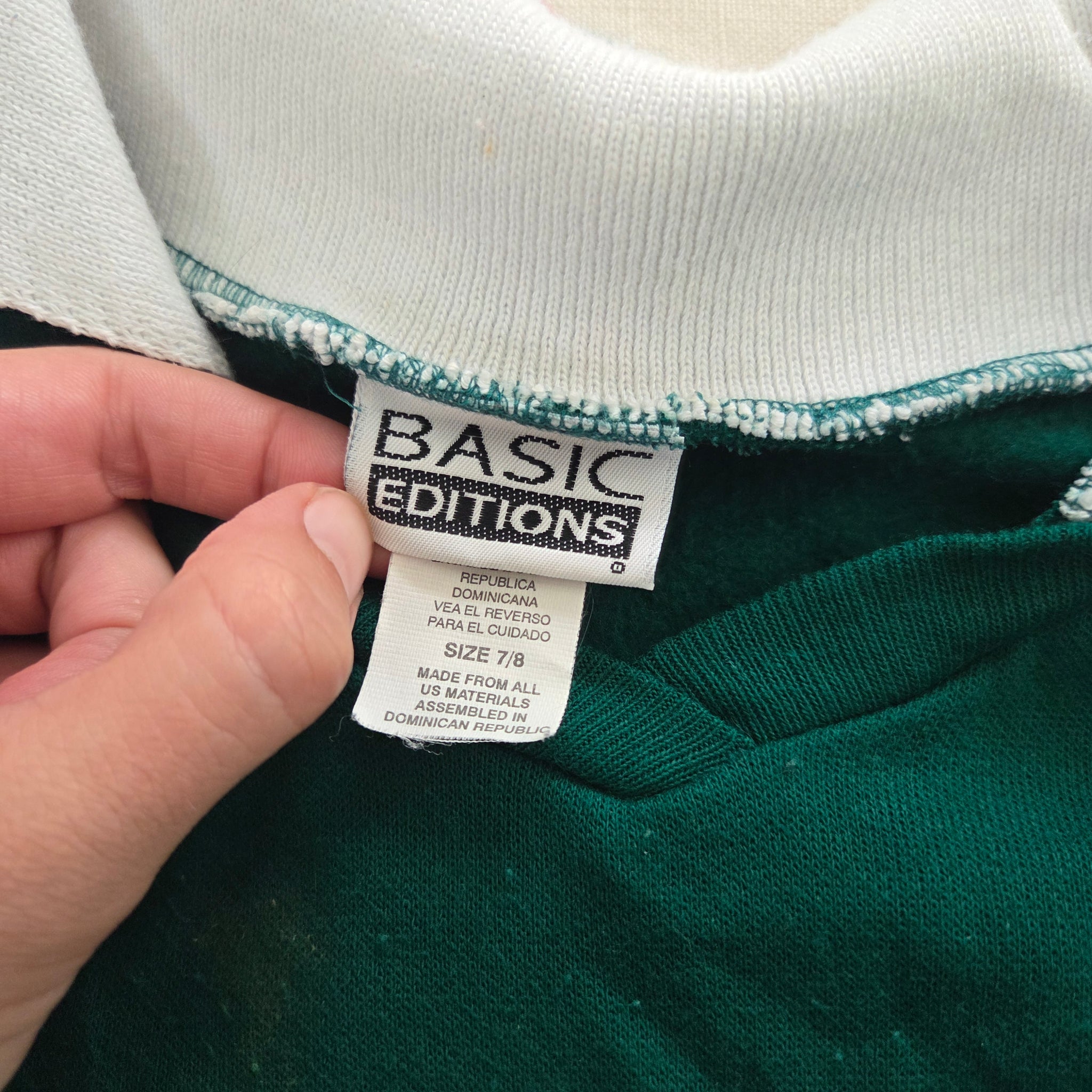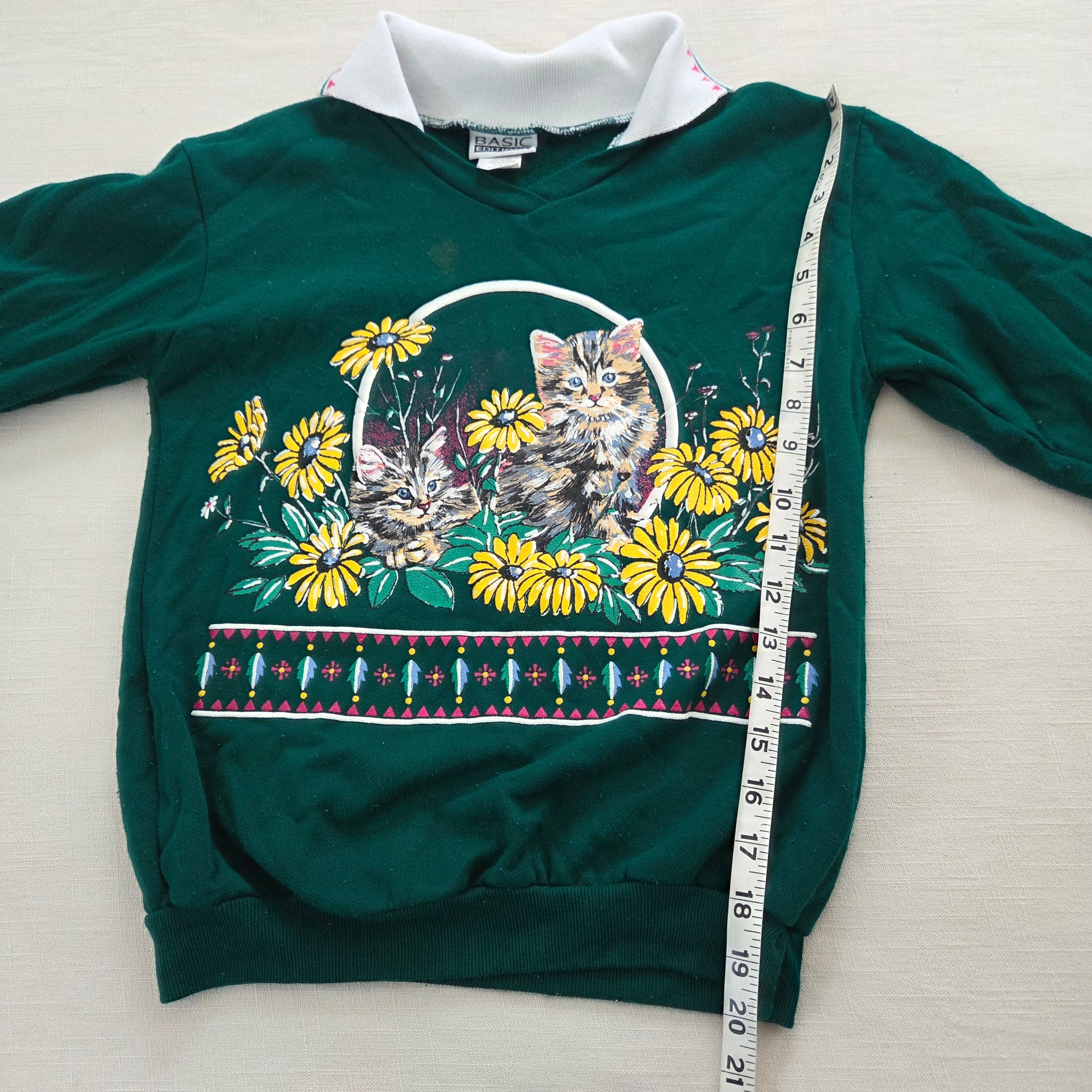 Vintage 90s Basic Editions green pullover sweatshirt with the cutest kitty graphic! Note two marks on the neck that may wash out. Please see photos for condition and details