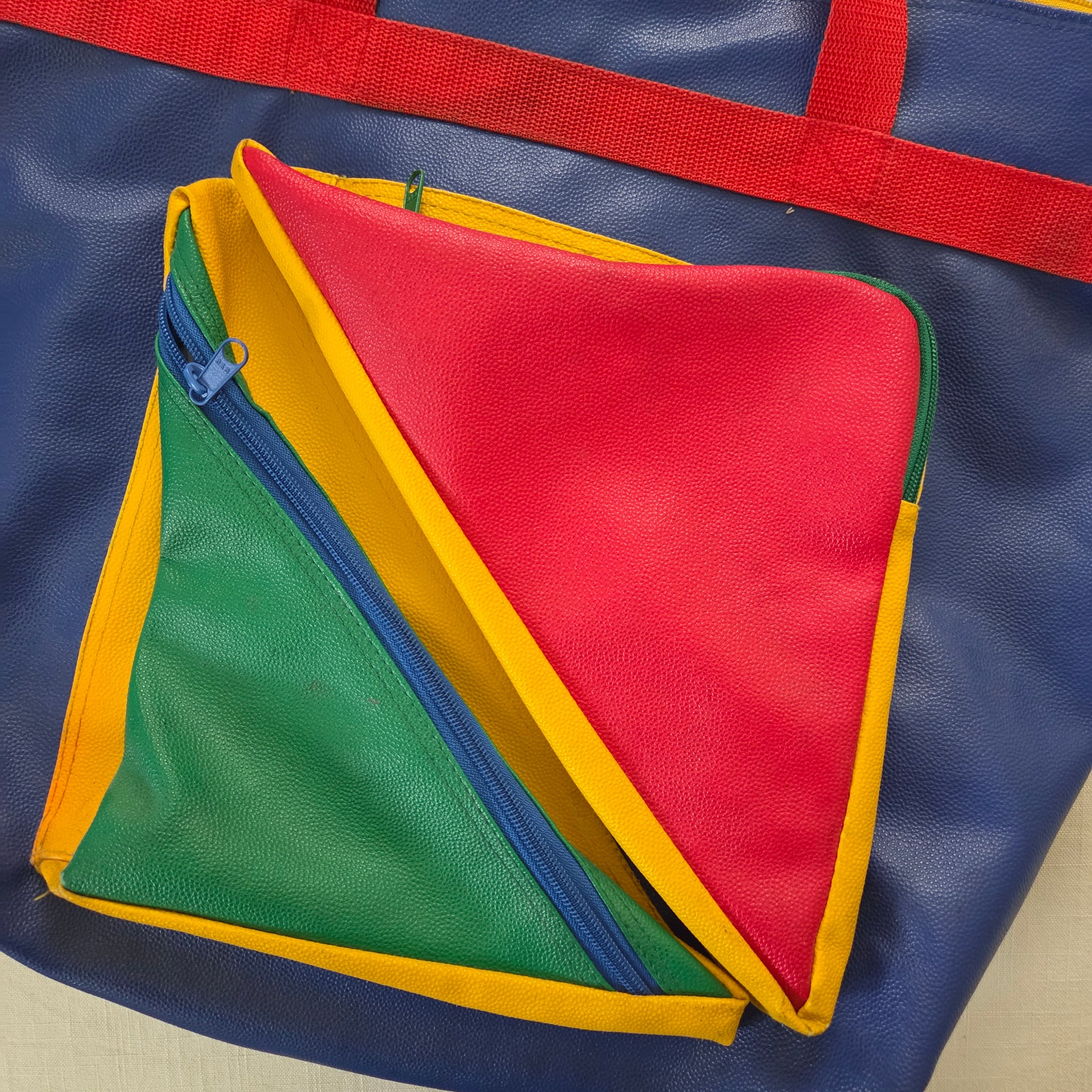 Vintage primary color block shoulder bag that works well for diaper or toddler bag too! Cool zipper pockets on front! Please see all photos for condition and measurements