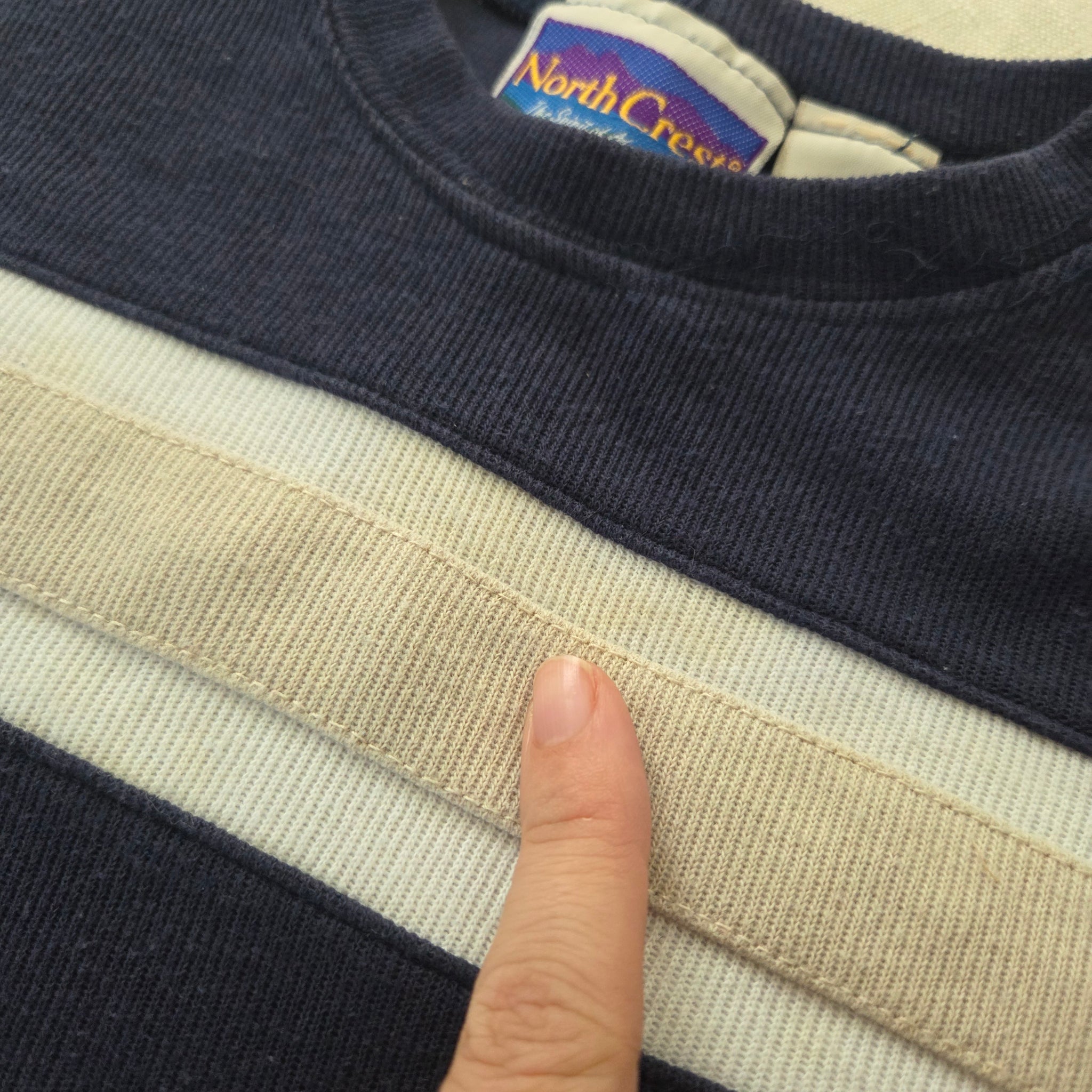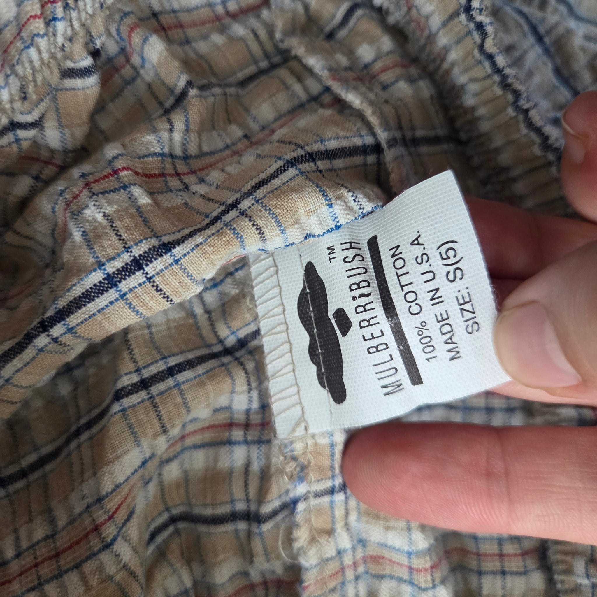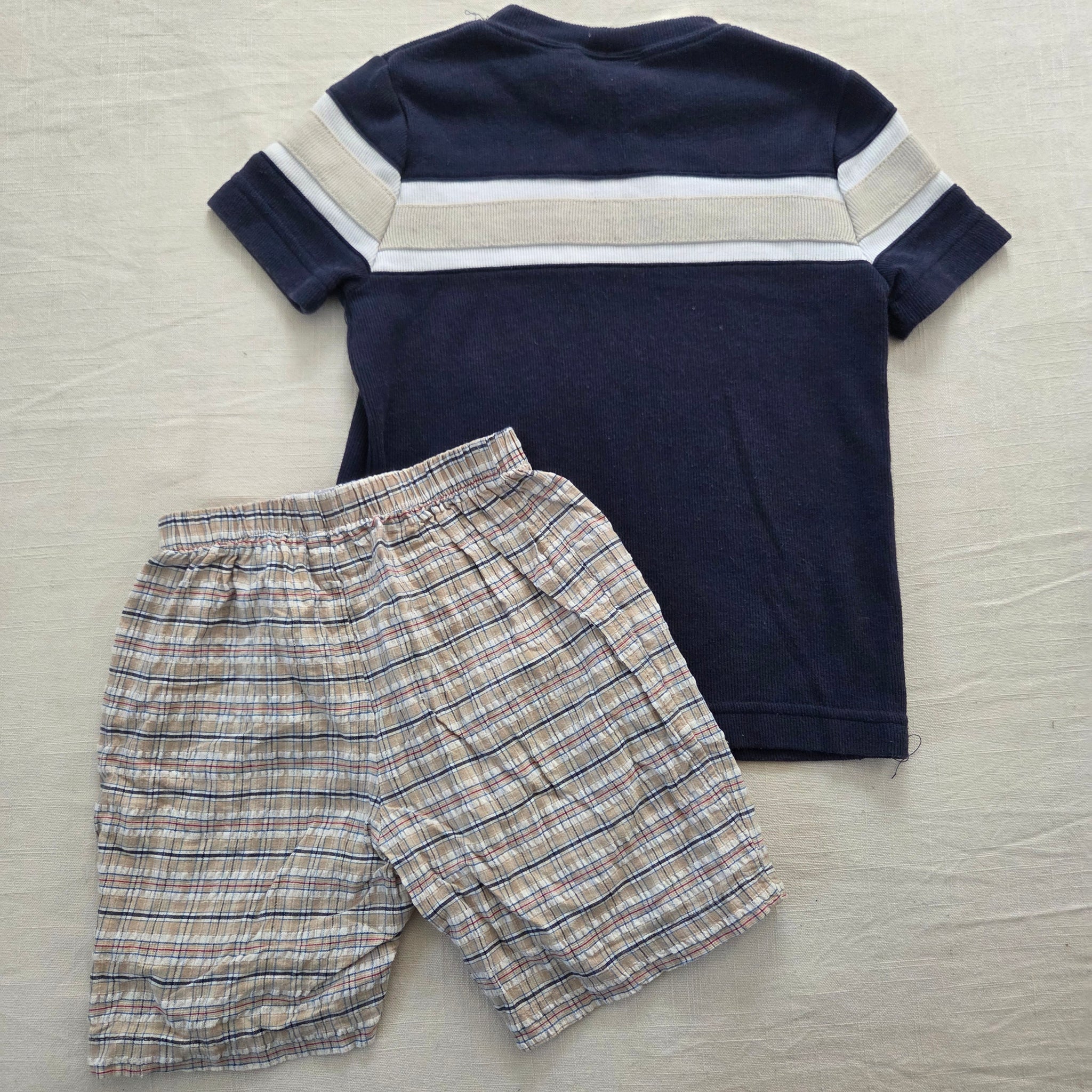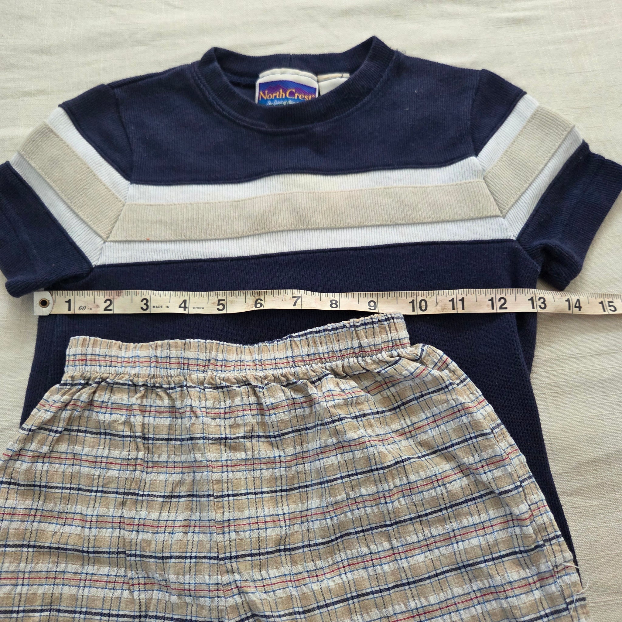Vintage bundle of North Crest navy blue and tan striped shirt and Mulberry Street neutral plaid shorts with stretchy elastic waist! Please see all photos for condition and measurements