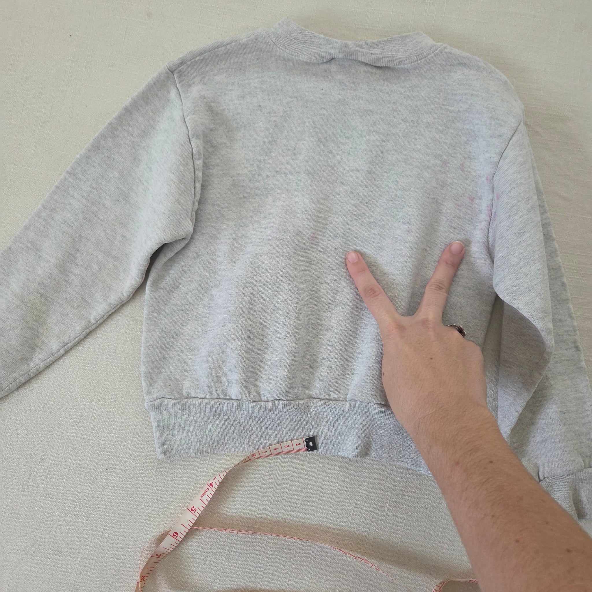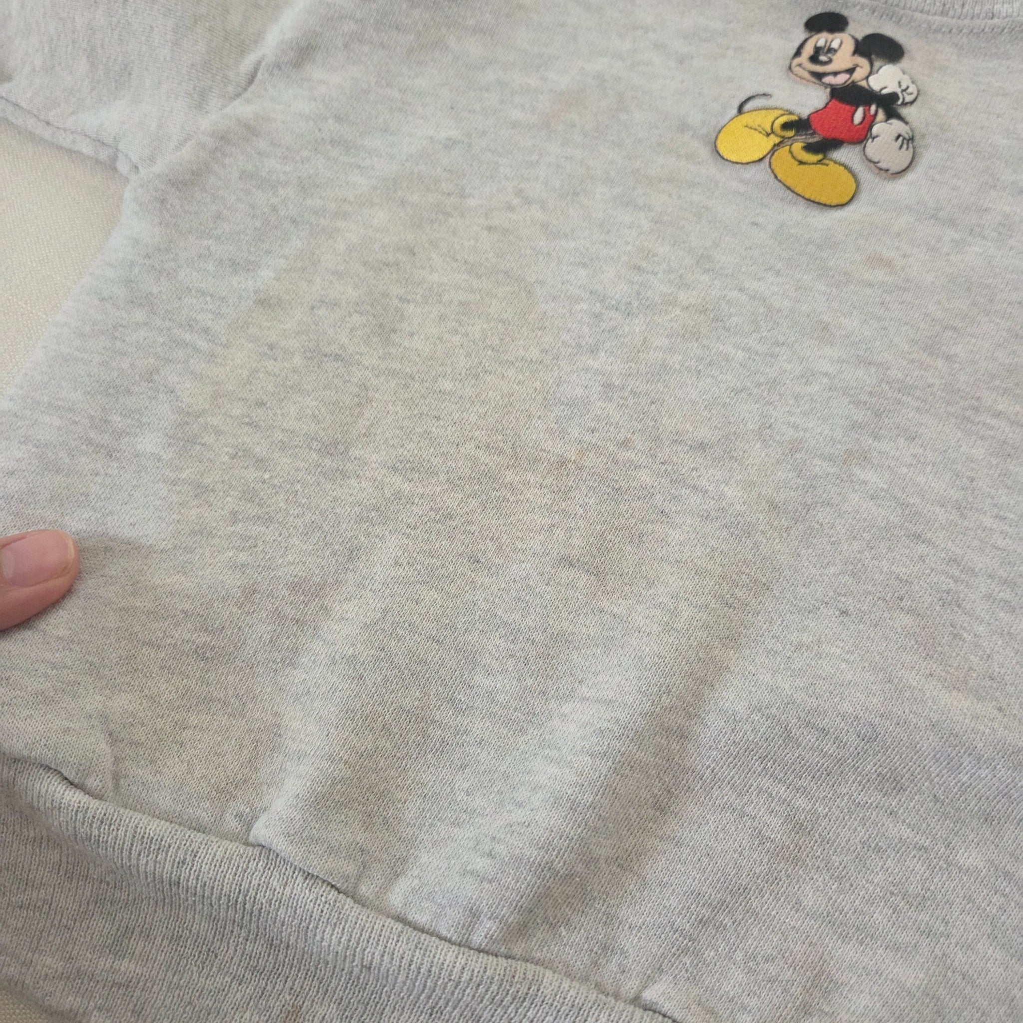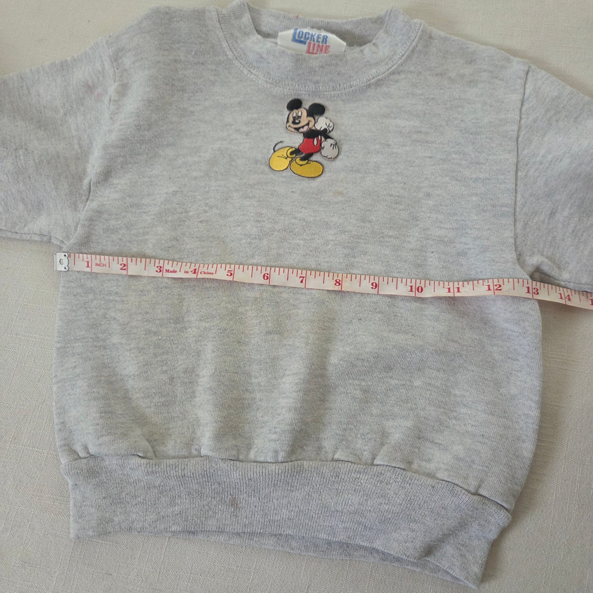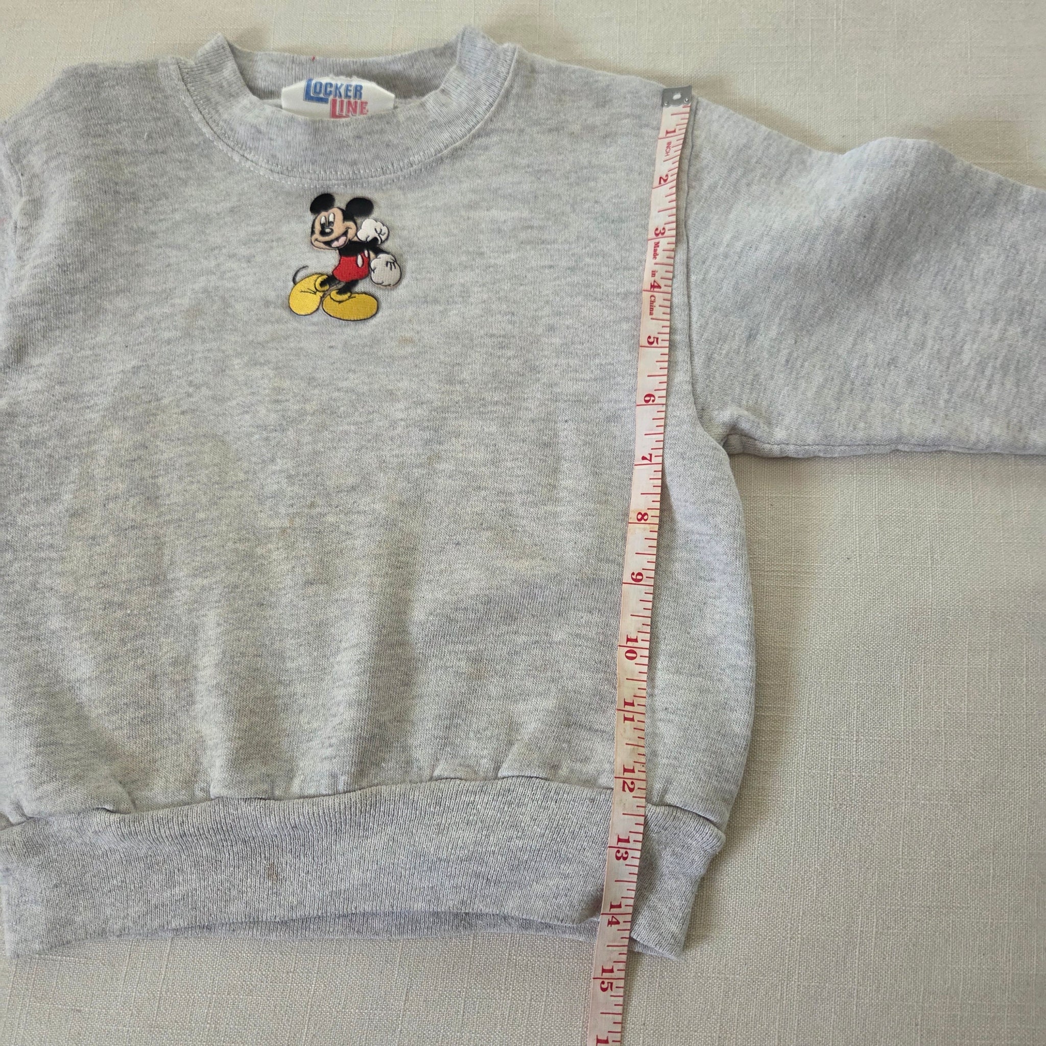 Vintage 90s Locker Line gray pullover sweatshirt with a Mickey Mouse patch! Note two spots on the back. Please see all photos for condition and details