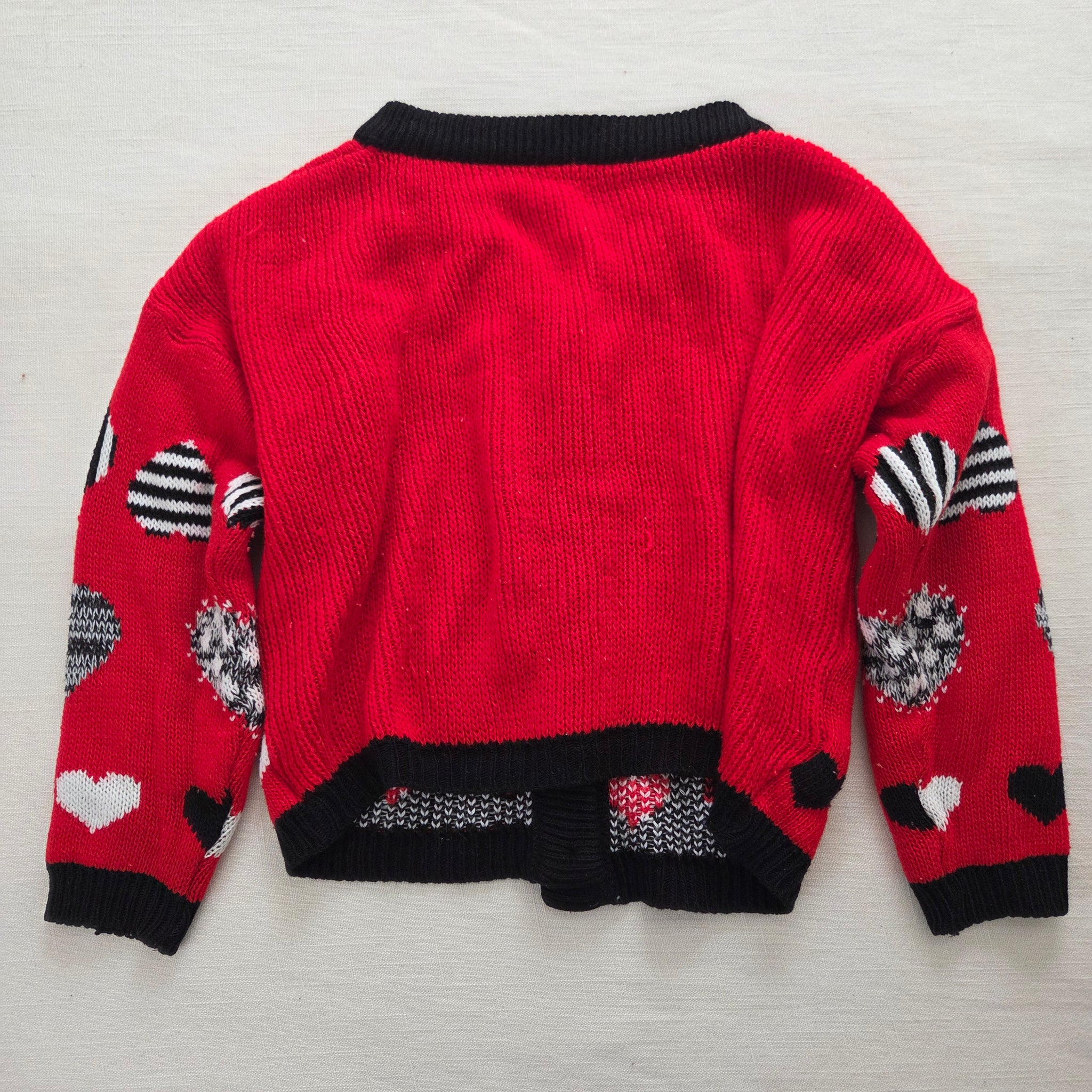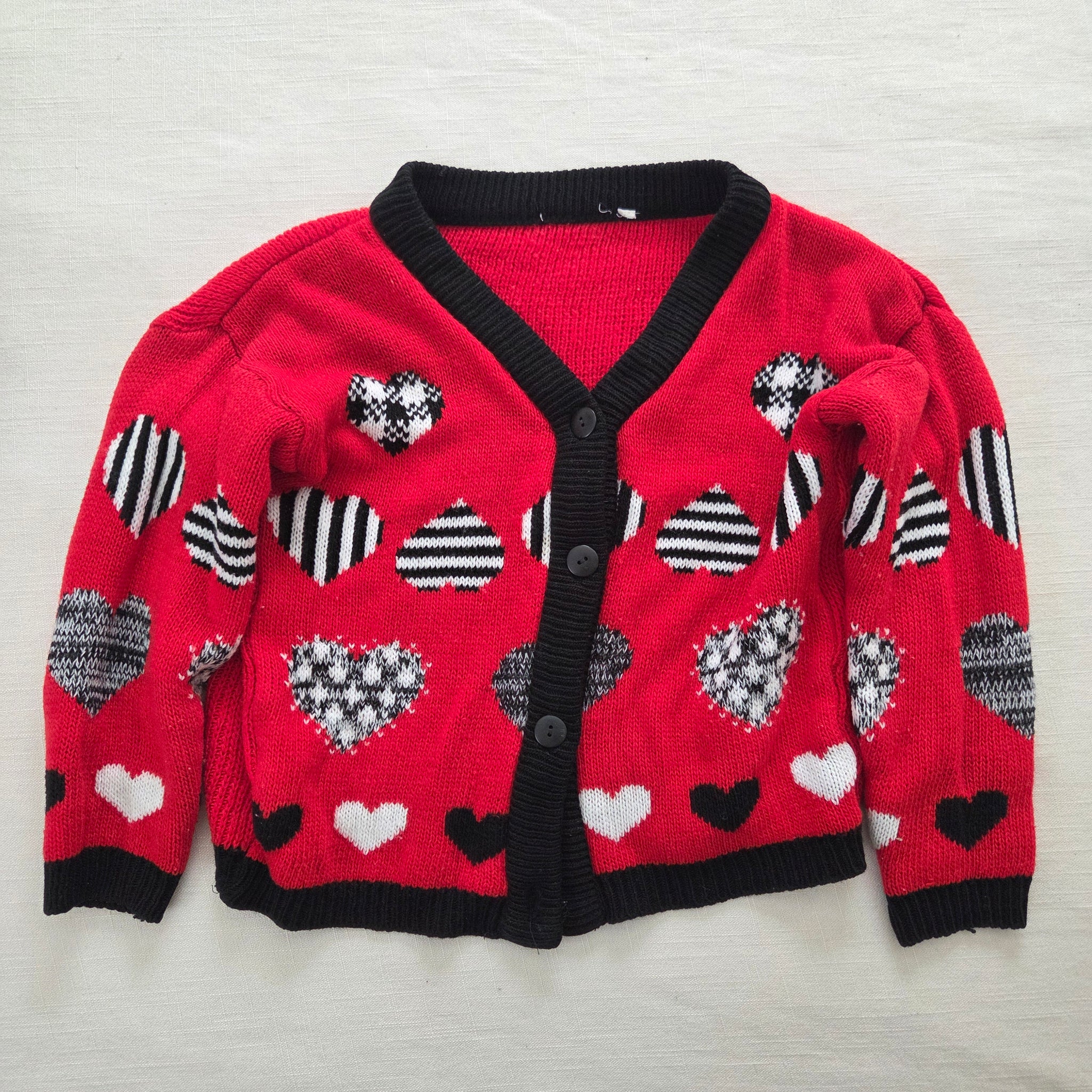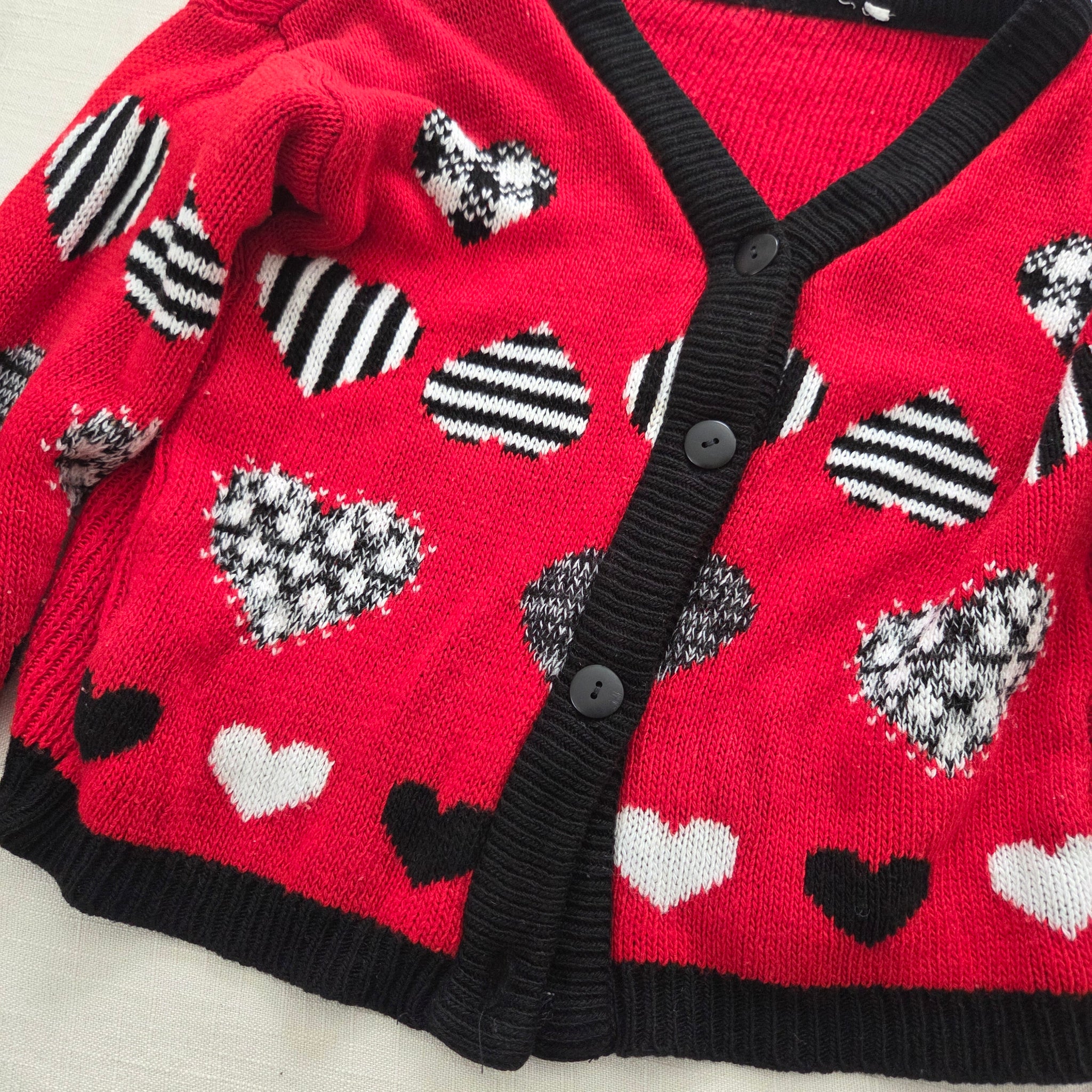 Vintage red knit cardigan sweater with black and white heart details! Tags cut. Please see all photos for condition and measurements