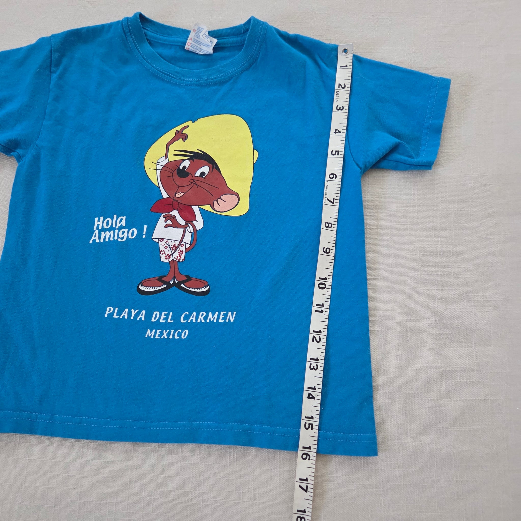 Travel souvenir bright blue tee from Playa Del Carmen, Mexico with Speedy Gonzalez! Note sure of age. Please see all photos for condition and measurements