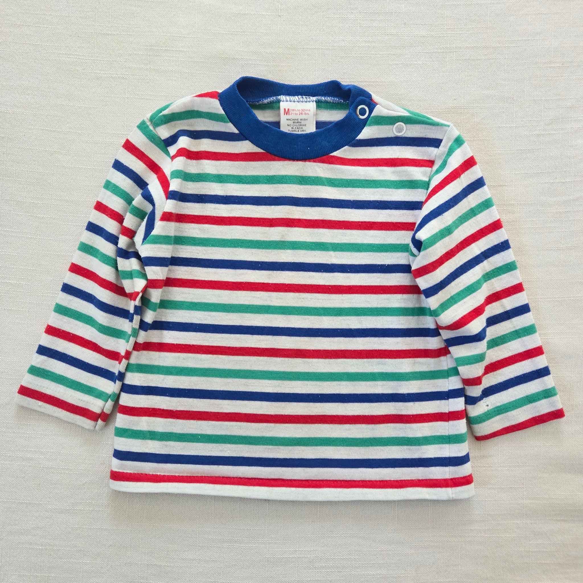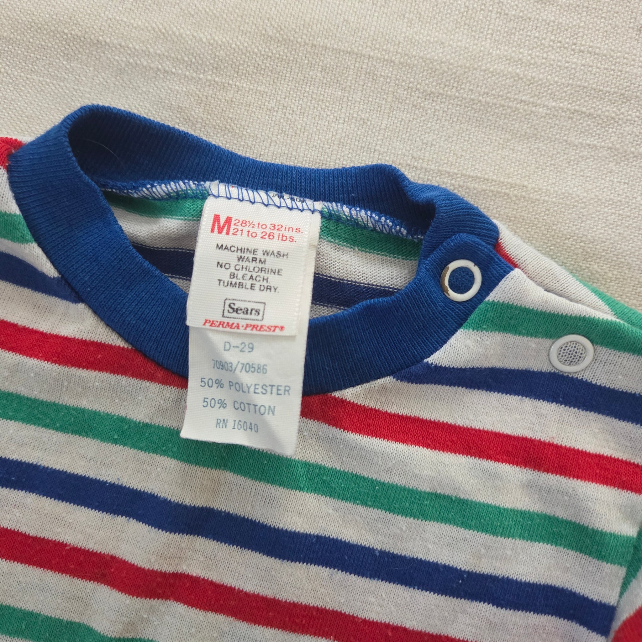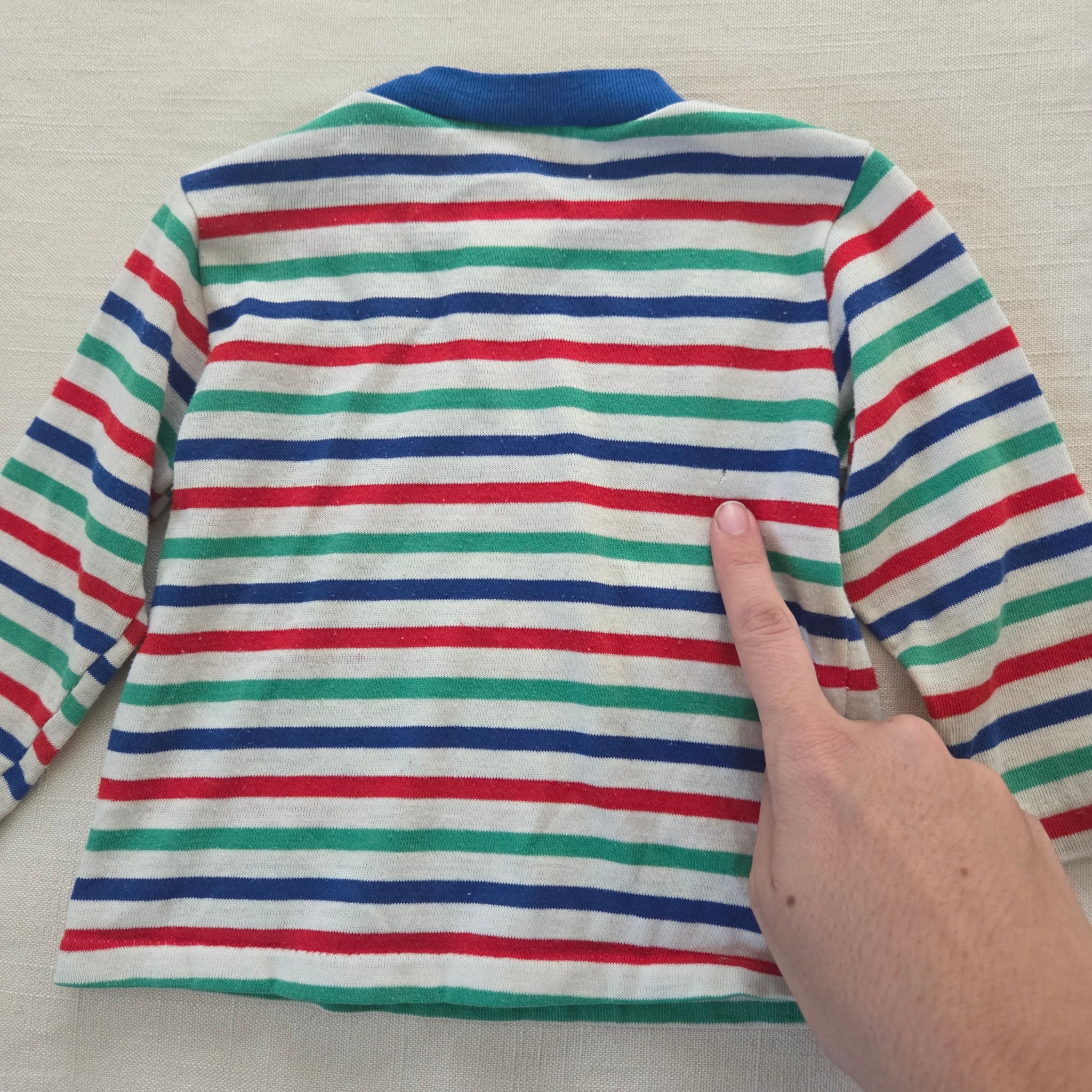 Vintage Sears brand red, green, and blue striped long sleeve shirt! Note one tiny hole on wrist and one on back shown in pics. Please see all photos for condition and measurements