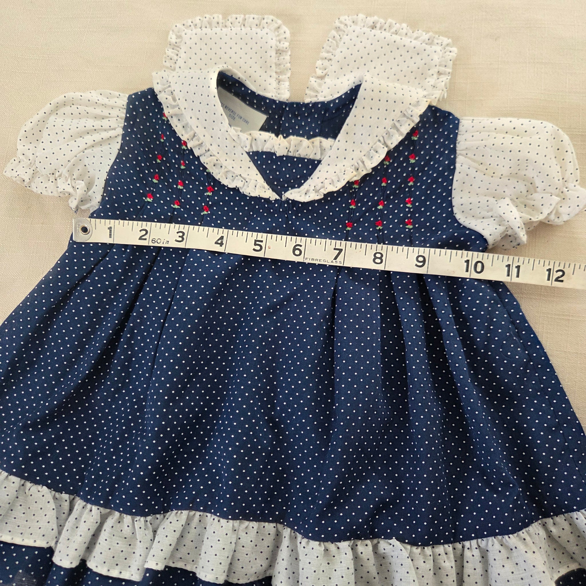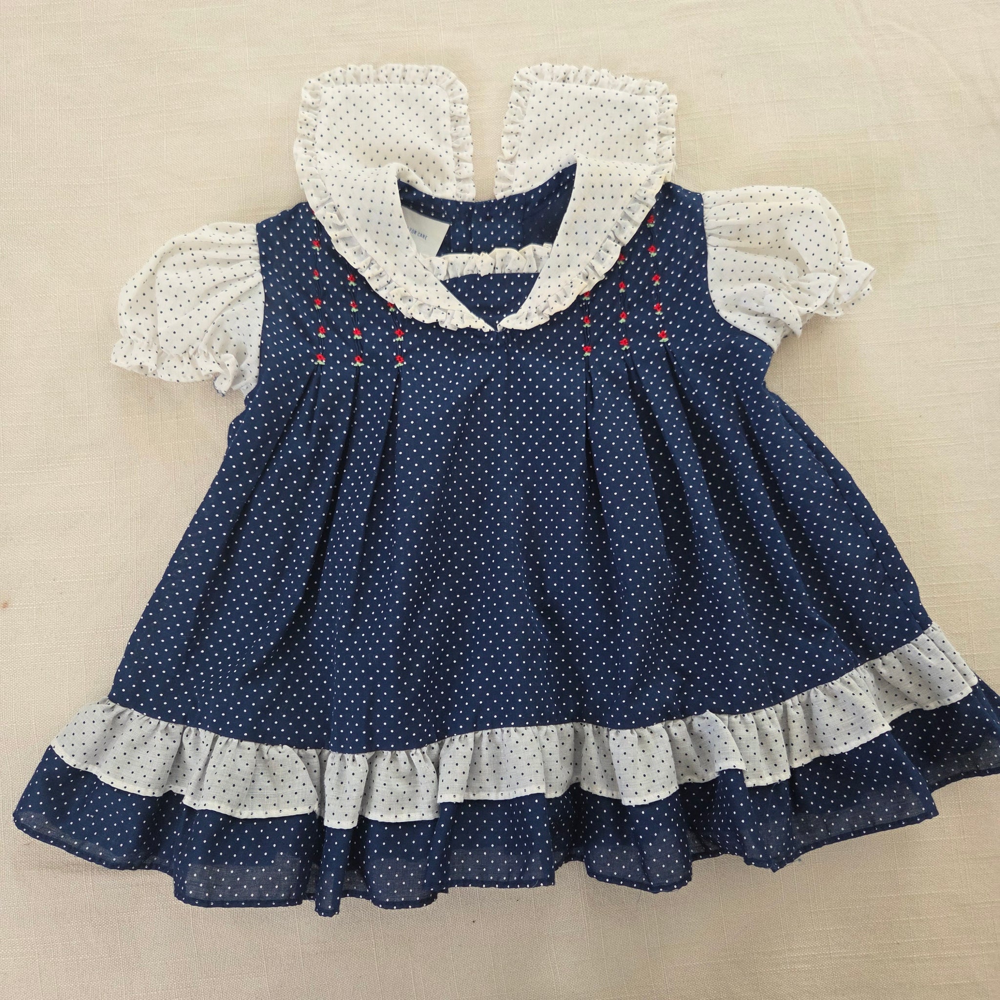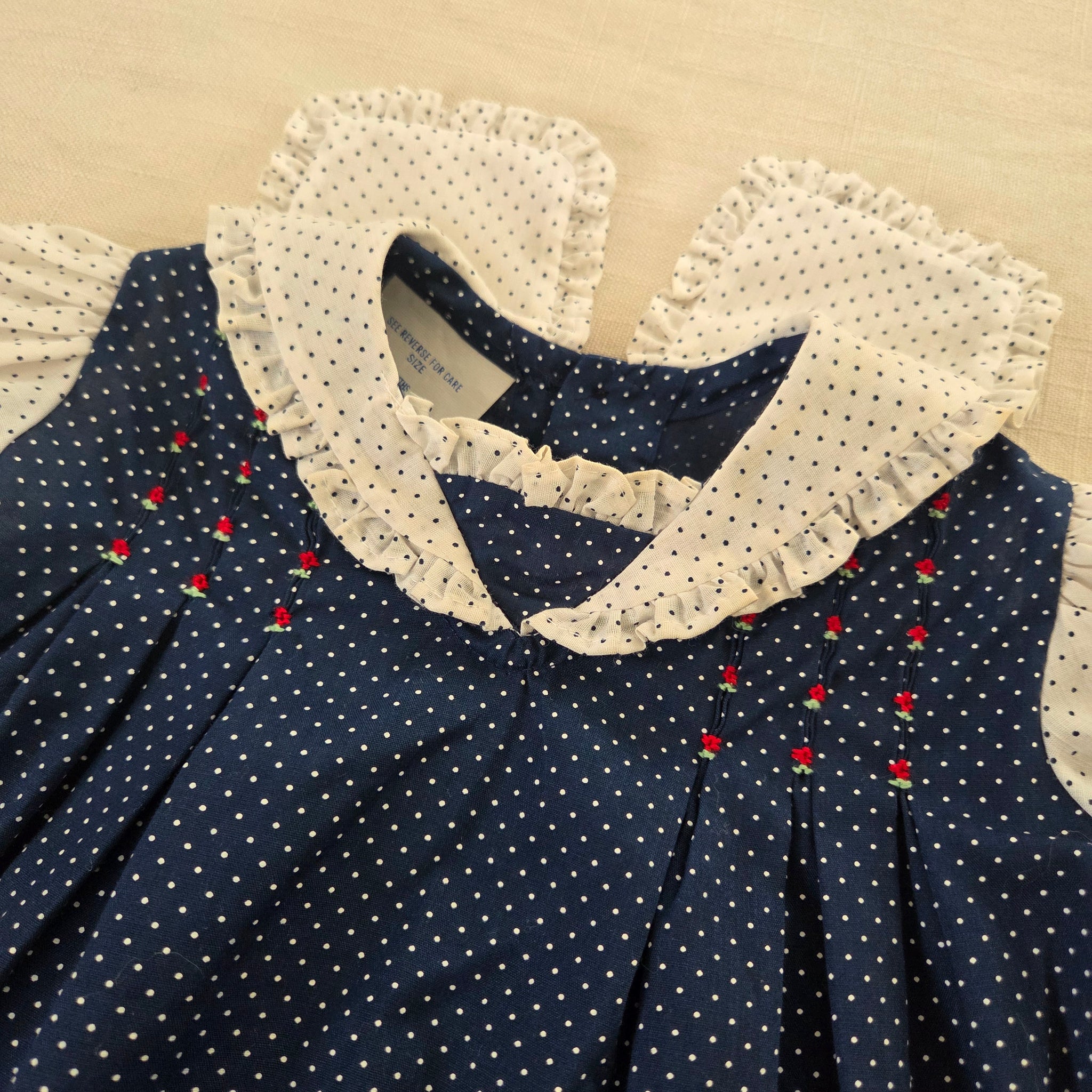 Vintage Polly Flinders brand navy and white dotted dress with pleated floral chest detail! Please see all photos for condition and measurements