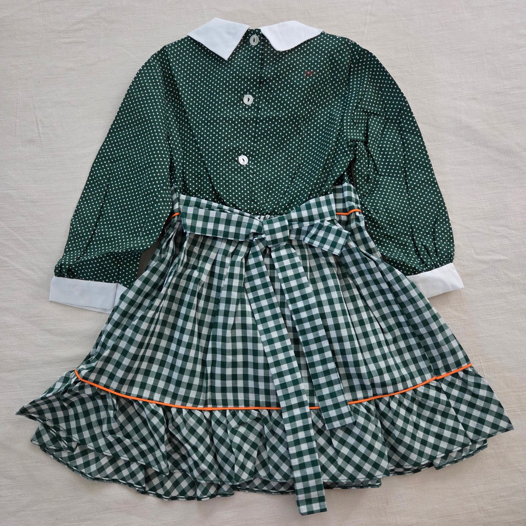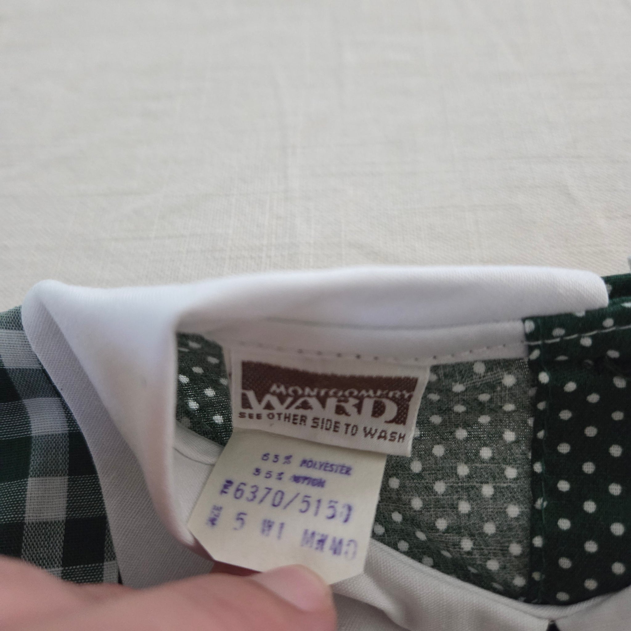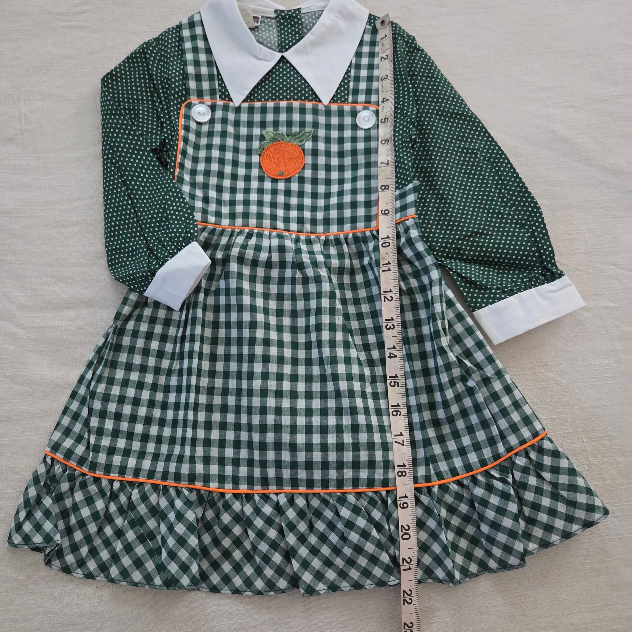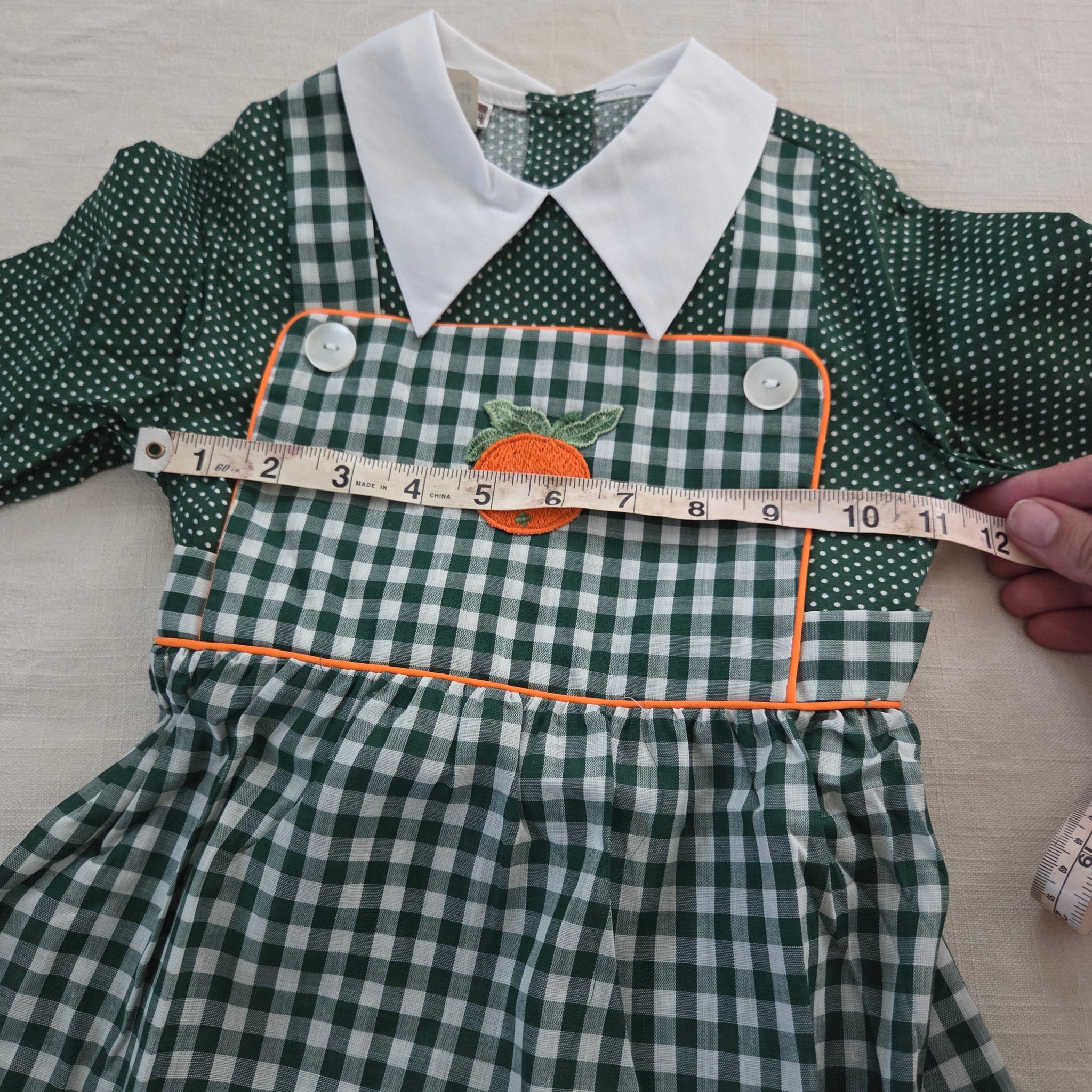 Vintage new without tags Montgomery Ward brand green gingham long sleeve dress with orange on chest and ties in back! Please see all photos for condition and measurements